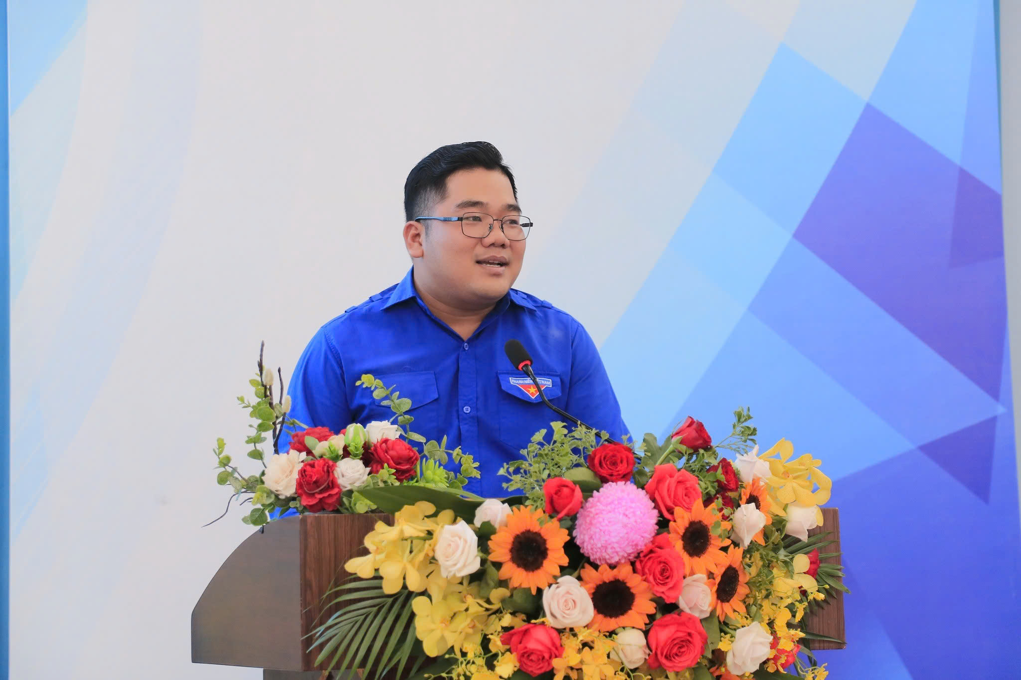 Đ/c Nguyễn Thành Lâm và ThS. Trần Văn Nam trao hoa chúc mừng các đại biểu tham dự Đại hội đại biểu Đoàn TNCS Hồ Chí Minh Thành phố Hồ Chí Minh lần thứ I, nhiệm kỳ 2025–2030
