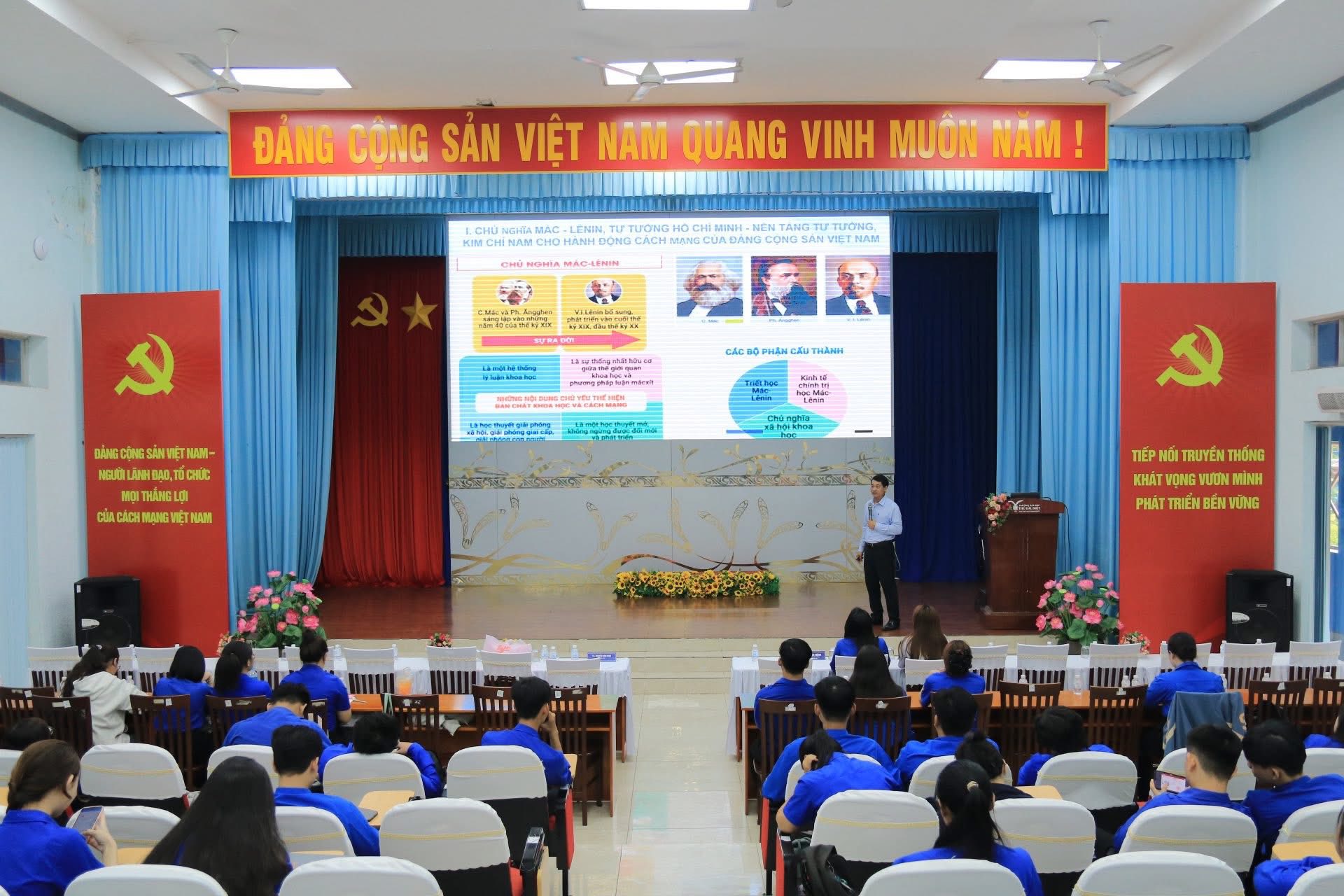 Tham dự chương trình có TS. Nguyễn Văn Linh – Trưởng Bộ môn Lý luận chính trị, Báo cáo viên của lớp học; đ/c Võ Quốc Thắng – Ủy viên Ban Thường vụ Đoàn trường, Chủ tịch Hội Sinh viên Trường; đ/c Cao Kim Nhường – Phó Chủ tịch Hội Sinh viên Trường, cùng đông đảo đoàn viên, thanh niên, sinh viên.