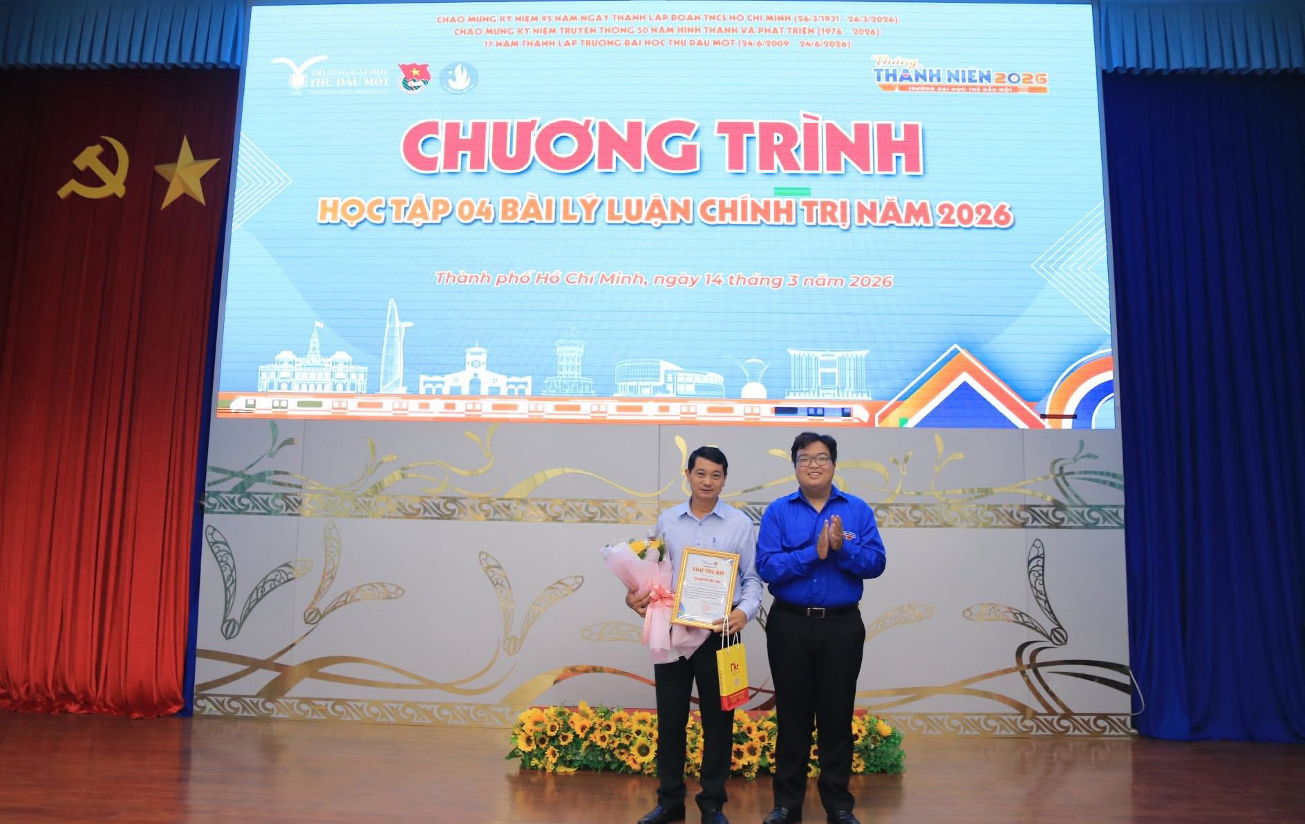 Sáng ngày 14/3/2026, tại Hội trường 2, Đoàn Thanh niên – Hội Sinh viên Trường Đại học Thủ Dầu Một đã tổ chức lễ khai giảng lớp học tập 04 bài lý luận chính trị năm 2026 dành cho đoàn viên, thanh niên, sinh viên trong toàn trường. Chương trình thu hút hơn 200 đoàn viên, thanh niên, sinh viên tham gia học tập, thể hiện tinh thần nghiêm túc trong việc bồi dưỡng nhận thức chính trị và nâng cao hiểu biết về lý luận của tuổi trẻ nhà trường.