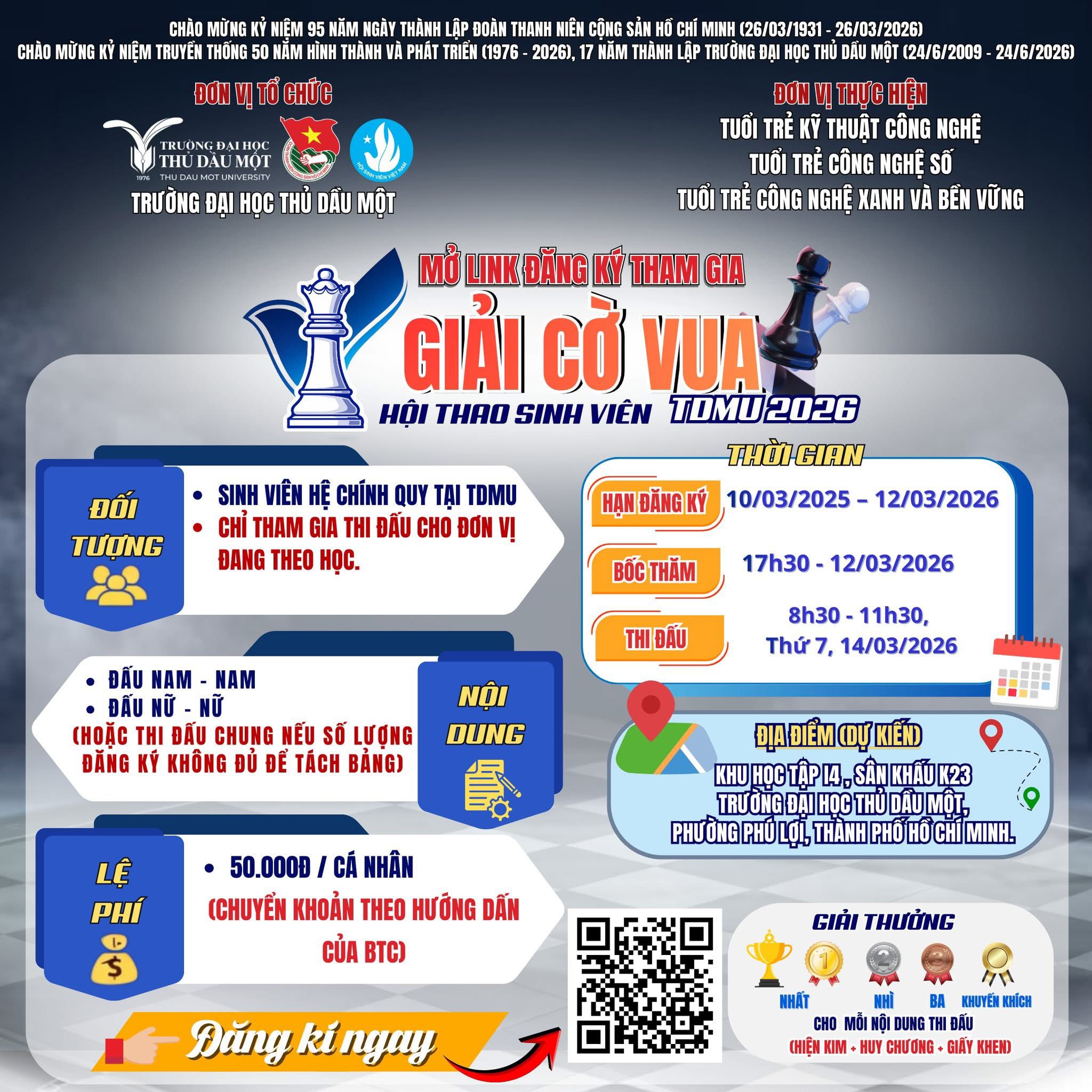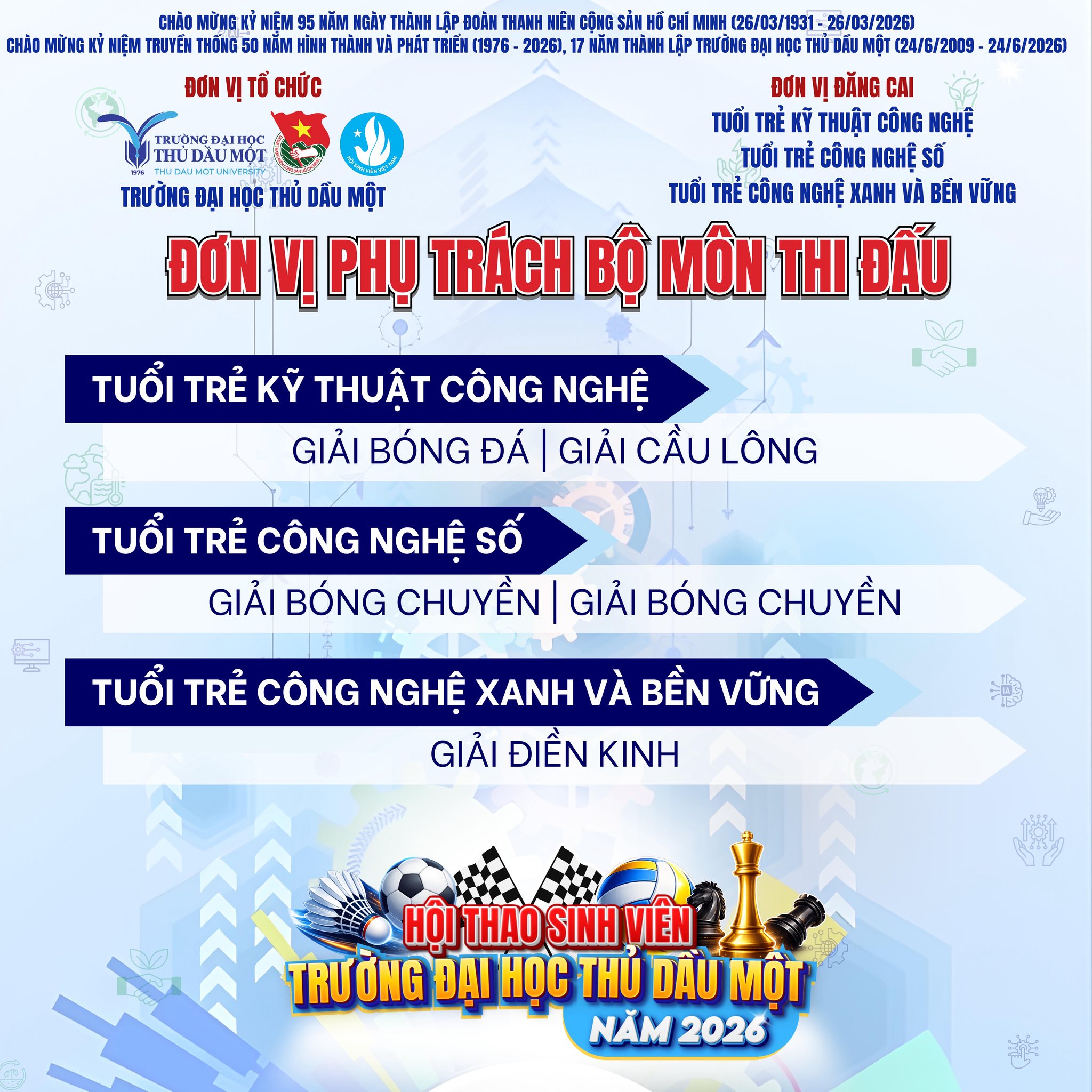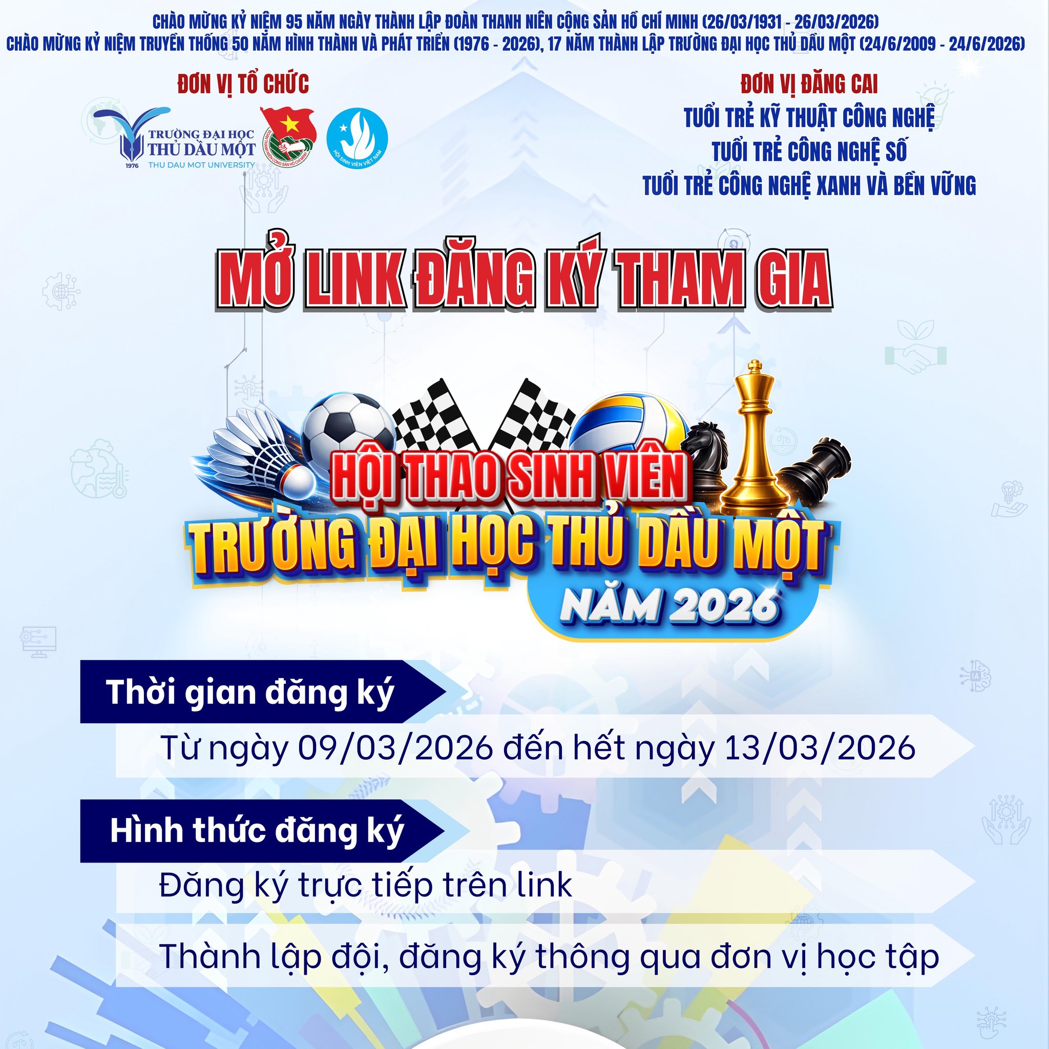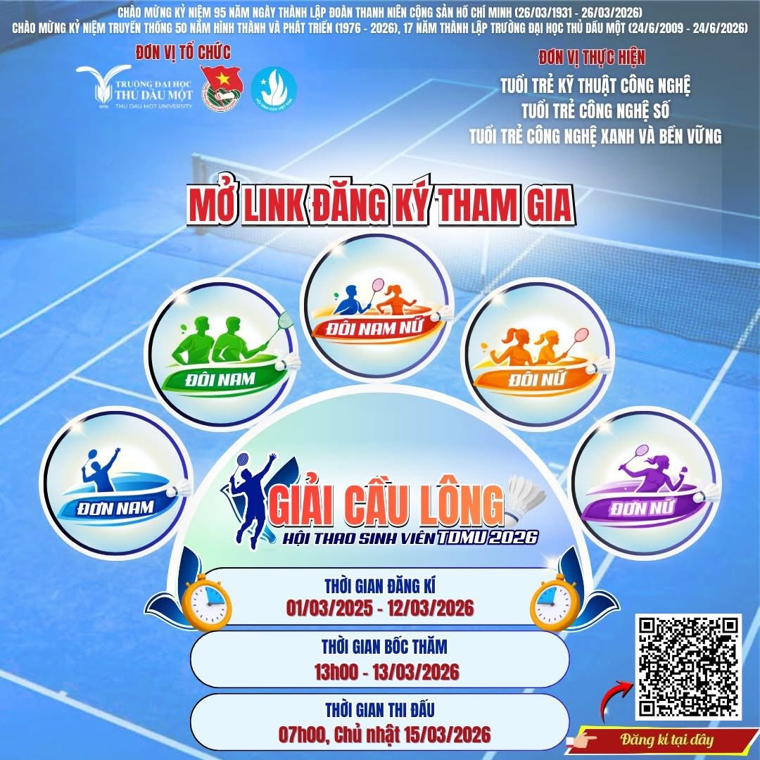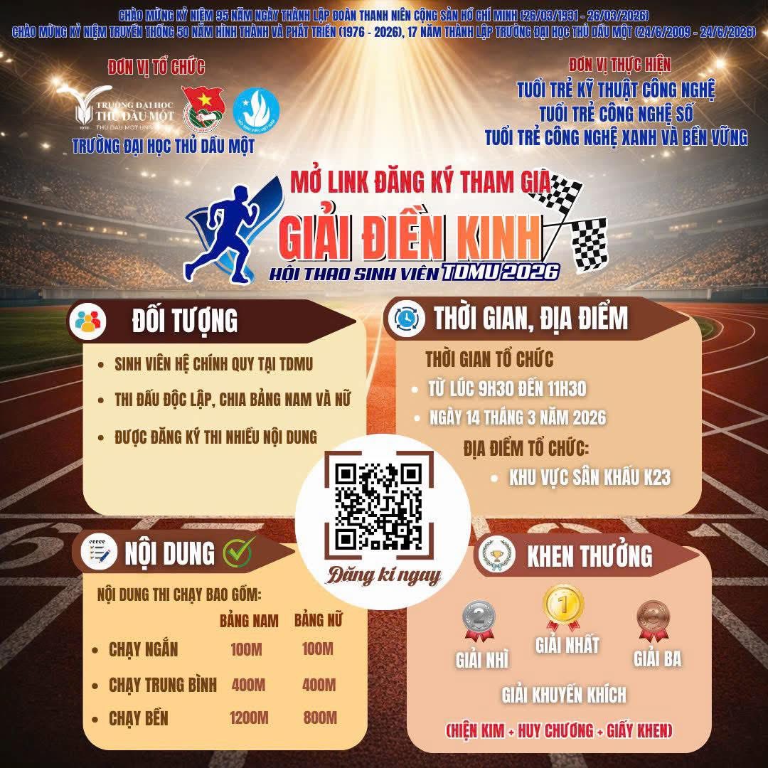 Nhằm chào mừng kỷ niệm 95 năm Ngày thành lập Đoàn TNCS Hồ Chí Minh (26/3/1931 – 26/3/2026) và các dấu mốc lịch sử ý nghĩa của Trường Đại học Thủ Dầu Một, Hội thao Sinh viên năm 2026 chính thức mở link đăng ký dành cho sinh viên toàn trường tham gia tranh tài.