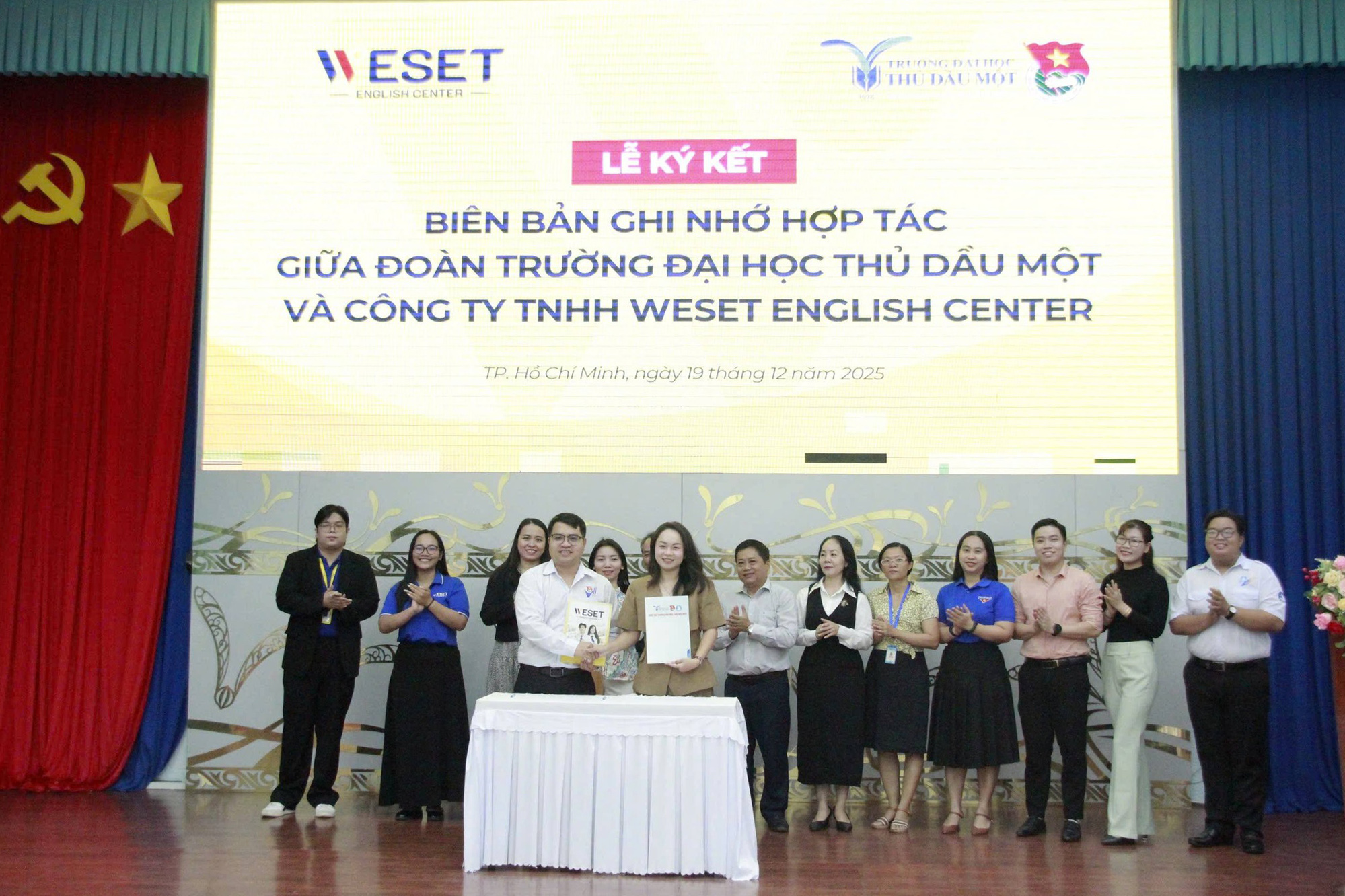 Trong khuôn khổ Workshop “Từ Tự ti đến Tự tin tiếng Anh” được tổ chức vào sáng ngày 19/12/2025 tại Trường Đại học Thủ Dầu Một, Đoàn Thanh niên Trường đã phối hợp cùng Công ty TNHH Weset English Center thực hiện lễ ký kết bản ghi nhớ hợp tác (MOU).