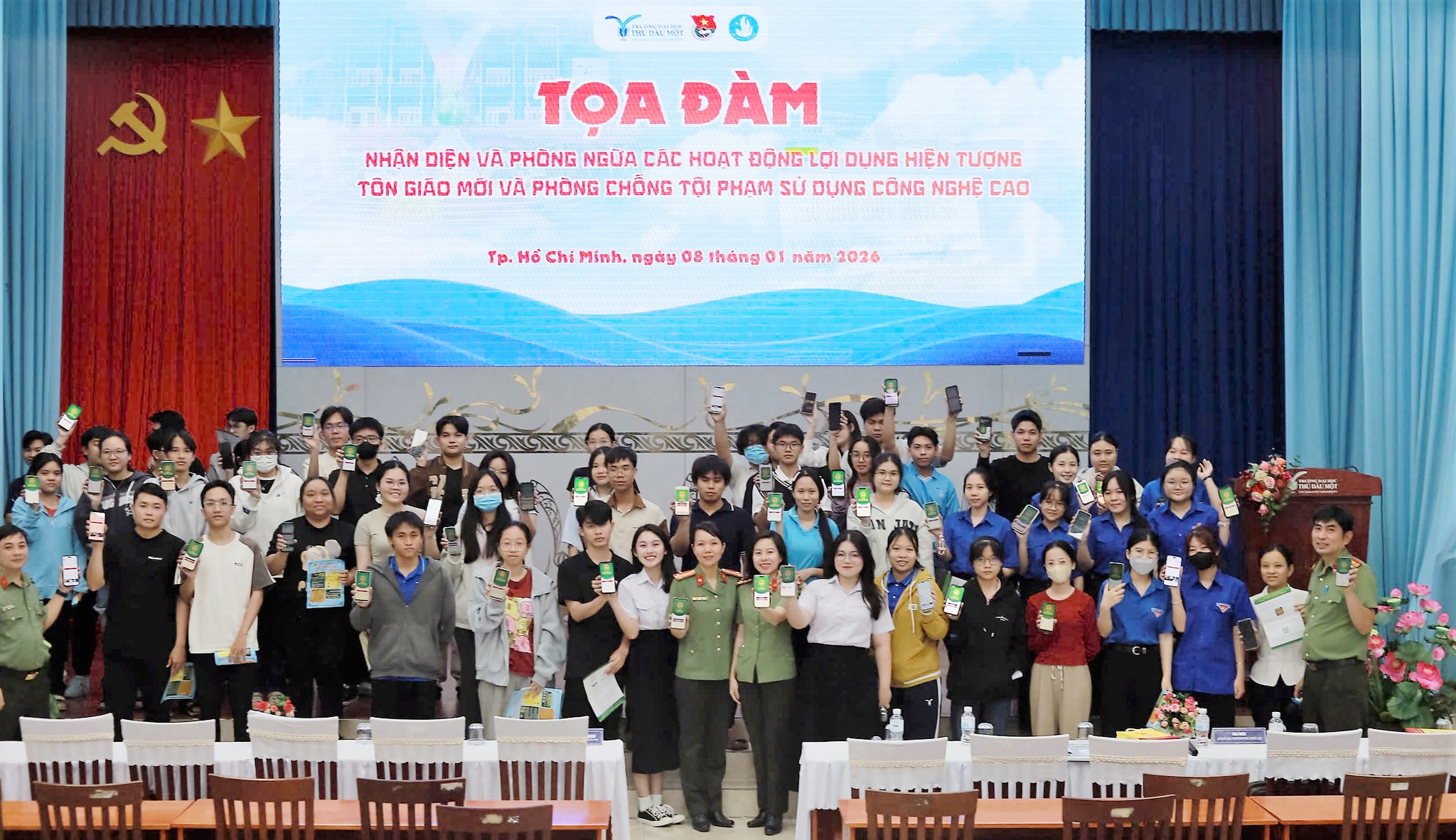Chiều ngày 08/01/2026, Hội Sinh viên Trường Đại học Thủ Dầu Một đã tổ chức tọa đàm với chủ đề “Nhận diện và phòng ngừa các hoạt động lợi dụng hiện tượng tôn giáo mới và phòng chống tội phạm sử dụng công nghệ cao”. Chương trình nhằm trang bị cho đoàn viên, sinh viên những kiến thức cơ bản, kỹ năng cần thiết để chủ động nhận diện, phòng ngừa và ứng phó trước các nguy cơ tiềm ẩn trong bối cảnh chuyển đổi số mạnh mẽ và hội nhập quốc tế ngày càng sâu rộng.