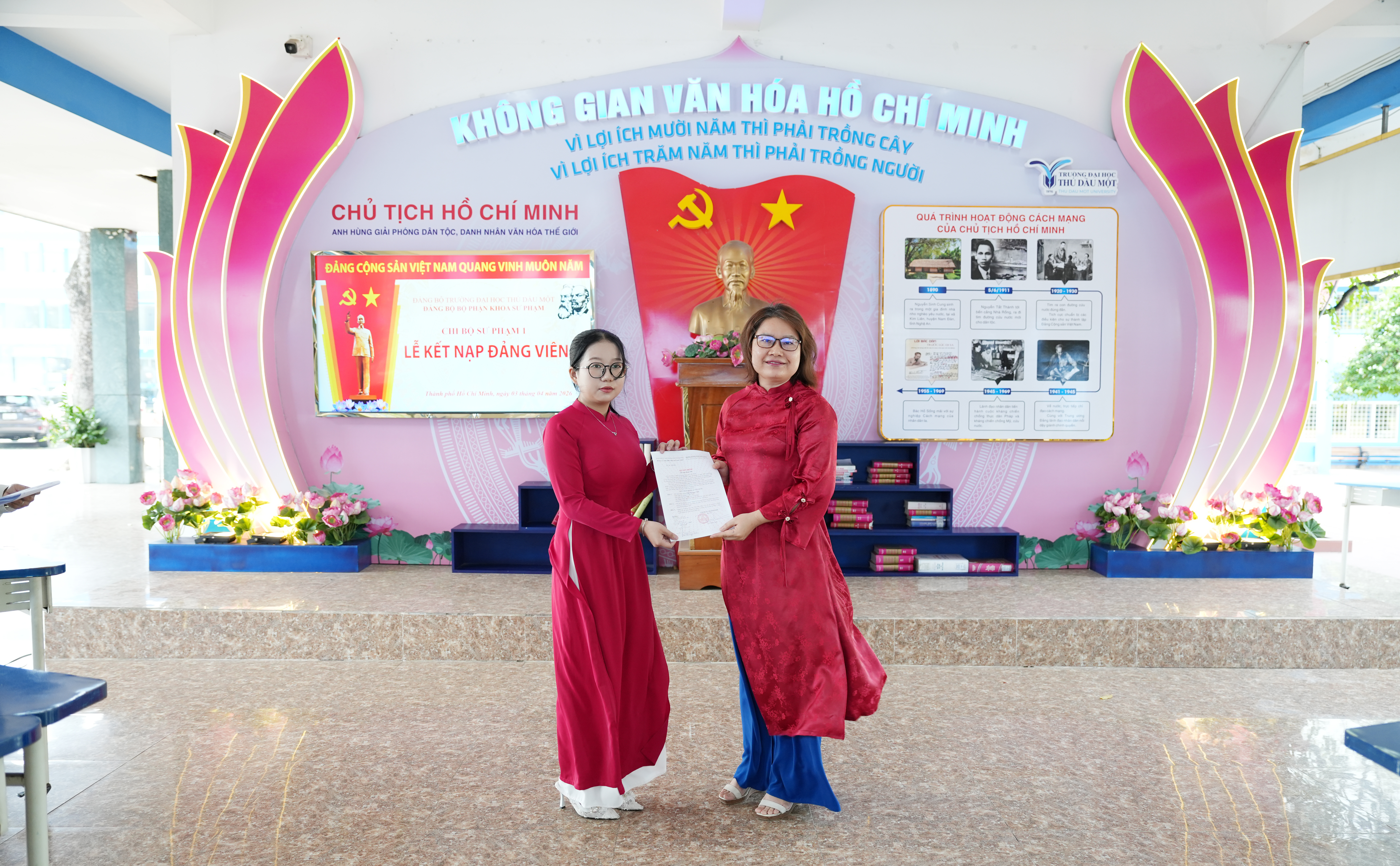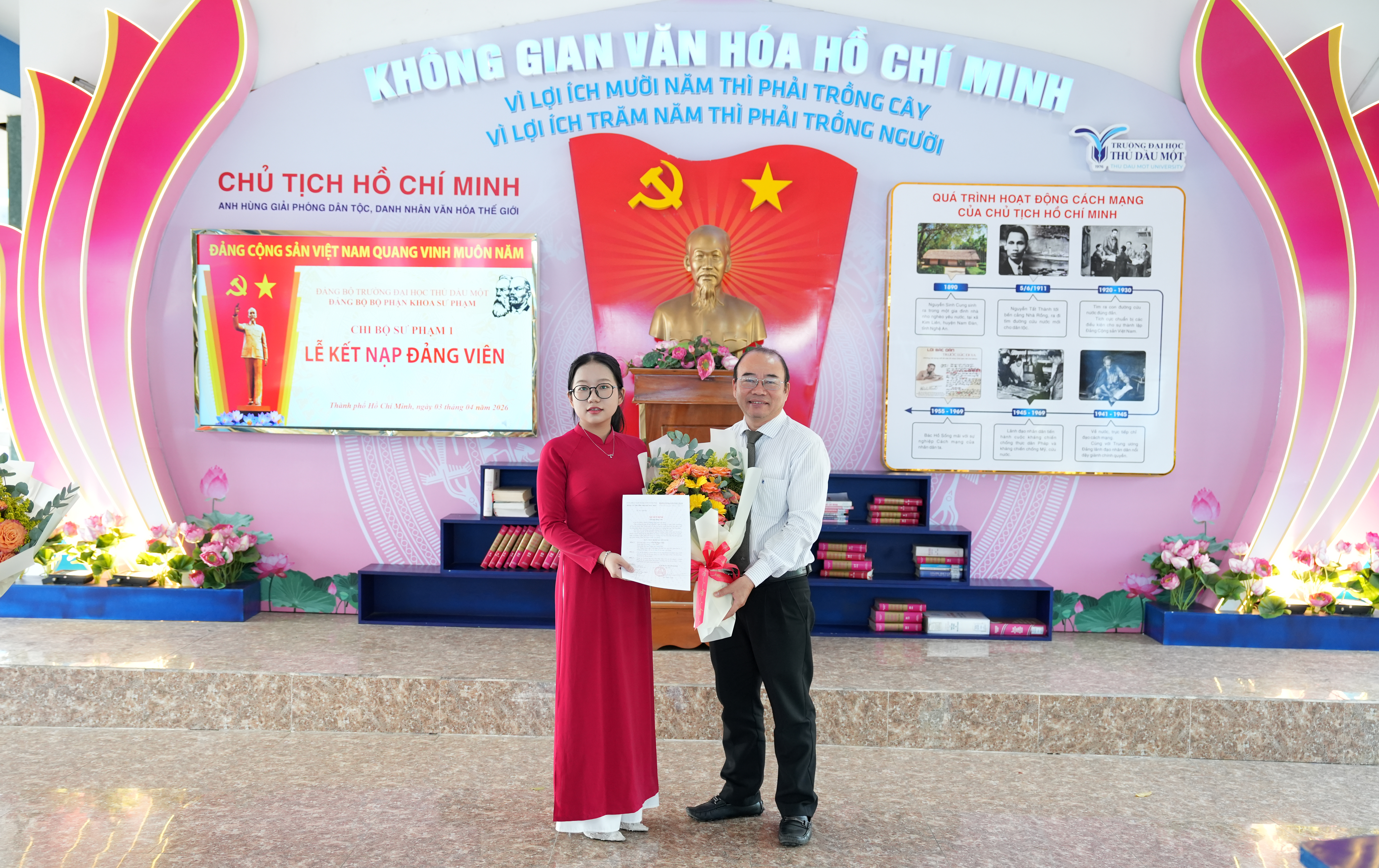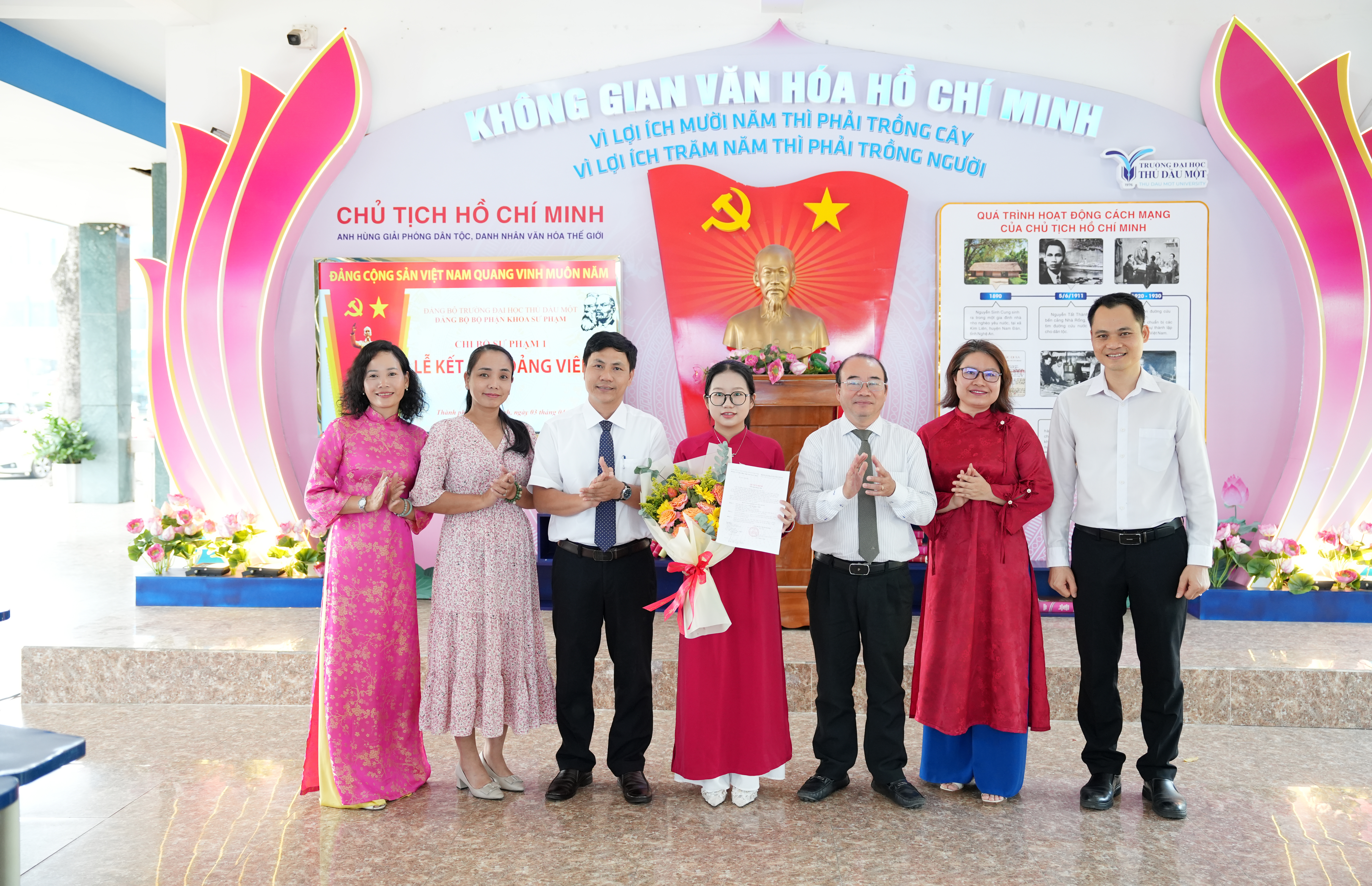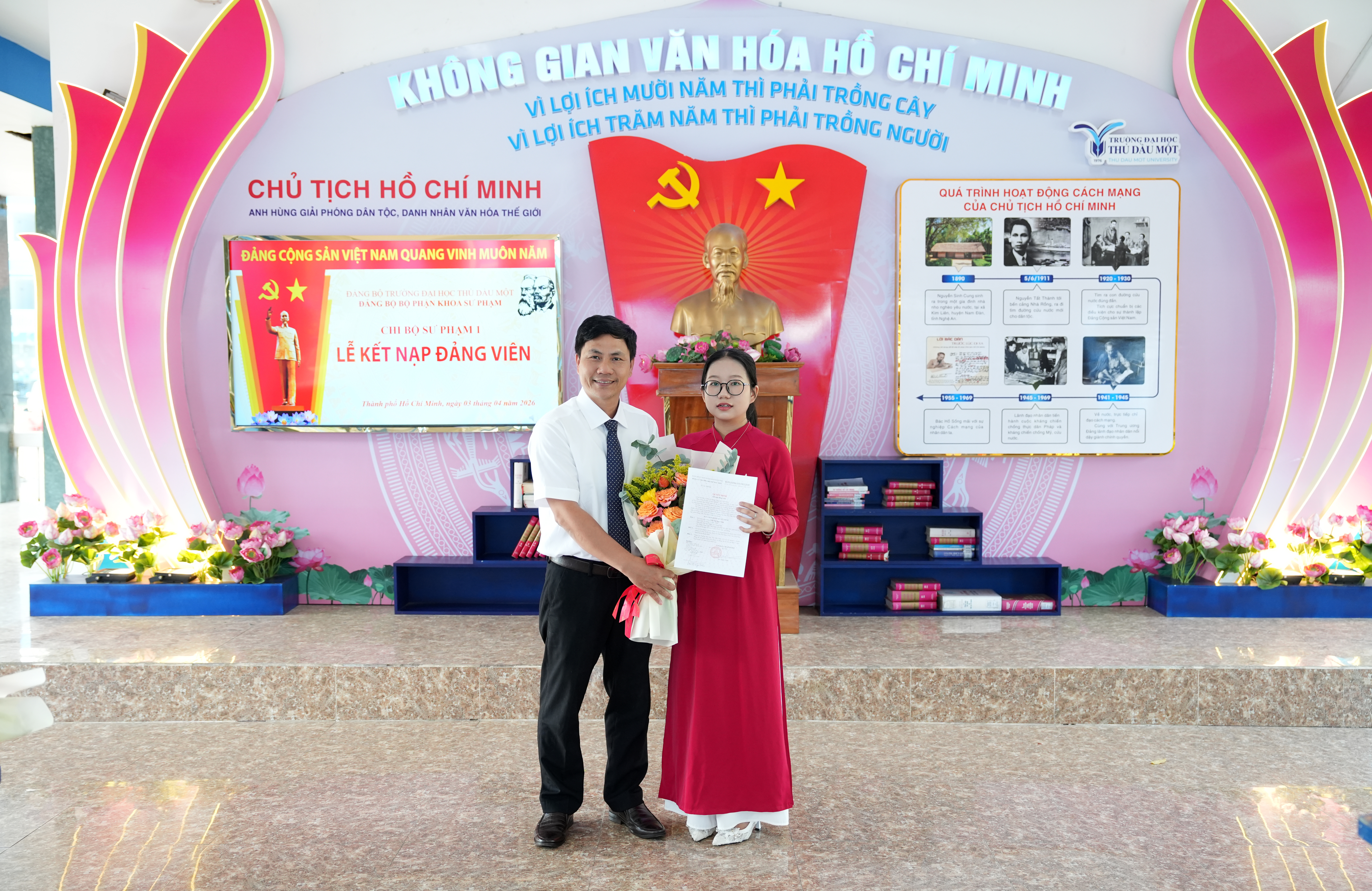 Tại buổi lễ, trước cờ Đảng, cờ Tổ quốc và chân dung Chủ tịch Hồ Chí Minh, đảng viên mới Trần Thị Ngọc Châu đã tuyên thệ, thể hiện quyết tâm tuyệt đối trung thành với mục tiêu, lý tưởng của Đảng, nghiêm túc thực hiện nhiệm vụ của người đảng viên, tiếp tục nỗ lực học tập, rèn luyện và cống hiến. Trao quyết định kết nạp và phát biểu giao nhiệm vụ cho các đảng viên mới, đồng chí Võ Thị Ngọc Trâm – Bí thư Chi bộ nhấn mạnh, đây là vinh dự không chỉ riêng bản thân của mỗi đồng chí, của gia đình mà còn của Chi bộ Sư phạm 1 và Đảng bộ trường Đại học Thủ Dầu Một. Đ/c Ngọc Trâm đề nghị, trong thời gian tới, các đảng viên mới cần tiếp tục phấn đấu, rèn luyện mà trước mắt là đảm bảo học tập tốt, trưởng thành hơn về mặt lý tưởng, phát huy tính tiên phong gương mẫu, thể hiện nhiệt huyết, ý chí vươn lên của thế hệ trẻ; thực hiện tốt nhiệm vụ của người Đảng viên để góp phần xây dựng Đảng ngày càng vững mạnh.