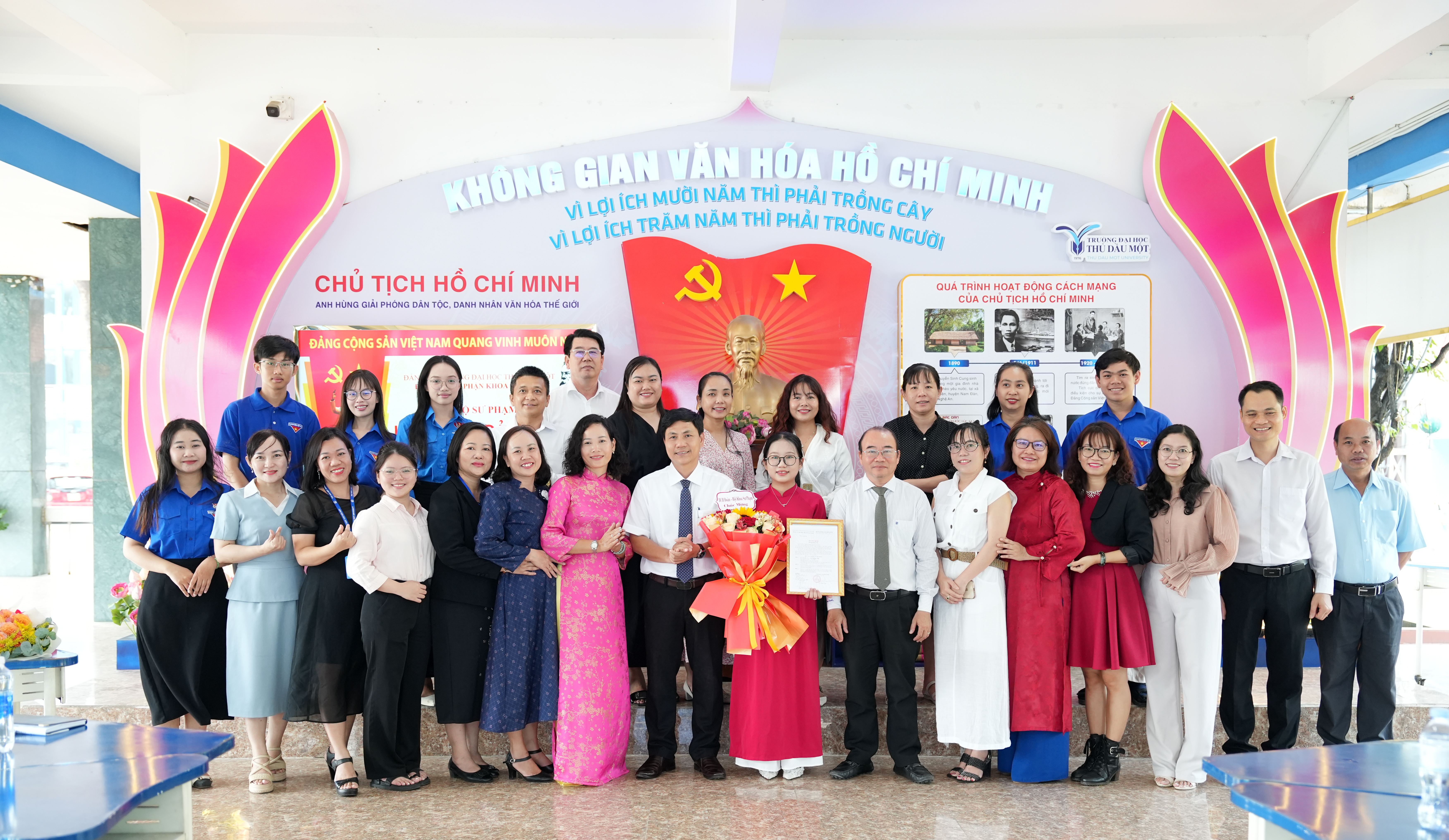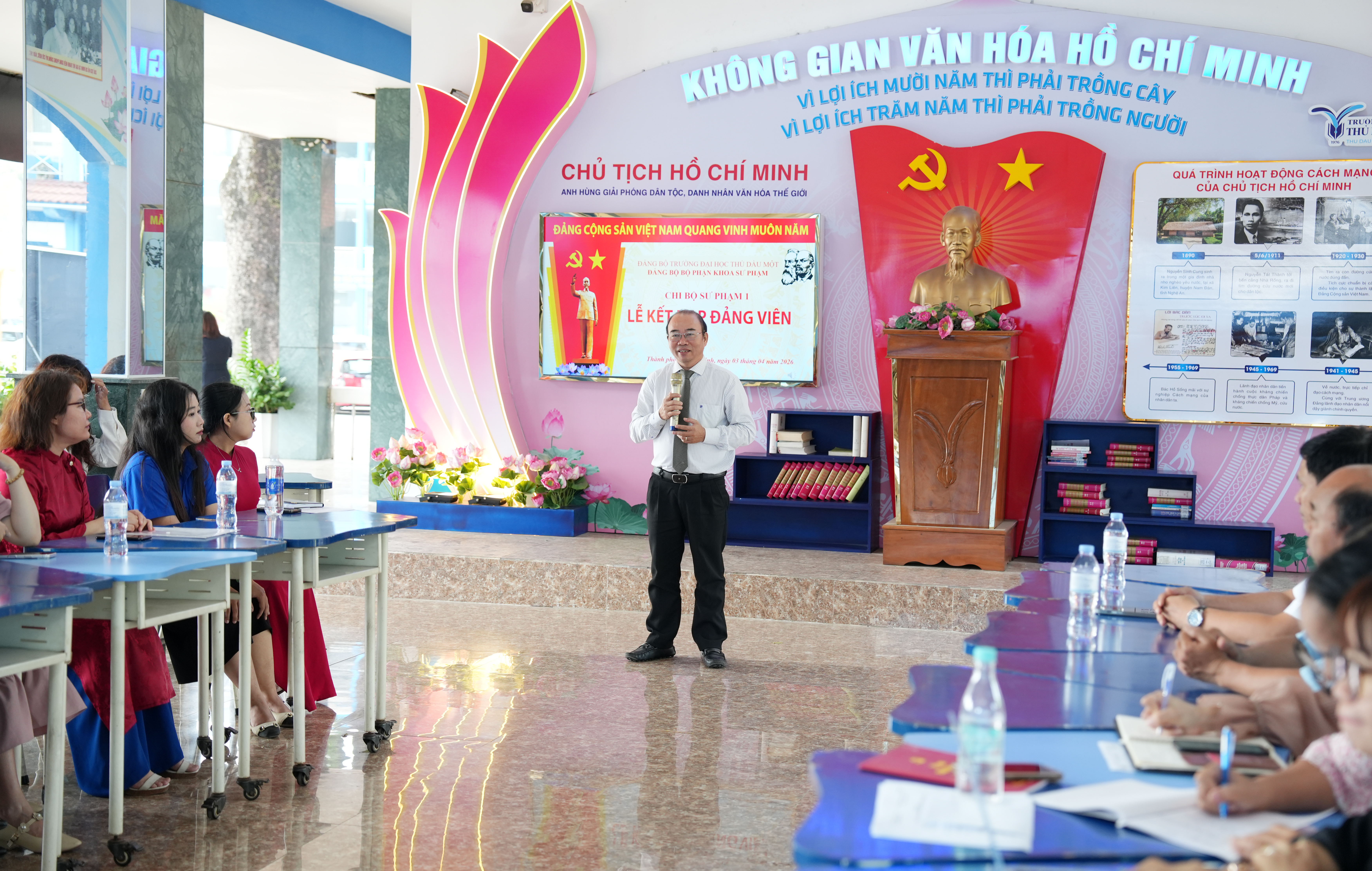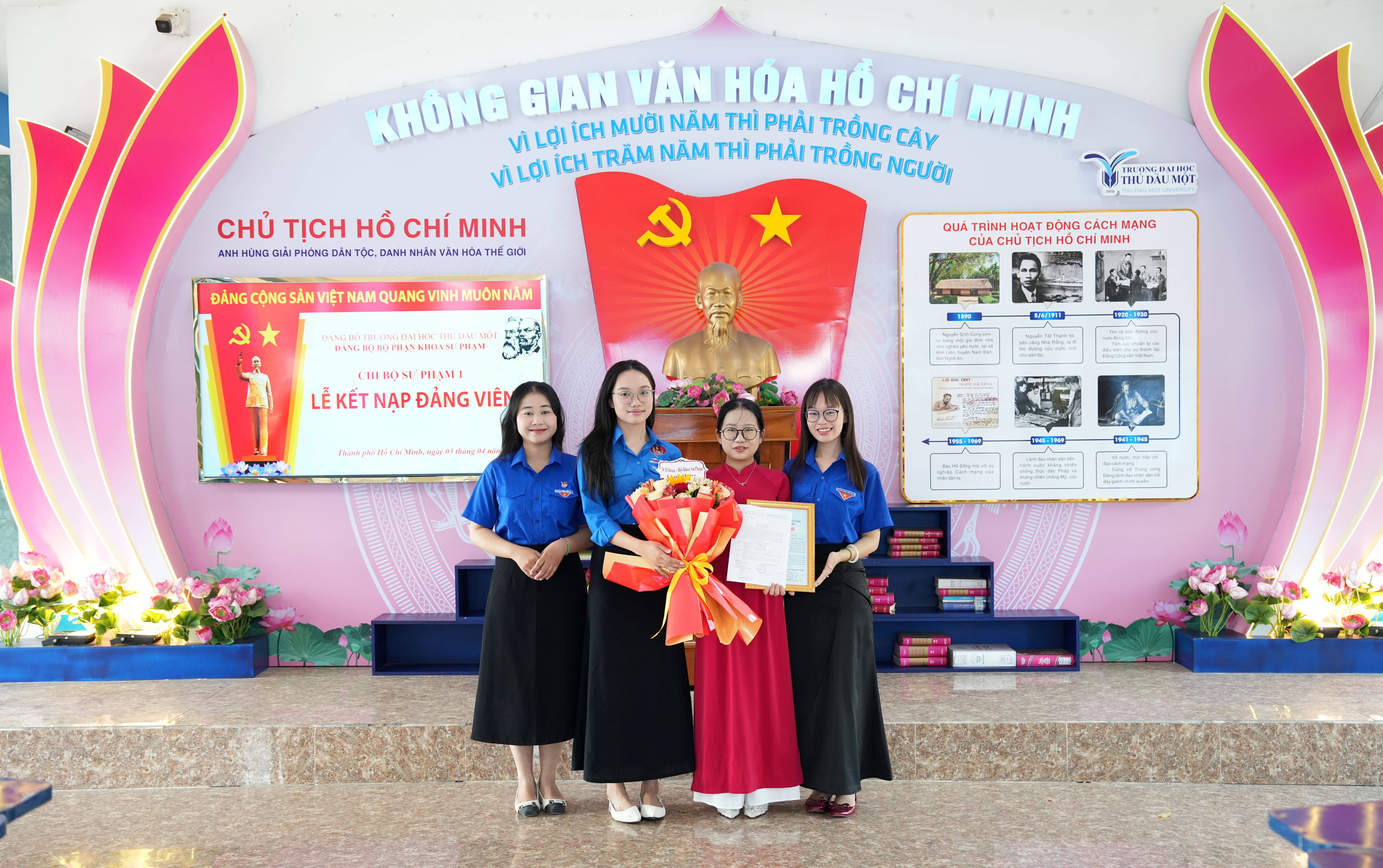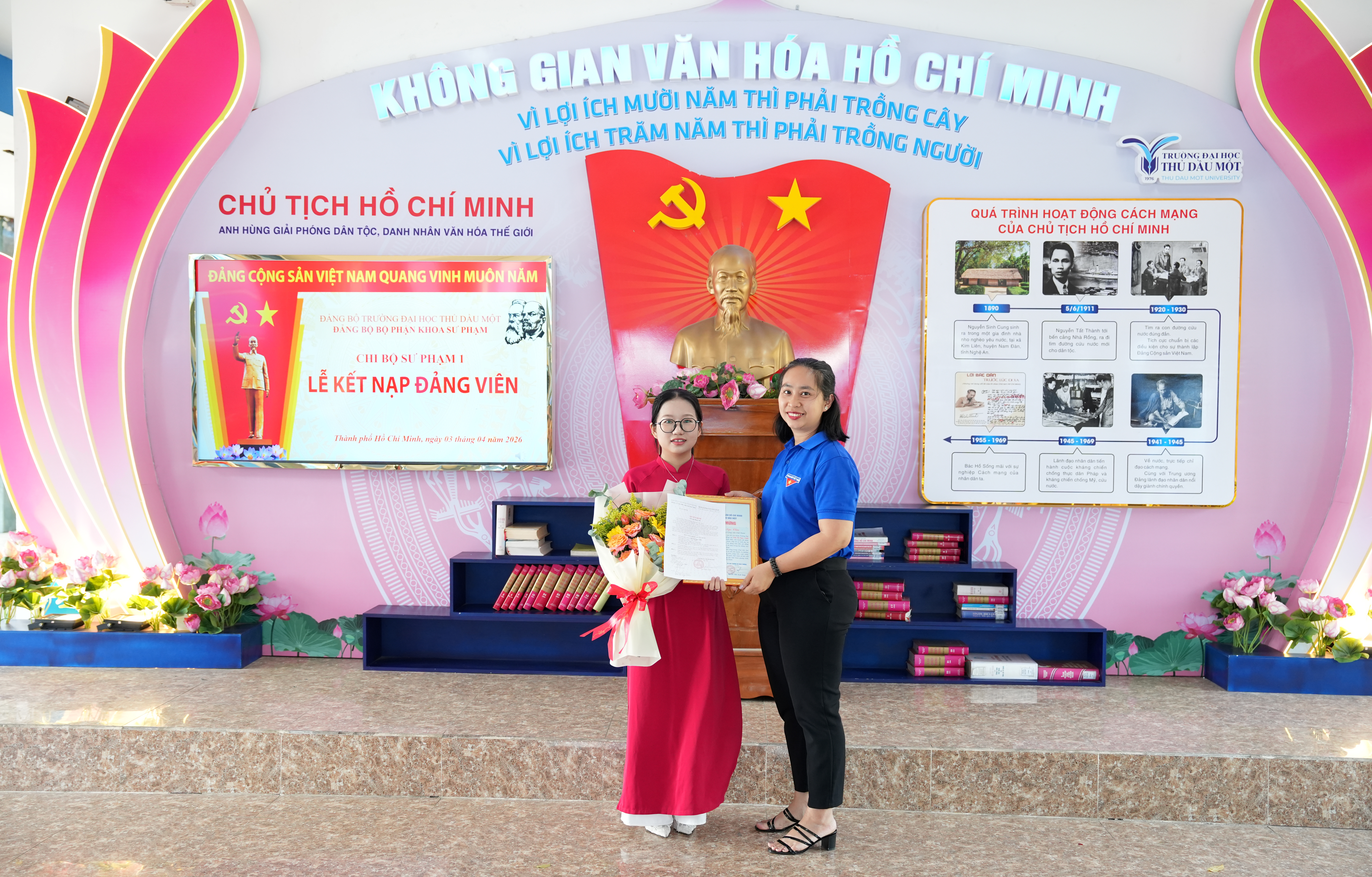 Tại buổi lễ, trước cờ Đảng, cờ Tổ quốc và chân dung Chủ tịch Hồ Chí Minh, đảng viên mới Trần Thị Ngọc Châu đã tuyên thệ, thể hiện quyết tâm tuyệt đối trung thành với mục tiêu, lý tưởng của Đảng, nghiêm túc thực hiện nhiệm vụ của người đảng viên, tiếp tục nỗ lực học tập, rèn luyện và cống hiến. Trao quyết định kết nạp và phát biểu giao nhiệm vụ cho các đảng viên mới, đồng chí Võ Thị Ngọc Trâm – Bí thư Chi bộ nhấn mạnh, đây là vinh dự không chỉ riêng bản thân của mỗi đồng chí, của gia đình mà còn của Chi bộ Sư phạm 1 và Đảng bộ trường Đại học Thủ Dầu Một. Đ/c Ngọc Trâm đề nghị, trong thời gian tới, các đảng viên mới cần tiếp tục phấn đấu, rèn luyện mà trước mắt là đảm bảo học tập tốt, trưởng thành hơn về mặt lý tưởng, phát huy tính tiên phong gương mẫu, thể hiện nhiệt huyết, ý chí vươn lên của thế hệ trẻ; thực hiện tốt nhiệm vụ của người Đảng viên để góp phần xây dựng Đảng ngày càng vững mạnh.