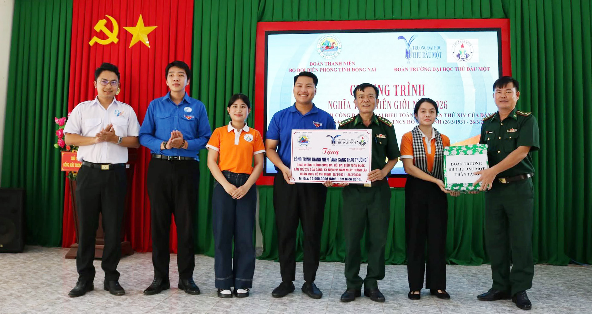 Thể hiện tinh thần sẻ chia và trách nhiệm xã hội, Đoàn trường Đại học Thủ Dầu Một cùng Đội Xung Kích đã trao tặng công trình “Ánh sáng thao trường” trị giá 15 triệu đồng, đồng thời gửi tặng nhiều nhu yếu phẩm thiết thực đến cán bộ, chiến sĩ Đồn Biên phòng Cửa khẩu Hoàng Diệu. Công trình không chỉ góp phần cải thiện điều kiện sinh hoạt, huấn luyện mà còn là biểu tượng của tình cảm, sự tri ân mà tuổi trẻ nhà trường dành cho lực lượng đang ngày đêm gìn giữ biên cương Tổ quốc.