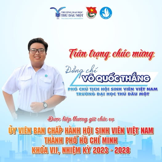 Cũng trong năm 2025, tại Hội nghị kiện toàn Ban Chấp hành, Ban Thư ký, Chủ tịch, Phó Chủ tịch, Ban Kiểm tra và Trưởng Ban Kiểm tra Hội Sinh viên Việt Nam TP. Hồ Chí Minh khóa VII, nhiệm kỳ 2023 – 2028, đồng chí Võ Quốc Thắng – Phó Chủ tịch Hội Sinh viên Việt Nam Trường Đại học Thủ Dầu Một đã được hiệp thương giữ chức vụ Ủy viên Ban Chấp hành Hội Sinh viên Việt Nam TP. Hồ Chí Minh khóa VII.