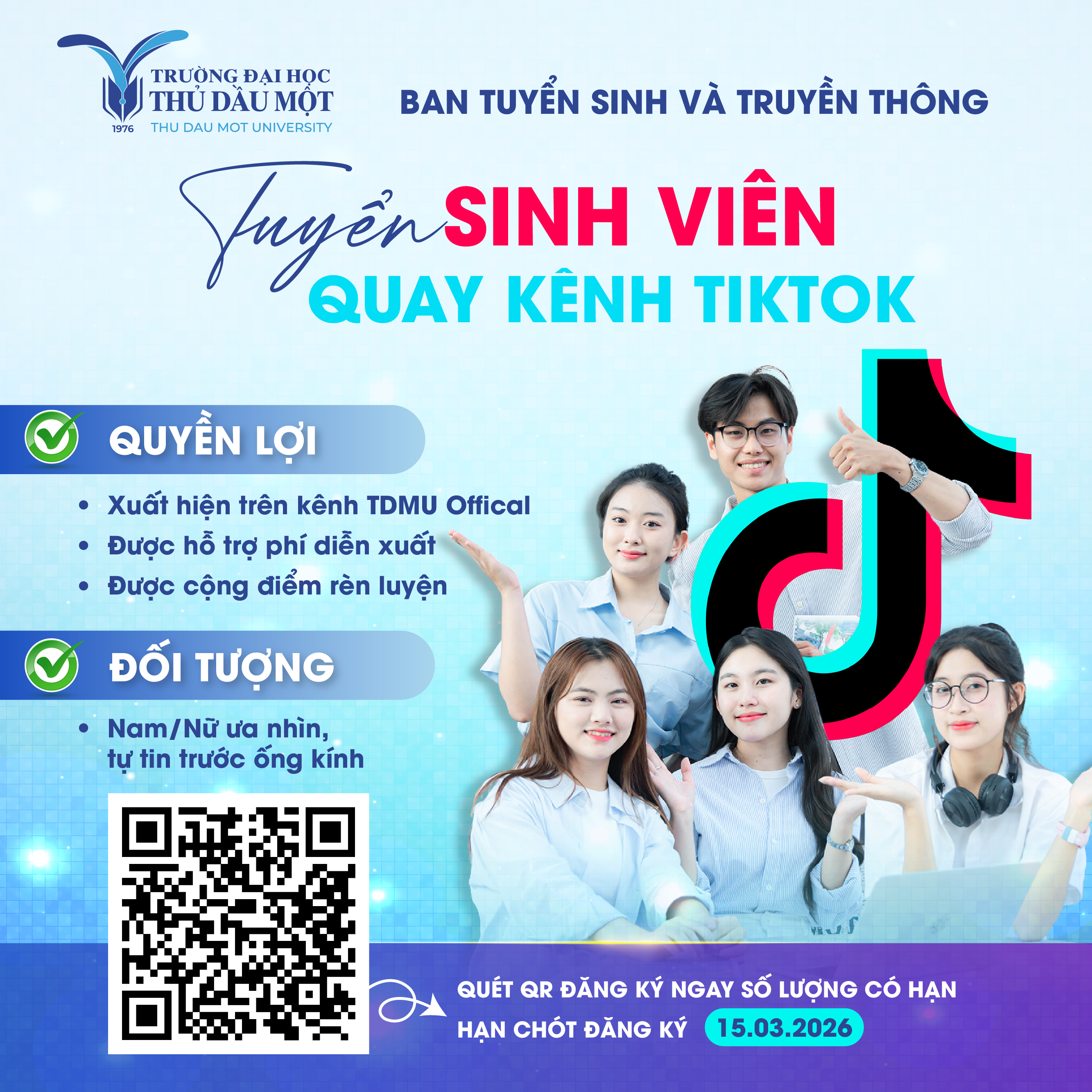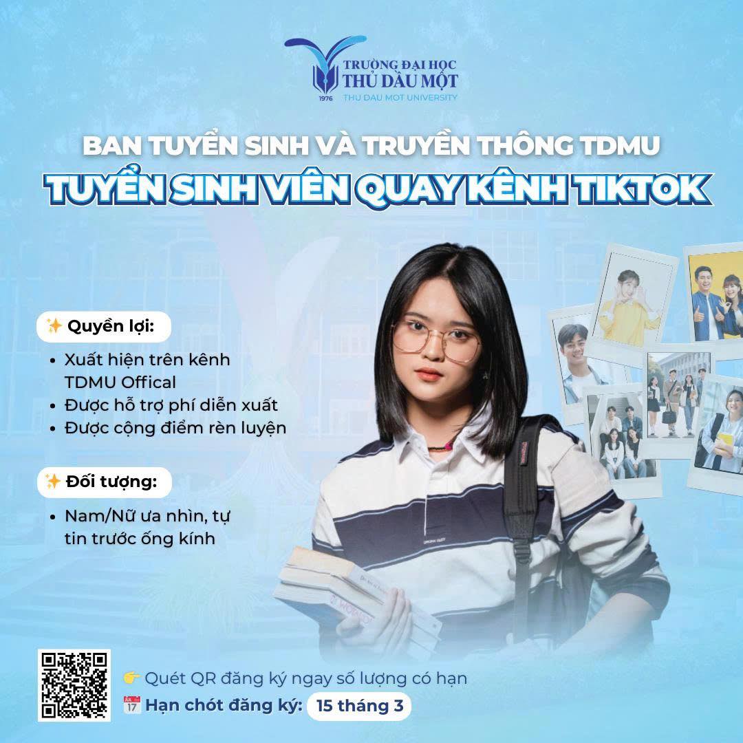 Nhằm đa dạng hóa hình thức truyền thông và lan tỏa hình ảnh năng động, sáng tạo của sinh viên, Ban Tuyển sinh và Truyền thông – Trường Đại học Thủ Dầu Một chính thức triển khai dự án sản xuất chuỗi video ngắn trên nền tảng TikTok trong tháng 3 tới.