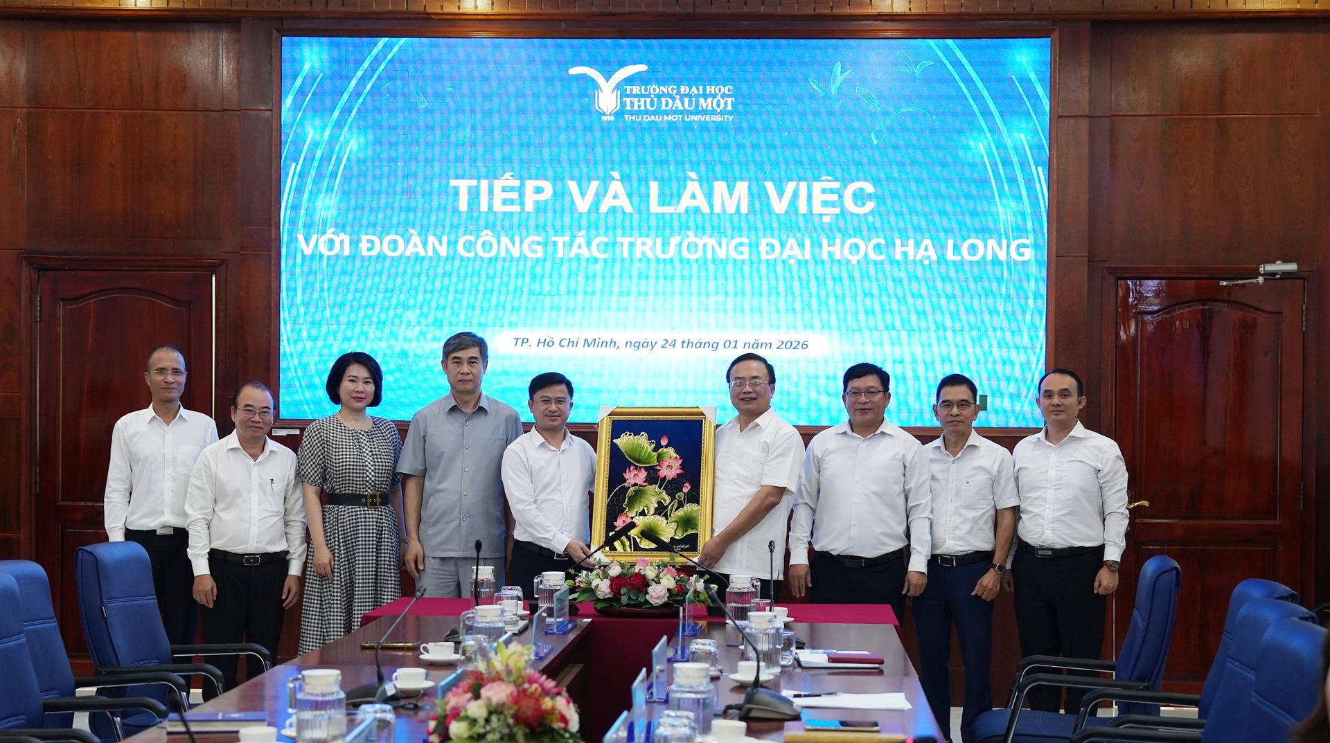 Sáng ngày 24/01/2026, Trường Đại học Thủ Dầu Một đã tiếp và làm việc với Đoàn công tác Trường Đại học Hạ Long nhằm trao đổi, chia sẻ kinh nghiệm trong phát triển công tác đào tạo, chính sách khoa học – công nghệ và các hoạt động quản trị, điều hành đại học.