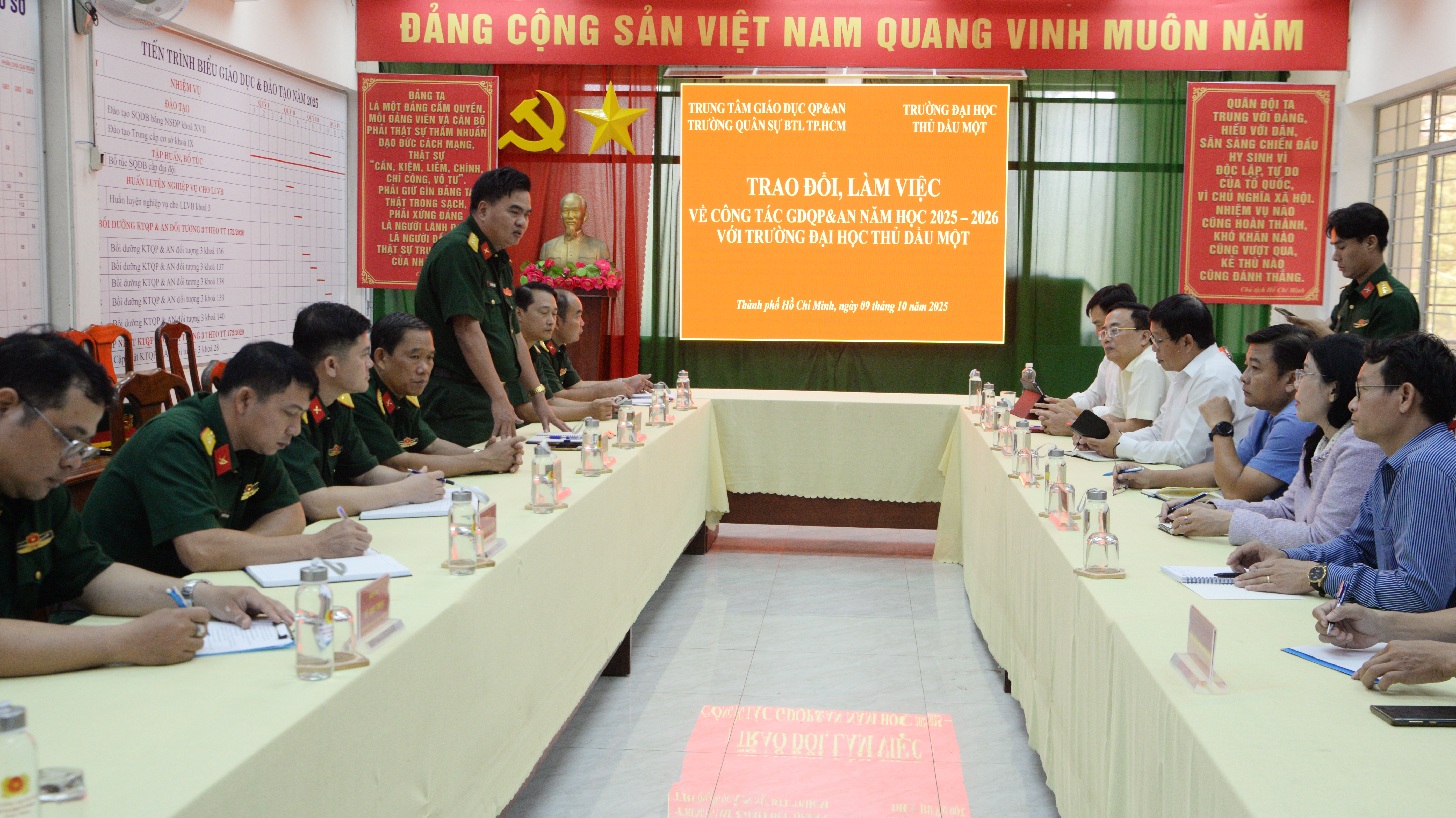 Ngày 09/10/2025, Đoàn công tác Trường Đại học Thủ Dầu Một đã đến thăm và làm việc với Trung tâm Giáo dục Quốc phòng và An ninh, Trường Quân sự Bộ Tư lệnh TP. Hồ Chí Minh nhằm trao đổi, thống nhất nội dung phối hợp trong công tác giáo dục quốc phòng – an ninh cho sinh viên năm học 2025–2026.