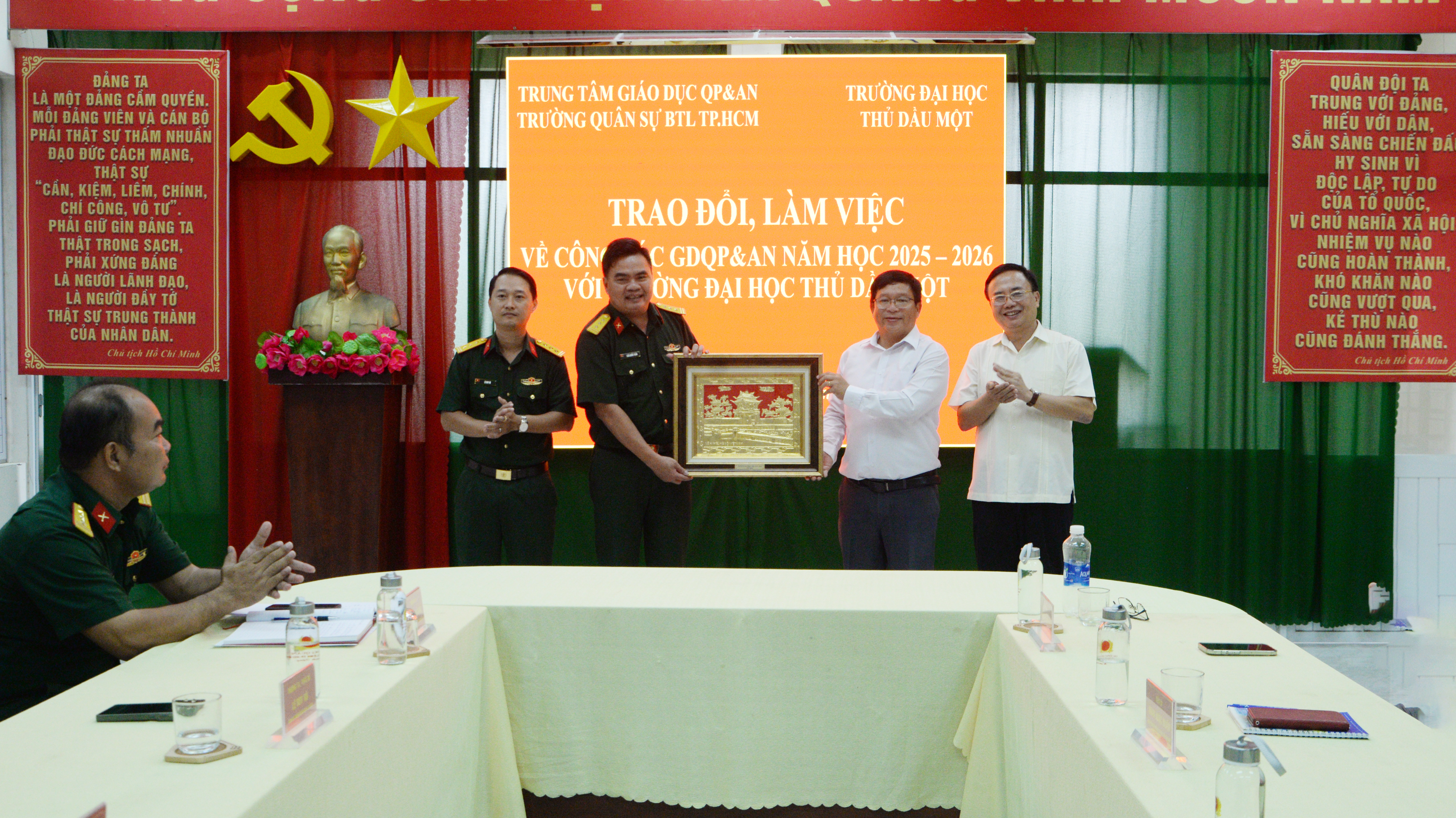 Lãnh đạo Trường Đại học Thủ Dầu Một trao tặng bức tranh lưu niệm đến tập thể lãnh đạo, giảng viên và chiến sĩ Trung tâm Giáo dục Quốc phòng và An ninh – Trường Quân sự Bộ Tư lệnh TP. Hồ Chí Minh
