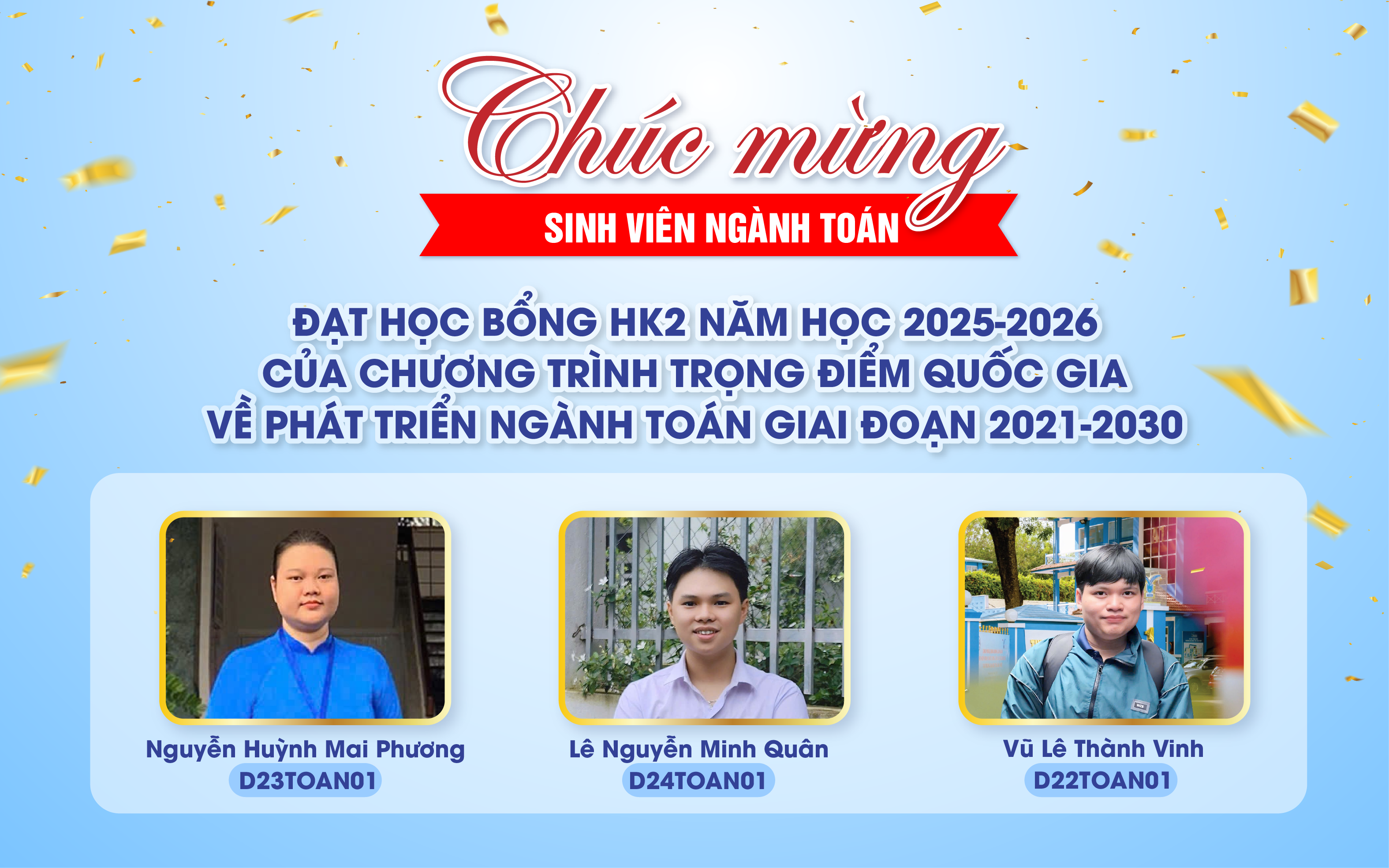 Ba sinh viên được vinh danh gồm: Nguyễn Huỳnh Mai Phương (D23TOAN01), Lê Nguyễn Minh Quân (D24TOAN01) và Vũ Lê Thành Vinh (D22TOAN01). Việc duy trì kết quả qua hai học kỳ liên tiếp không chỉ cho thấy sự ổn định trong học tập mà còn phản ánh quá trình rèn luyện nghiêm túc, bền bỉ của các em trong môi trường học thuật.