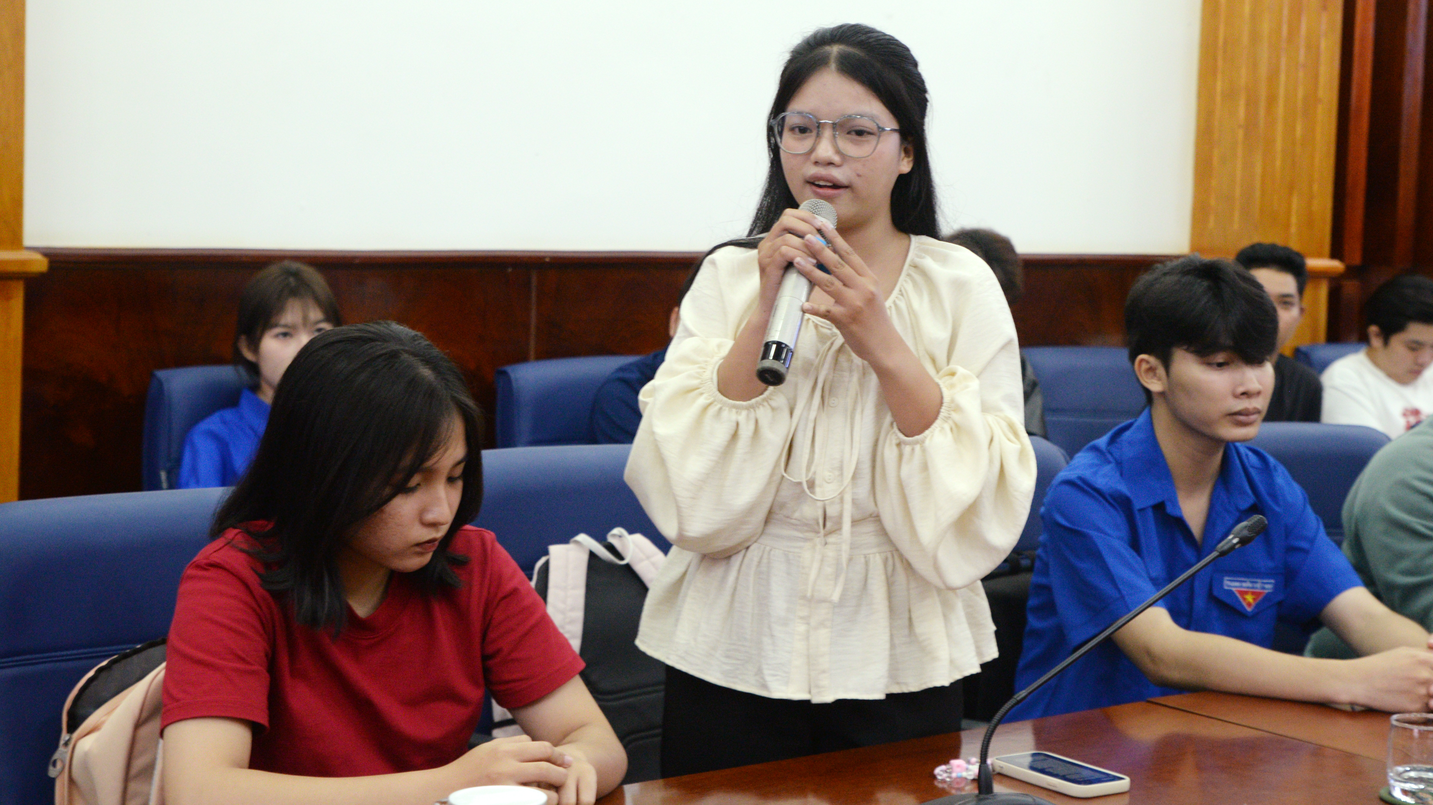 Trong phần giao lưu, thay mặt các đảng viên trẻ, Phạm Bùi Thủy Linh – sinh viên ngành Ngôn ngữ Trung Quốc, khóa D25 chia sẻ cảm xúc tự hào khi được kết nạp Đảng ở tuổi 18. Ở vai trò là đảng viên, sinh viên Trường Đại học Thủ Dầu Một, Thủy Linh xem đó là động lực để không ngừng nỗ lực, giữ vững phẩm chất, phát huy tinh thần trách nhiệm của người đảng viên trong học tập và rèn luyện. Trao đổi tại chương trình, Thủy Linh bày tỏ mong muốn nhà trường tiếp tục đẩy mạnh ứng dụng công nghệ số trong giảng dạy và học tập, đồng thời tổ chức nhiều phong trào, hoạt động đa dạng, hấp dẫn; các cuộc thi học tập và rèn luyện theo tấm gương đạo đức Hồ Chí Minh, cuộc thi tìm hiểu về Đảng, nhằm khơi dậy niềm tự hào, lý tưởng cách mạng và tinh thần trách nhiệm của tuổi trẻ trong thời kỳ mới. Bên cạnh đó, Thủy Linh đề xuất xây dựng “Không gian sáng tạo sinh viên” – nơi mọi ý tưởng, dự án khởi nghiệp và sáng kiến trẻ được ươm mầm, kết nối và lan tỏa trong toàn trường, góp phần hình thành môi trường học tập năng động, thúc đẩy tinh thần đổi mới sáng tạo và khát vọng cống hiến của sinh viên Đại học Thủ Dầu Một.