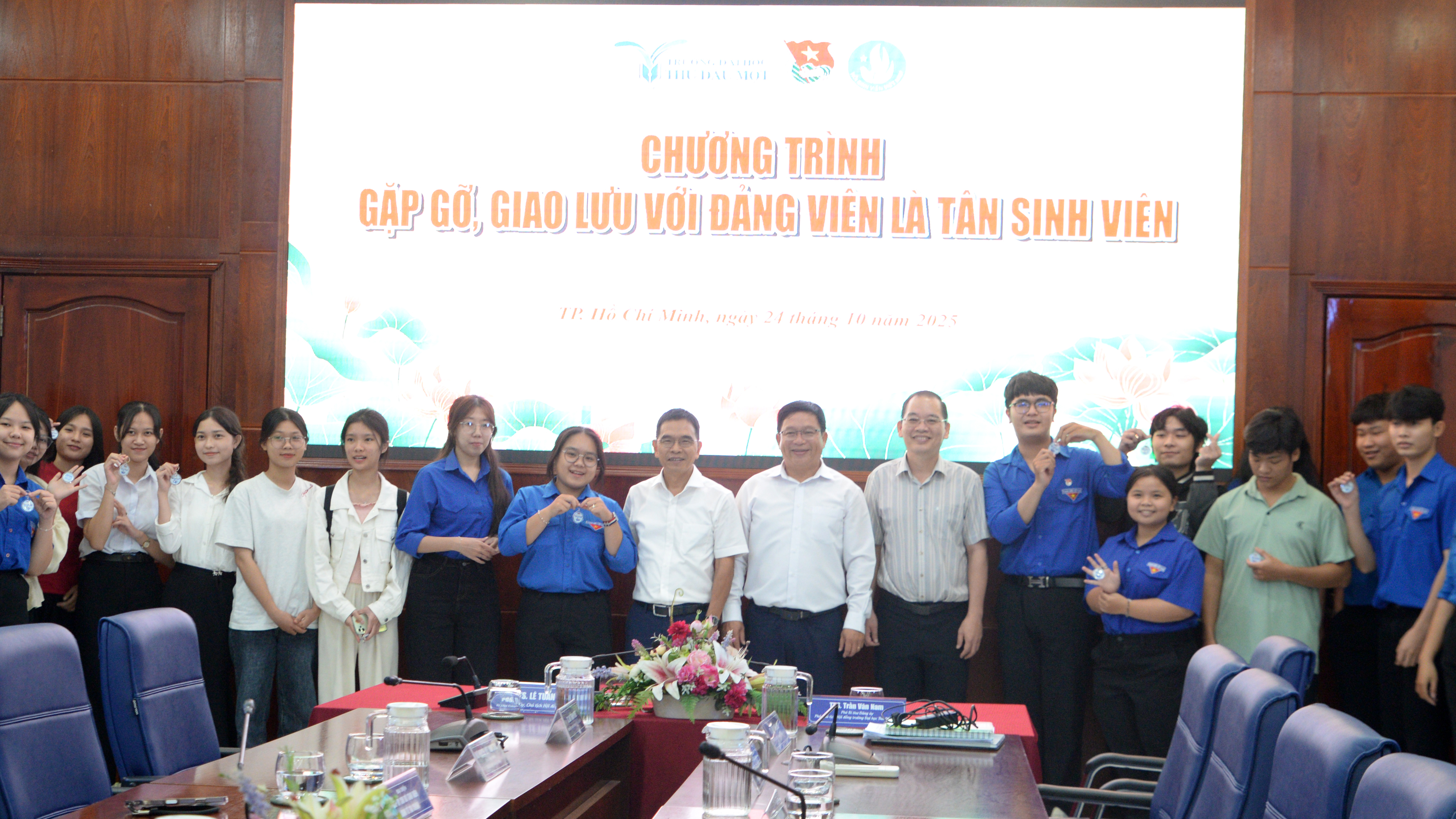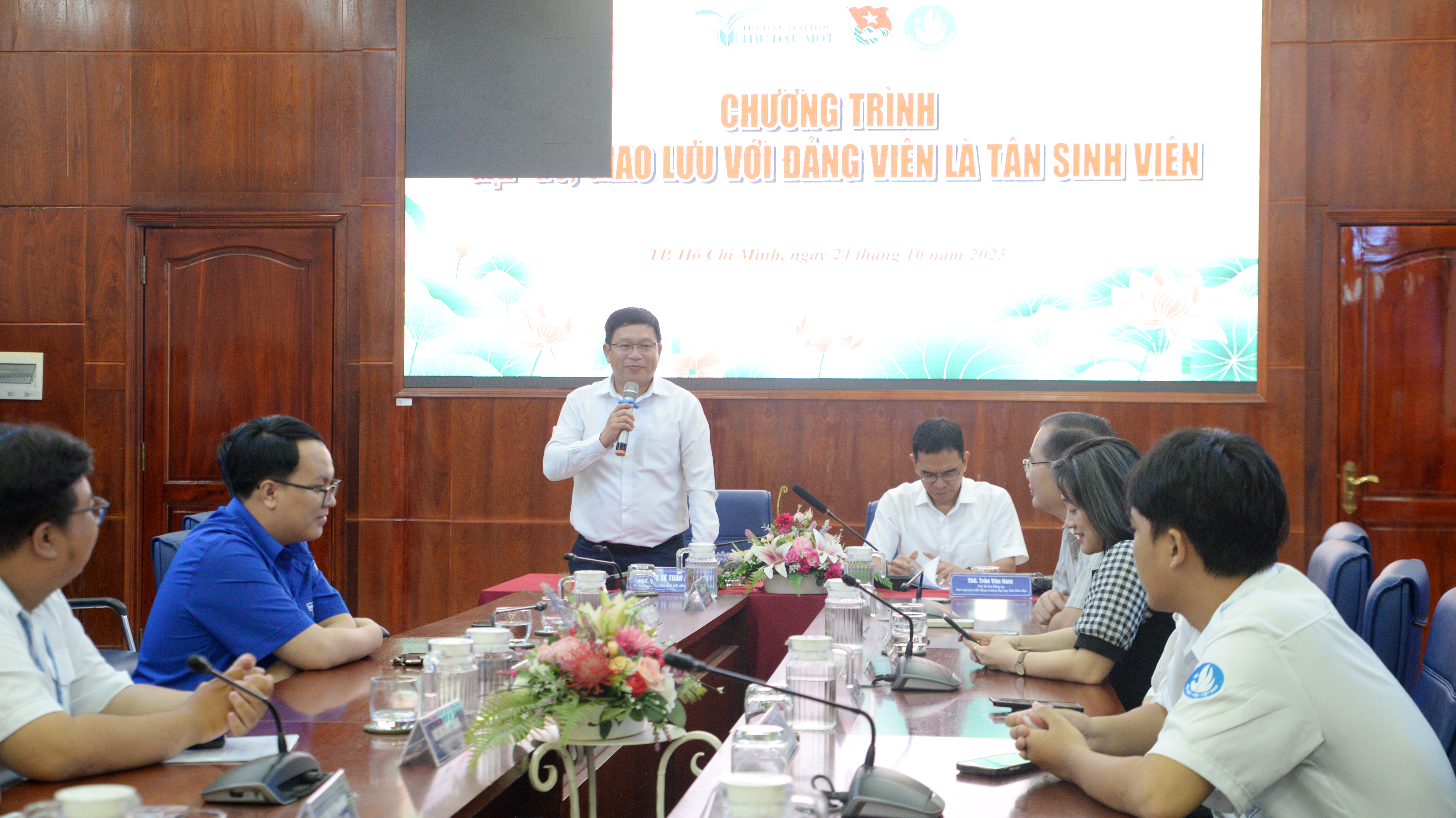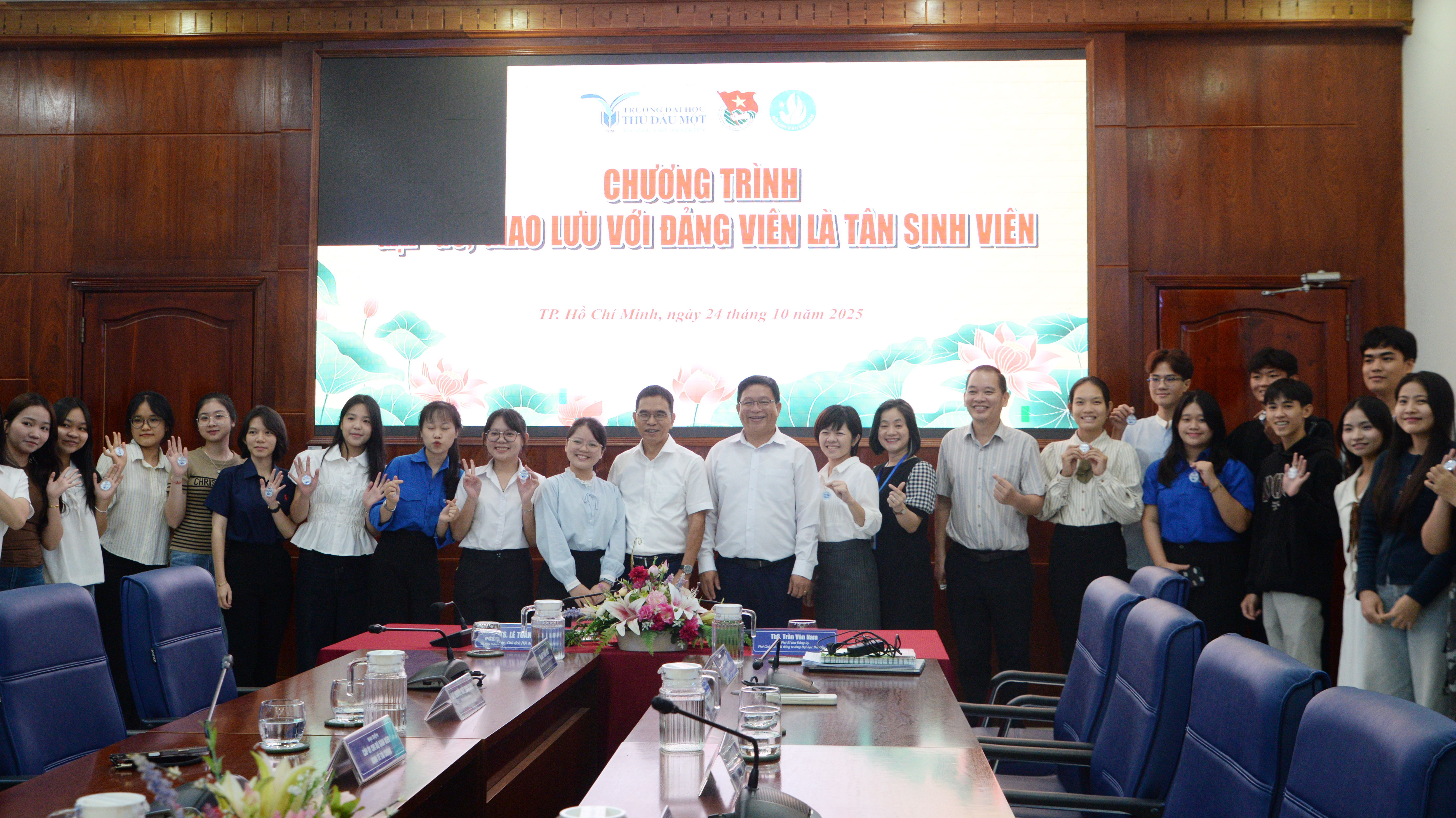 Ngày 24/10/2025, Đảng ủy Trường Đại học Thủ Dầu Một tổ chức chương trình gặp gỡ Đảng viên Tân sinh viên khóa D25. Tham dự chương trình có PGS.TS. Lê Tuấn Anh – Bí thư Đảng ủy, Chủ tịch Hội đồng Trường; ThS. Trần Văn Nam – Phó Bí thư Đảng ủy, Phó Chủ tịch Hội đồng Trường; ThS. Vương Thế Hùng - Phó Hiệu trưởng, lãnh đạo các đơn vị thuộc và trực thuộc Trường; Chi ủy các Chi bộ Sinh viên; Ban Thường vụ Đoàn Thanh niên, Hội Sinh viên; cùng các đảng viên là tân sinh viên khóa D25.