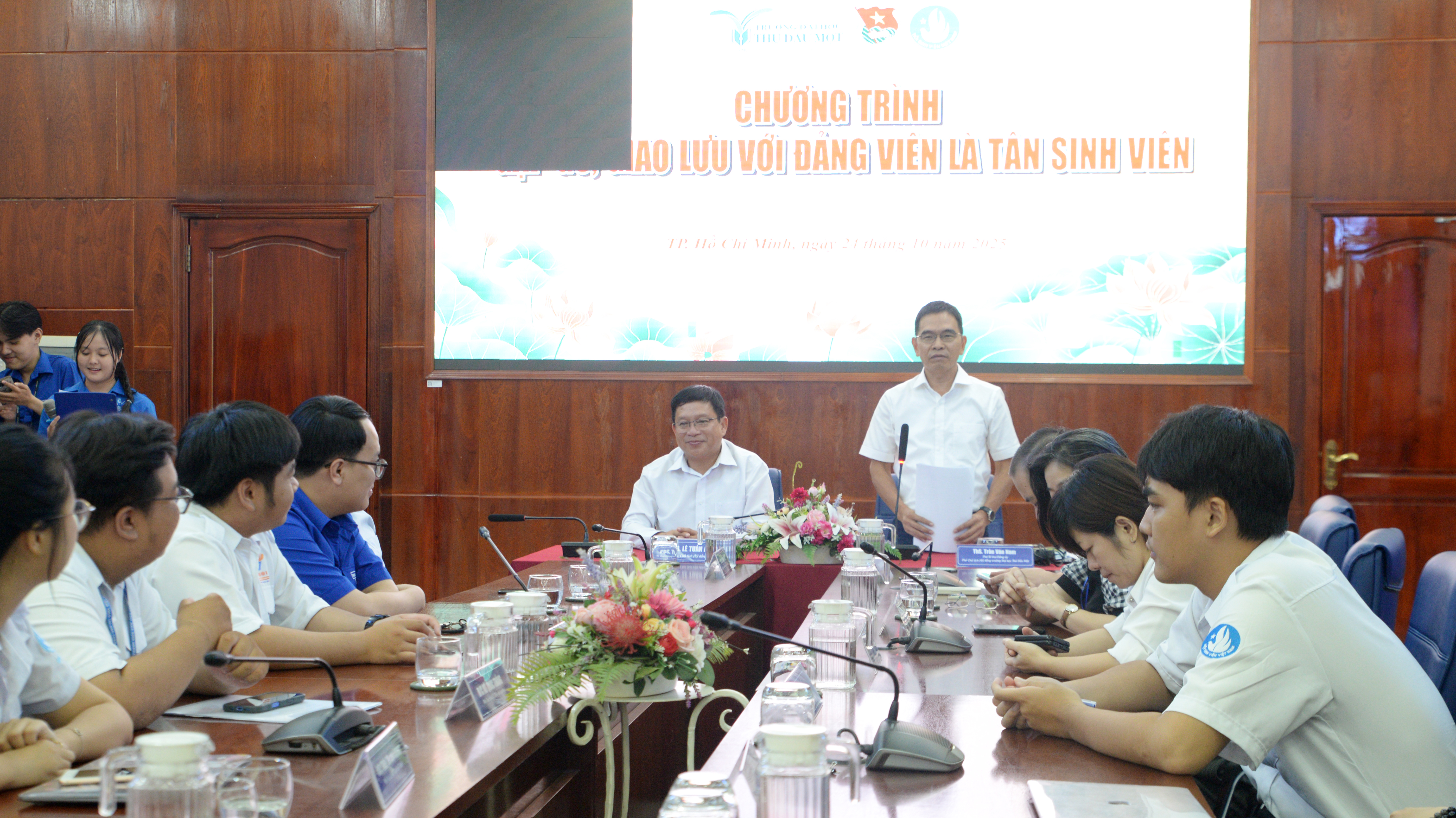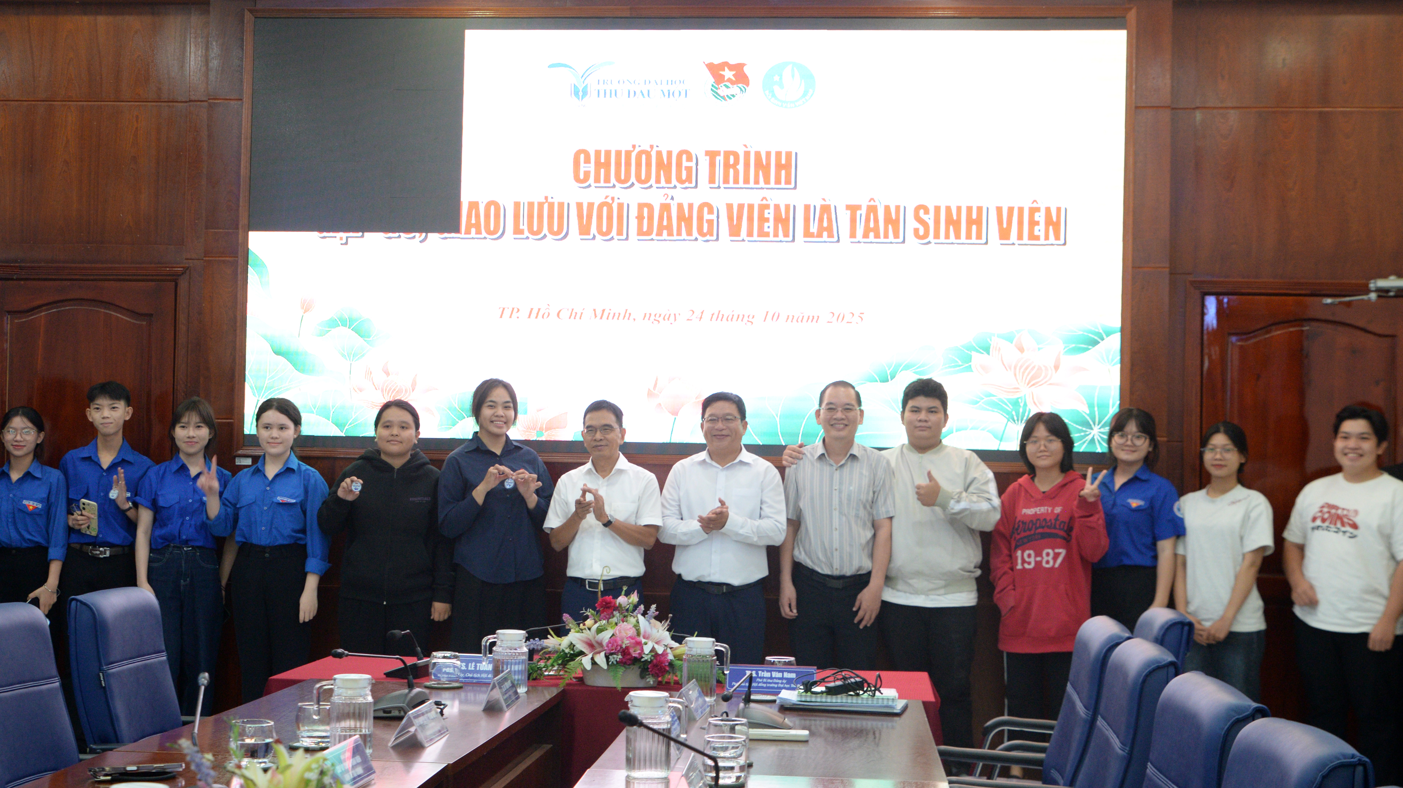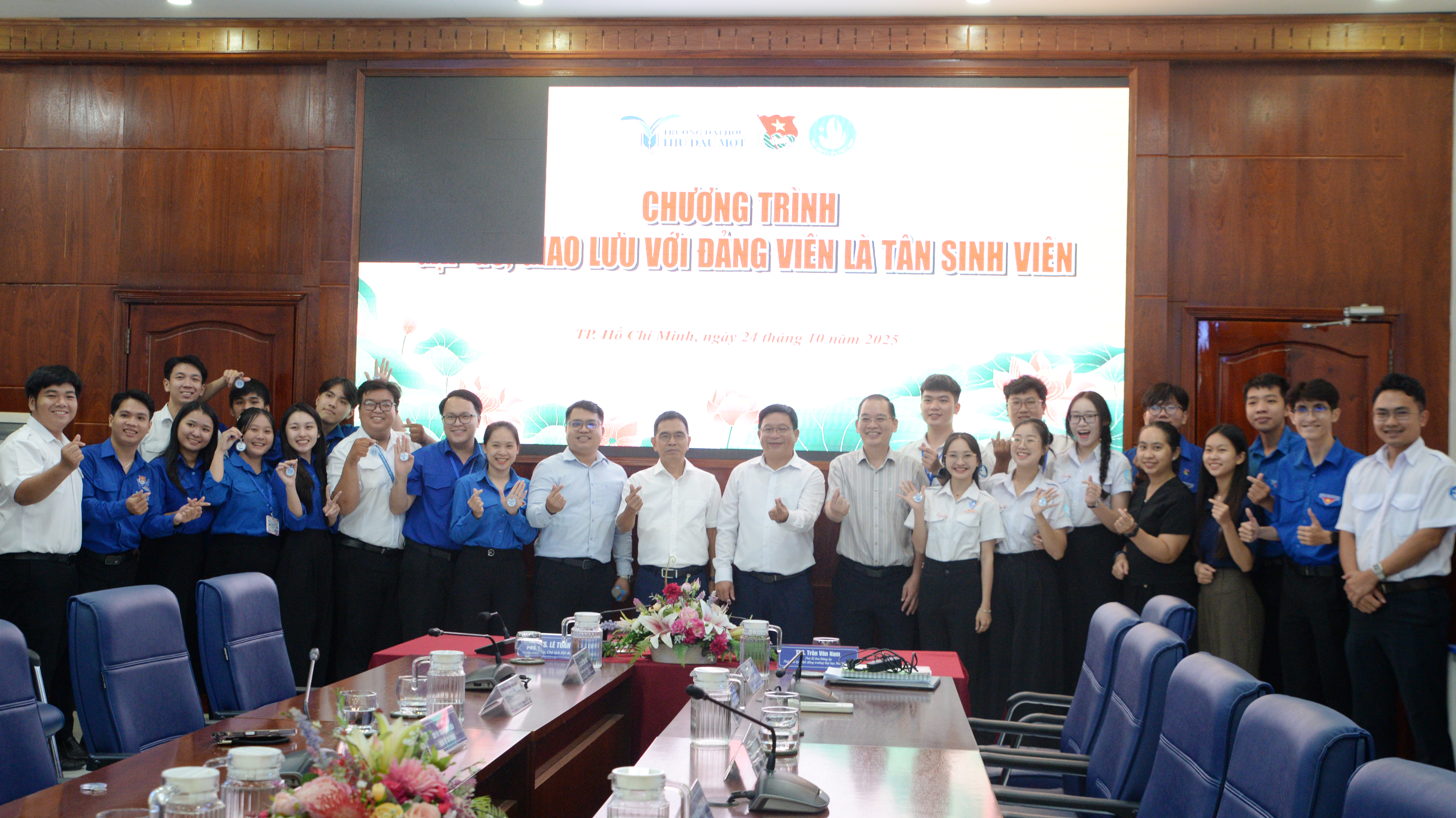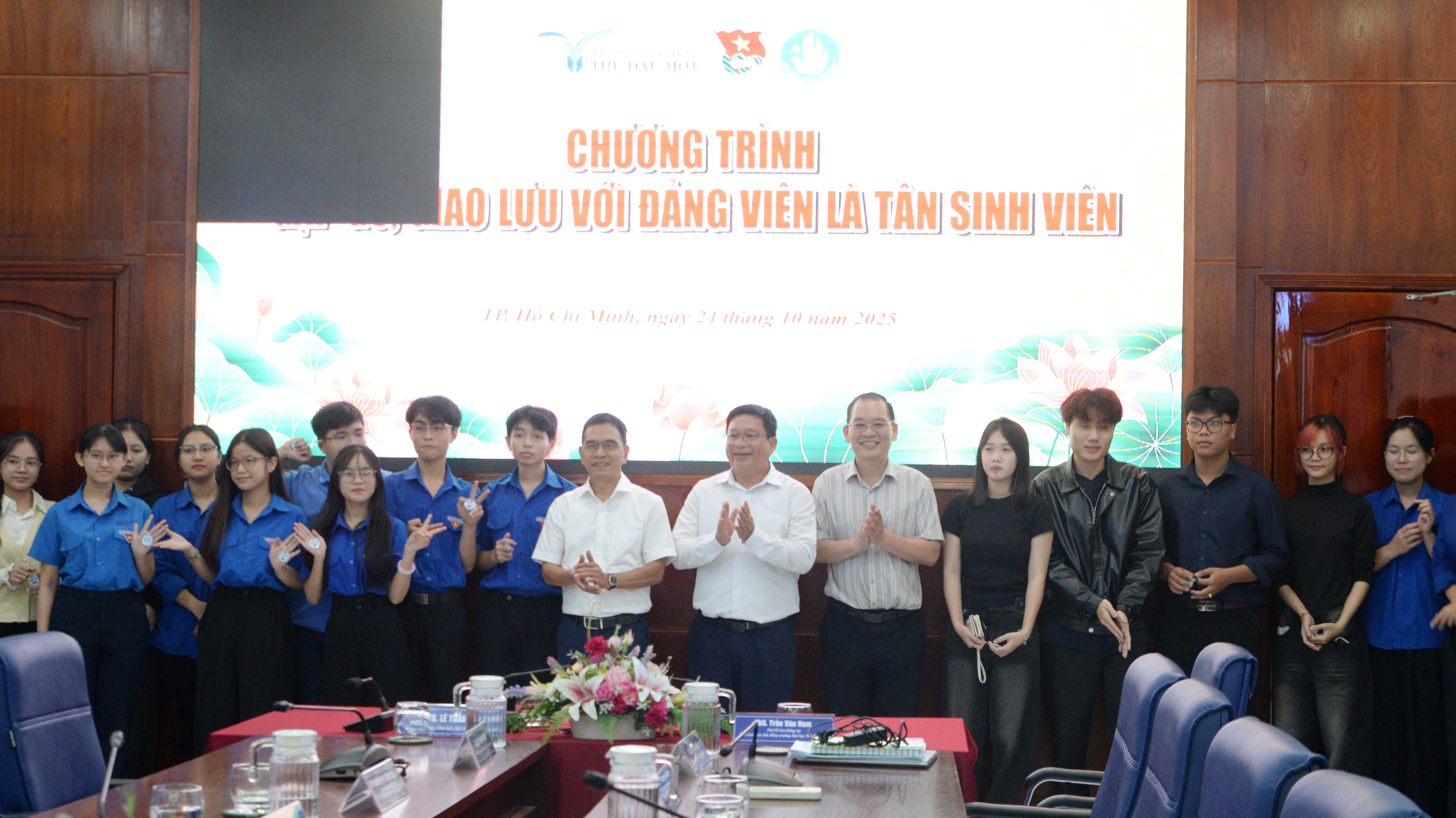 Ngày 24/10/2025, Đảng ủy Trường Đại học Thủ Dầu Một tổ chức chương trình gặp gỡ Đảng viên Tân sinh viên khóa D25. Tham dự chương trình có PGS.TS. Lê Tuấn Anh – Bí thư Đảng ủy, Chủ tịch Hội đồng Trường; ThS. Trần Văn Nam – Phó Bí thư Đảng ủy, Phó Chủ tịch Hội đồng Trường; ThS. Vương Thế Hùng - Phó Hiệu trưởng, lãnh đạo các đơn vị thuộc và trực thuộc Trường; Chi ủy các Chi bộ Sinh viên; Ban Thường vụ Đoàn Thanh niên, Hội Sinh viên; cùng các đảng viên là tân sinh viên khóa D25.