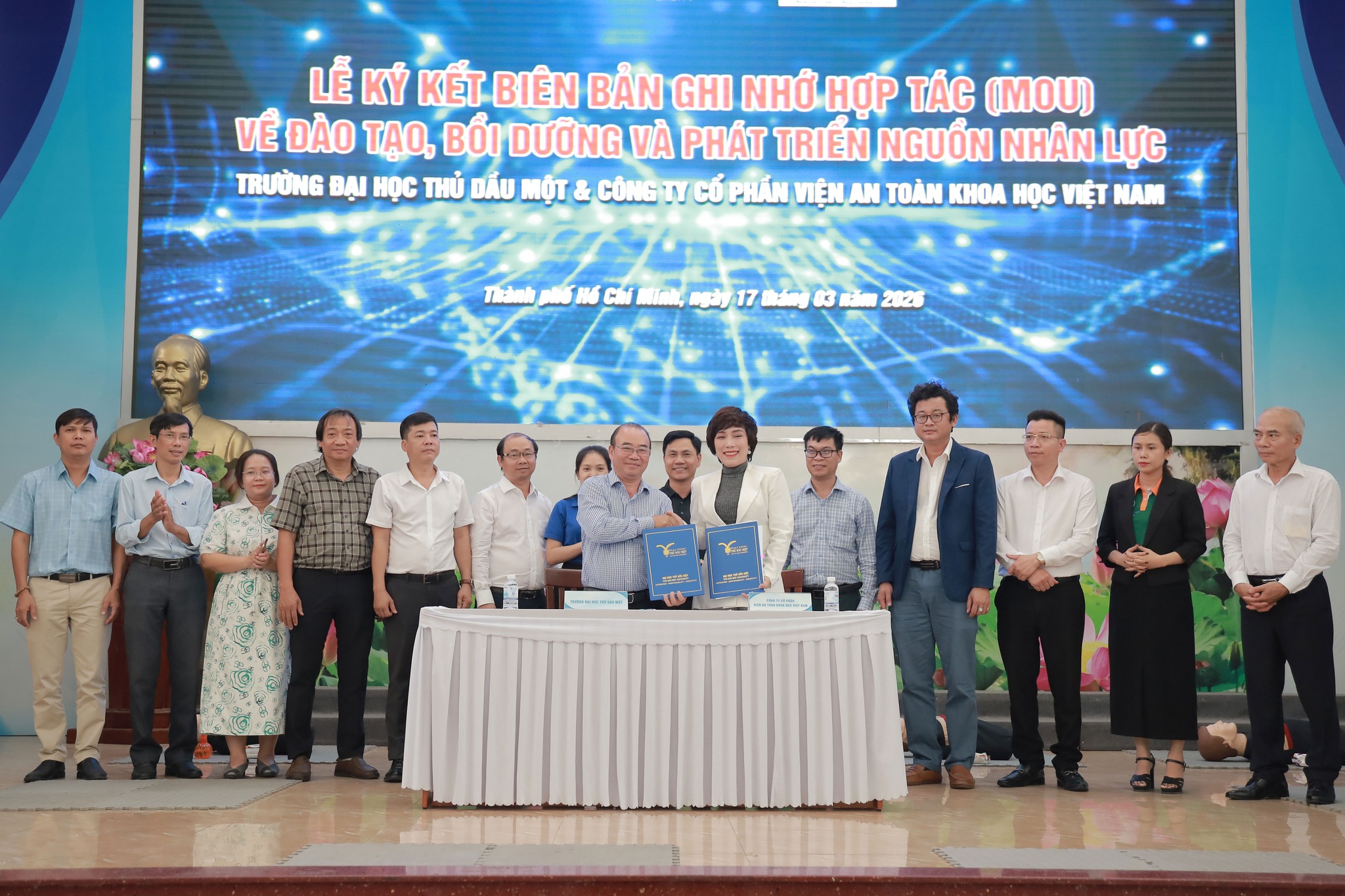 Nhằm tăng cường hợp tác trong lĩnh vực đào tạo, bồi dưỡng và phát triển nguồn nhân lực, ngày 17/3/2026, Trường Đại học Thủ Dầu Một đã long trọng tổ chức Lễ ký kết Biên bản ghi nhớ hợp tác (MOU) với Công ty Cổ phần Viện An toàn Khoa học Việt Nam.