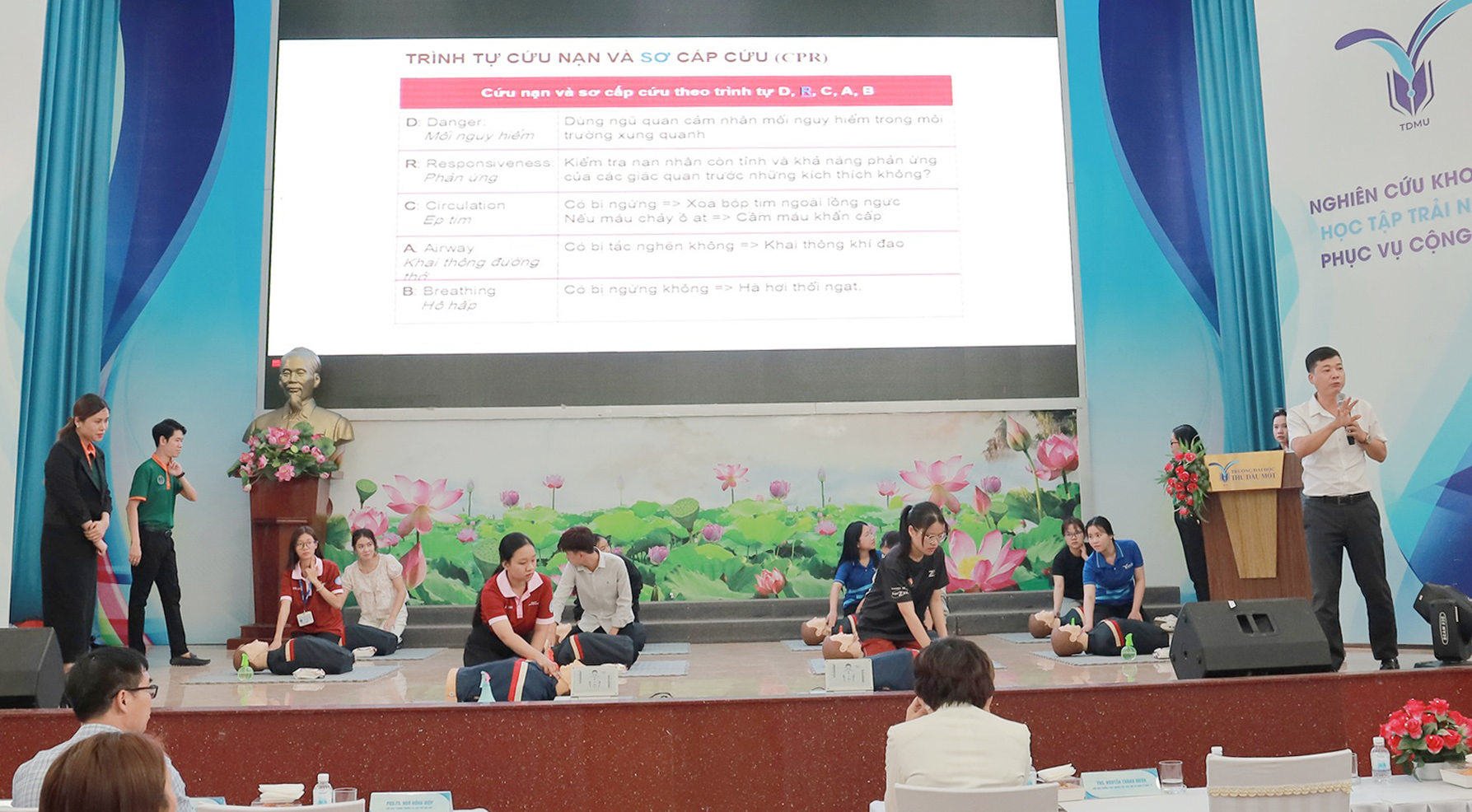 Tại chương trình, phần chia sẻ của ThS. Nguyễn Danh Khoa đã cung cấp nhiều thông tin thực tiễn, cập nhật về các nguy cơ mất an toàn trong môi trường học đường và cộng đồng. Đặc biệt, hoạt động thực hành sơ cấp cứu do ThS. Nguyễn Minh Thắng trực tiếp hướng dẫn đã tạo điều kiện để sinh viên trải nghiệm, rèn luyện các kỹ năng cần thiết như xử lý chấn thương, sơ cứu ban đầu trong các tình huống khẩn cấp. Qua đó, góp phần nâng cao nhận thức, tăng cường khả năng tự bảo vệ bản thân và chủ động ứng phó với các rủi ro trong thực tiễn.