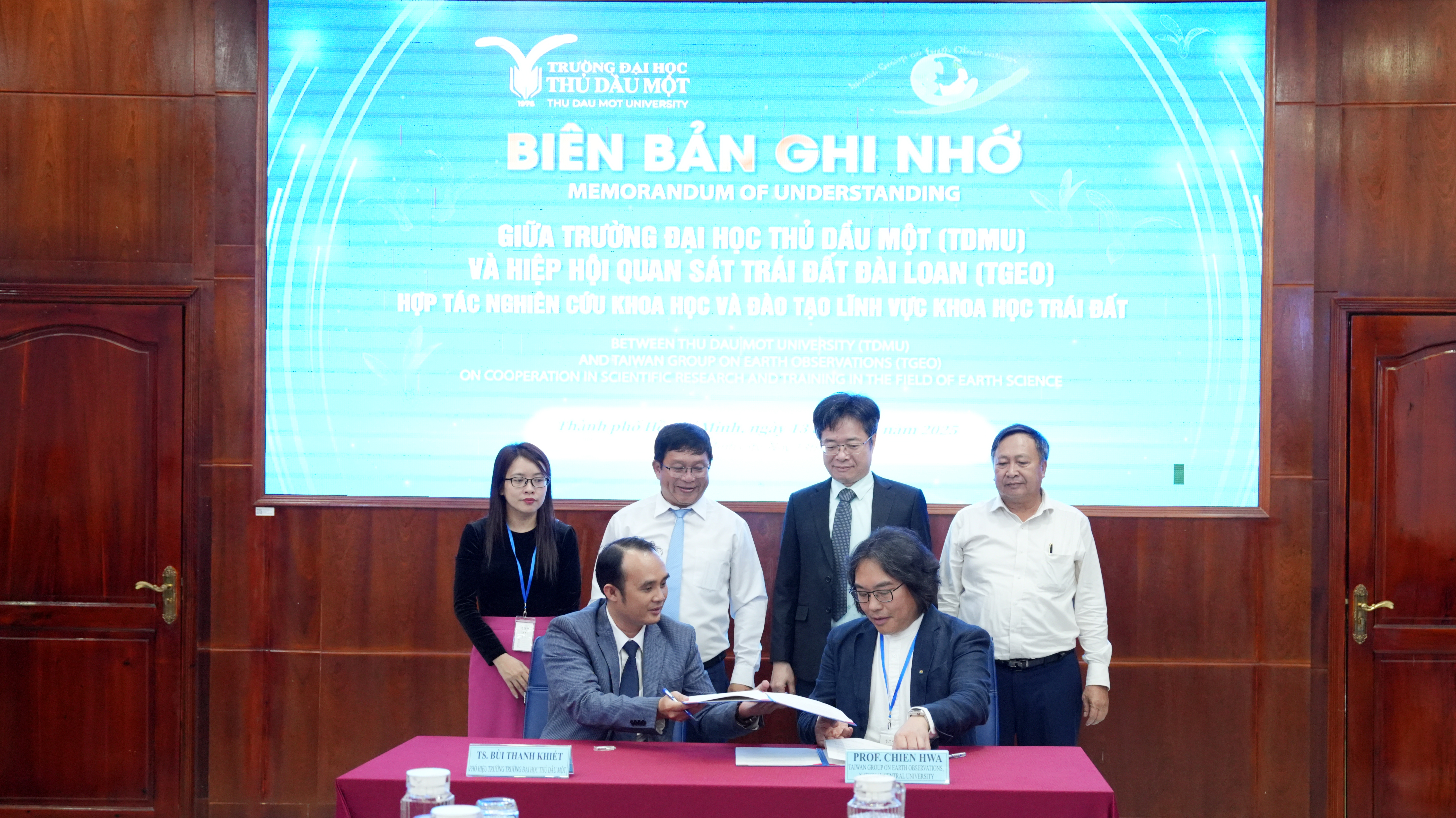 Ngày 13/11/2025, Trường Đại học Thủ Dầu Một đã ký kết bản ghi nhớ hợp tác MOU với Hiệp hội quan sát trái đất Đài Loan (TGEO) và Trung tâm Nghiên cứu & Điều tra hạn hán Đài Loan và Toàn cầu (TGDIRC/DROUGHTHUB).