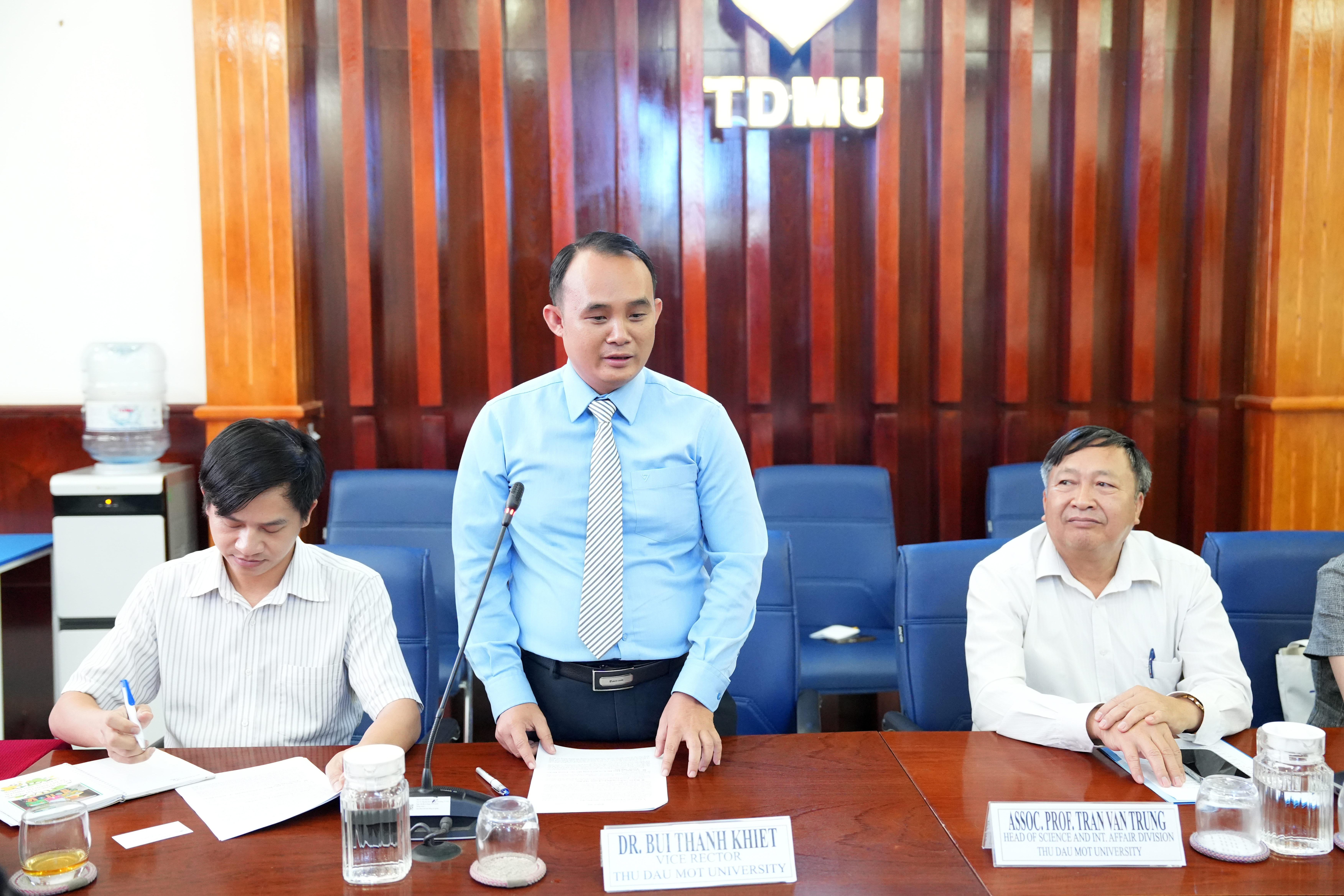 Phát biểu tại buổi làm việc, TS. Bùi Thanh Khiết chào mừng đoàn công tác của Trường Đại học Kansai đến thăm và làm việc tại Trường Đại học Thủ Dầu Một. TS. Bùi Thanh Khiết cho biết, từ tháng 7/2025, nhà trường trực thuộc Ủy ban Nhân dân Thành phố Hồ Chí Minh, trở thành một thành viên trong hệ sinh thái giáo dục – khoa học – công nghệ của Thành phố Hồ Chí Minh. Trong bối cảnh mới, Trường Đại học Thủ Dầu Một xác định vai trò là trung tâm đào tạo nguồn nhân lực chất lượng cao, trung tâm nghiên cứu khoa học, chuyển giao công nghệ và đổi mới sáng tạo, góp phần giải quyết các vấn đề thực tiễn và tăng cường liên kết giữa giáo dục – doanh nghiệp – xã hội. Trao đổi thêm về định hướng hợp tác, TS. Bùi Thanh Khiết cho biết Việt Nam là quốc gia đang phát triển, đang đối mặt với nhiều thách thức trong quá trình đô thị hóa, phát triển kinh tế gắn với bảo vệ môi trường và quản lý tài nguyên bền vững. Trong khi đó, Nhật Bản có nhiều kinh nghiệm trong nghiên cứu, quản lý và hoạch định chính sách trong các lĩnh vực này. Từ thực tiễn đó, TS. Bùi Thanh Khiết bày tỏ mong muốn, trong thời gian tới hai trường sẽ tăng cường hợp tác trong các dự án nghiên cứu khoa học, chia sẻ tri thức và kinh nghiệm quốc tế, đồng thời cùng tham gia đề xuất các khuyến nghị chính sách liên quan đến môi trường, phát triển bền vững và quản lý tài nguyên, góp phần hỗ trợ quá trình phát triển của Việt Nam trong thời gian tới.