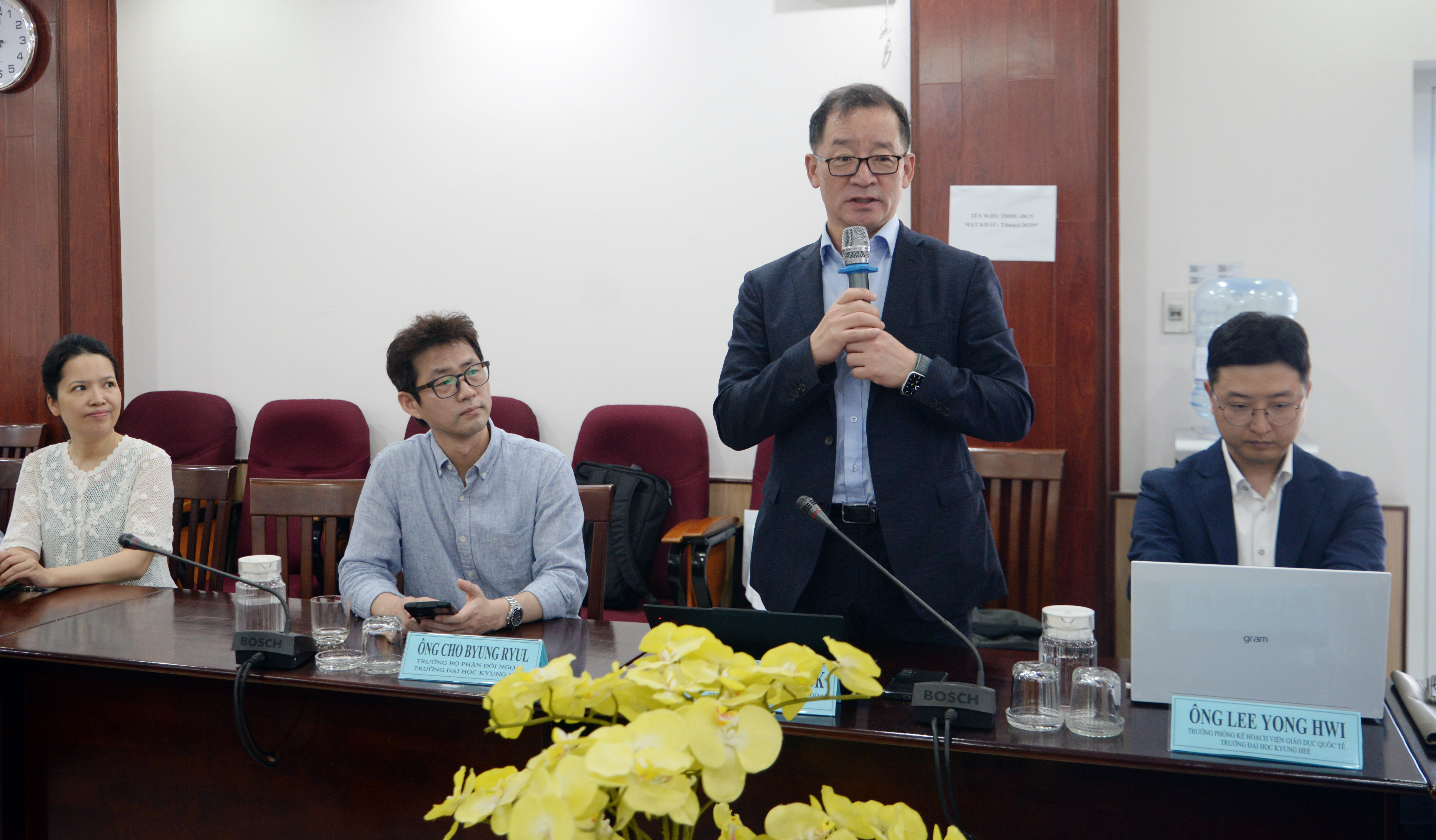 Phát biểu chào mừng Đoàn Đại biểu Đại học Kyung Hee, PGS.TS Lê Tuấn Anh - Chủ tịch Hội đồng Trường đã giới thiệu tổng quan về quá trình xây dựng và phát triển, định hướng giáo dục và những thành tựu nổi bật của nhà trường trong công tác đào tạo các bậc học, hoạt động nghiên cứu khoa học và chuyển giao công nghệ, nhất là những thế mạnh của khối ngành sư phạm, công nghệ, kỹ thuật, khoa học môi trường, ngành ngôn ngữ, nhất là ngành học ngôn ngữ Hàn Quốc. PGS.TS. Lê Tuấn Anh cho biết thêm, trong nhiều năm qua, trường Đại học Thủ Dầu Một đã cung ứng nguồn nhân lực lớn phục vụ cho sự phát triển của địa phương, vùng Đông Nam Bộ và cả nước. Đặc biệt, nguồn nhân lực của nhà trường đã đóng góp tích cực vào sự phát triển của các doanh nghiệp Hàn Quốc đang hoạt động tại khu vực Bình Dương, vùng TP.HCM. Bên cạnh đó, mối quan hệ hợp tác giữa Trường Đại học Thủ Dầu Một với các trường đại học và doanh nghiệp Hàn Quốc đã đạt nhiều kết quả tích cực, góp phần tăng cường hoạt động giao lưu học thuật, trao đổi chuyên môn và nâng cao chất lượng đào tạo.