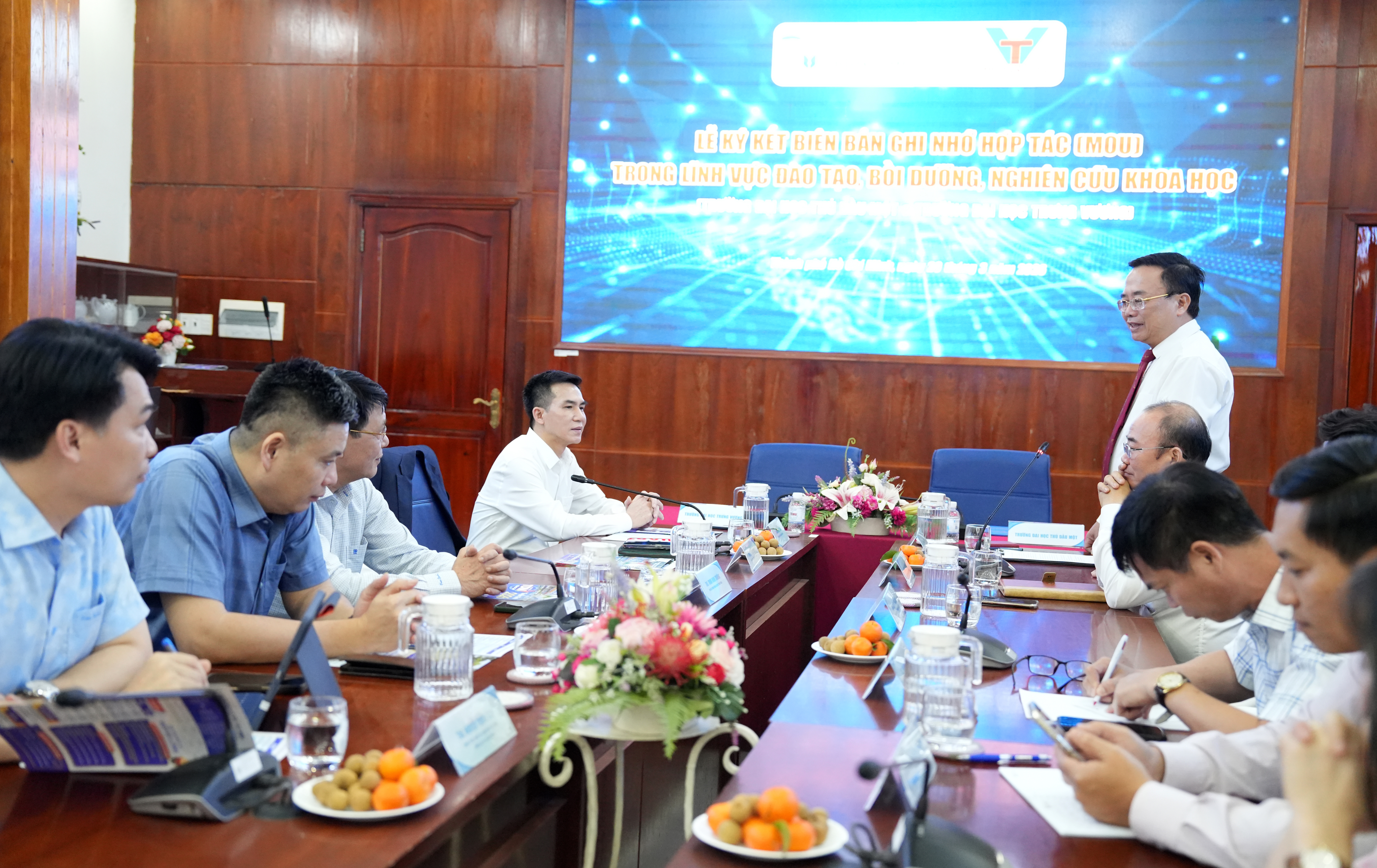 Dưới sự chứng kiến của lãnh đạo hai trường, TS. Đoàn Ngọc Xuân - Hiệu trưởng Trường Đại học Thủ Dầu Một và TS. Nguyễn Huy Oanh - Hiệu trưởng Trường Đại học Trưng Vương đã thực hiện nghi thức ký kết Biên bản ghi nhớ hợp tác (MOU). Nội dung ký kết thể hiện định hướng hợp tác toàn diện, dựa trên nguyên tắc phát huy thế mạnh, tiềm năng của mỗi bên, hướng tới nâng cao chất lượng đào tạo và đóng góp cho sự phát triển nguồn nhân lực chất lượng cao.