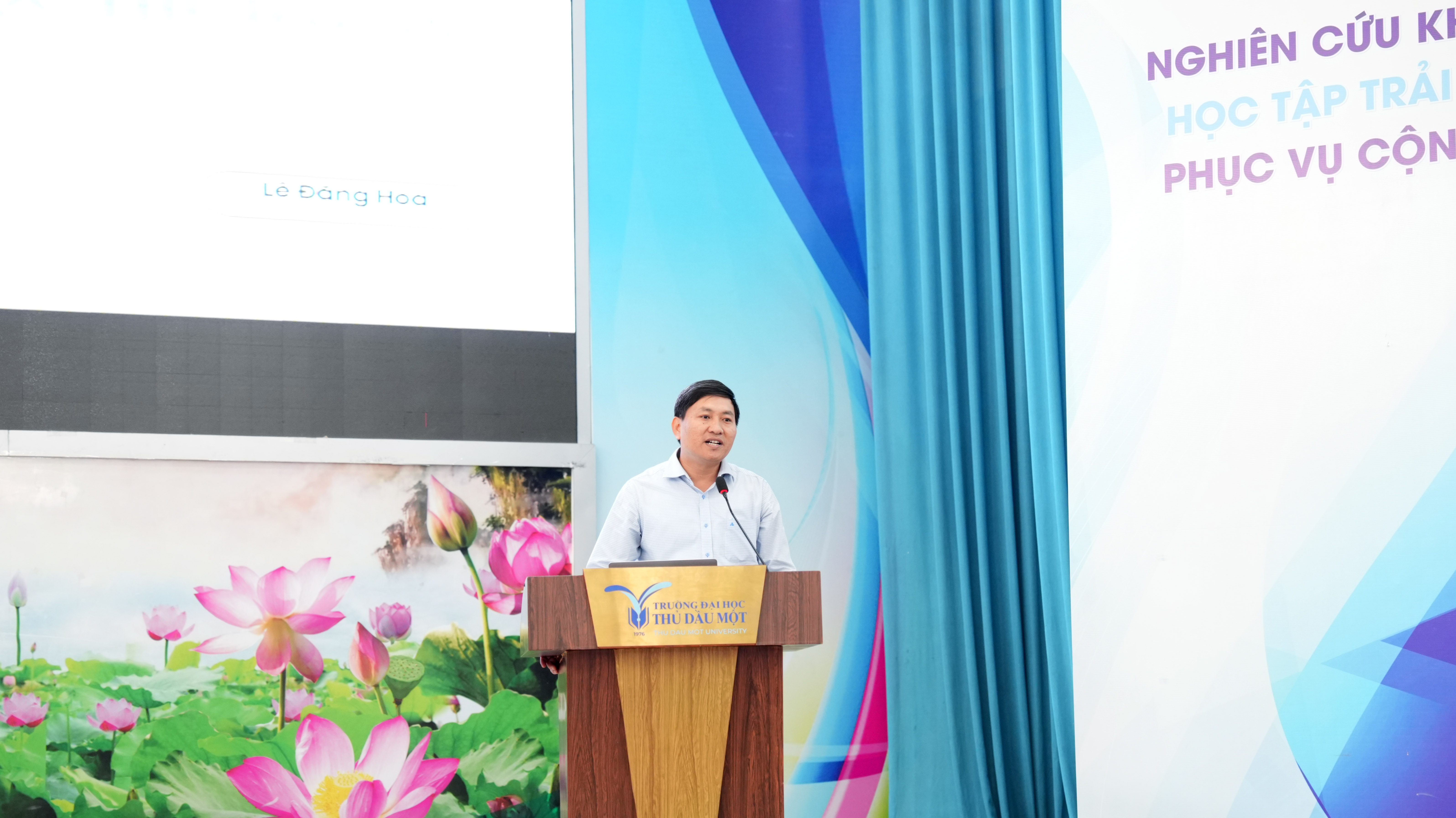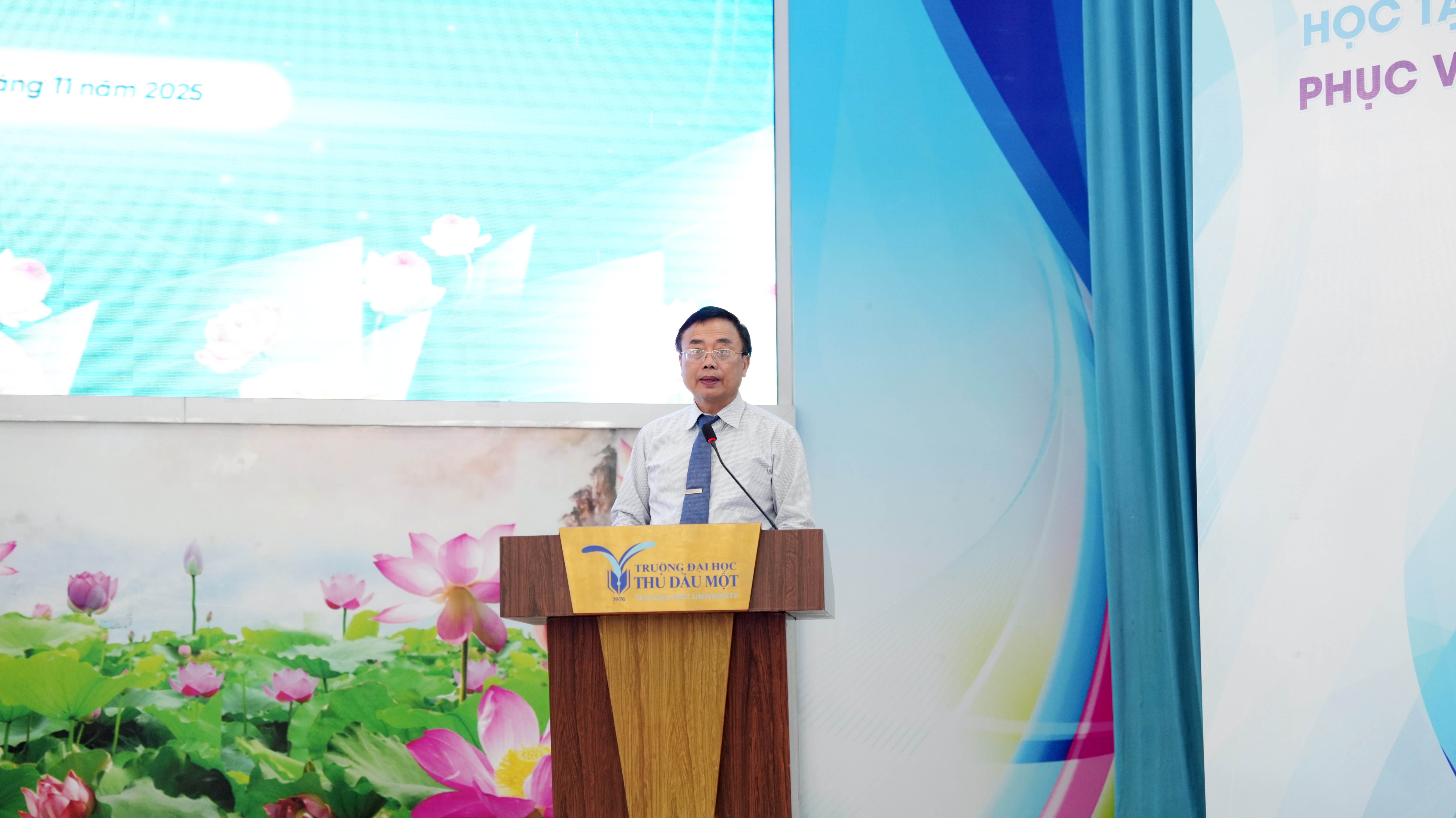 TS. Đoàn Ngọc Xuân – Hiệu trưởng phát biểu nhấn mạnh ý nghĩa và tầm quan trọng của chủ đề hội thảo, đồng thời khẳng định vai trò của tư duy thiết kế như một công cụ chiến lược trong đổi mới sáng tạo và thúc đẩy phát triển bền vững tại Trường Đại học Thủ Dầu Một