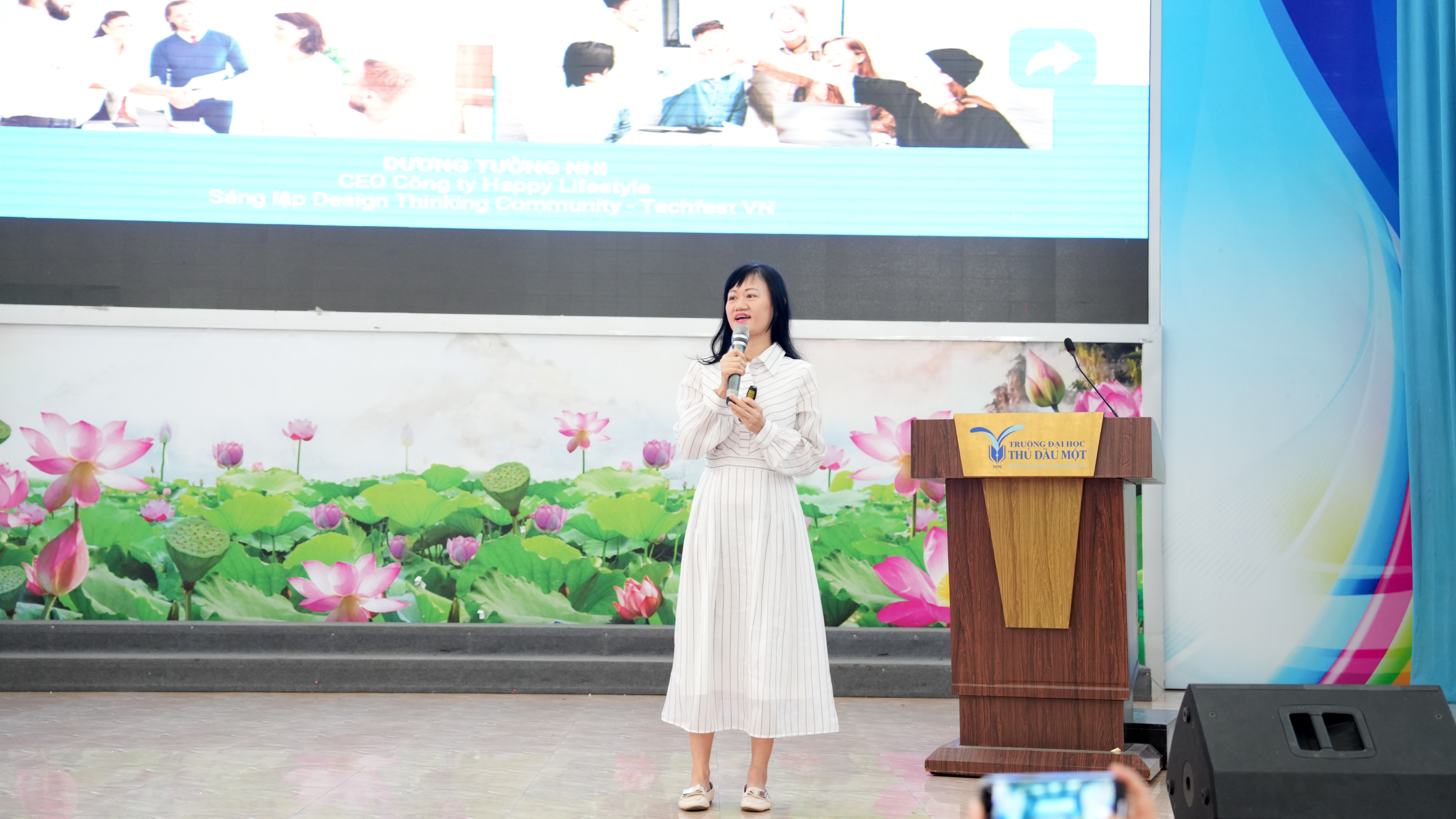 Tại phiên toàn thể, hội thảo đã lắng nghe nhiều tham luận chuyên sâu gắn trực tiếp với chủ đề đồng sáng tạo và ứng dụng tư duy thiết kế. Cụ thể, trong báo cáo “Tư duy thiết kế trong đổi mới sáng tạo”, bà Dương Tường Nhi mang đến góc nhìn về chuyển dịch từ đổi mới dựa trên công nghệ sang đổi mới dựa trên con người, nhấn mạnh nguyên tắc “thấu cảm trước khi hành động”. Đây cũng chính là nền tảng giúp giảng viên, sinh viên và đội ngũ quản lý Trường Đại học Thủ Dầu Một phát triển tư duy giáo dục nhân văn, sáng tạo và sát hợp nhu cầu thực tế của người học. Tiếp tục mở rộng chủ đề, bà Dương Tường Nhi trình bày tham luận “Workplace Wellness – Xây dựng môi trường làm việc hạnh phúc, sáng tạo và bền vững”, đề xuất mô hình “Đại học hạnh phúc”. Diễn giả cho chia sẻ, đây cũng là định hướng phù hợp với chiến lược phát triển của Trường Đại học Thủ Dầu Một trong những năm gần đây: xây dựng môi trường giáo dục nuôi dưỡng năng lượng tích cực, tạo điều kiện cho mỗi cá nhân sáng tạo, cân bằng và phát triển bền vững – hướng đến mục tiêu “sống khỏe – học sáng tạo – làm việc hạnh phúc”.