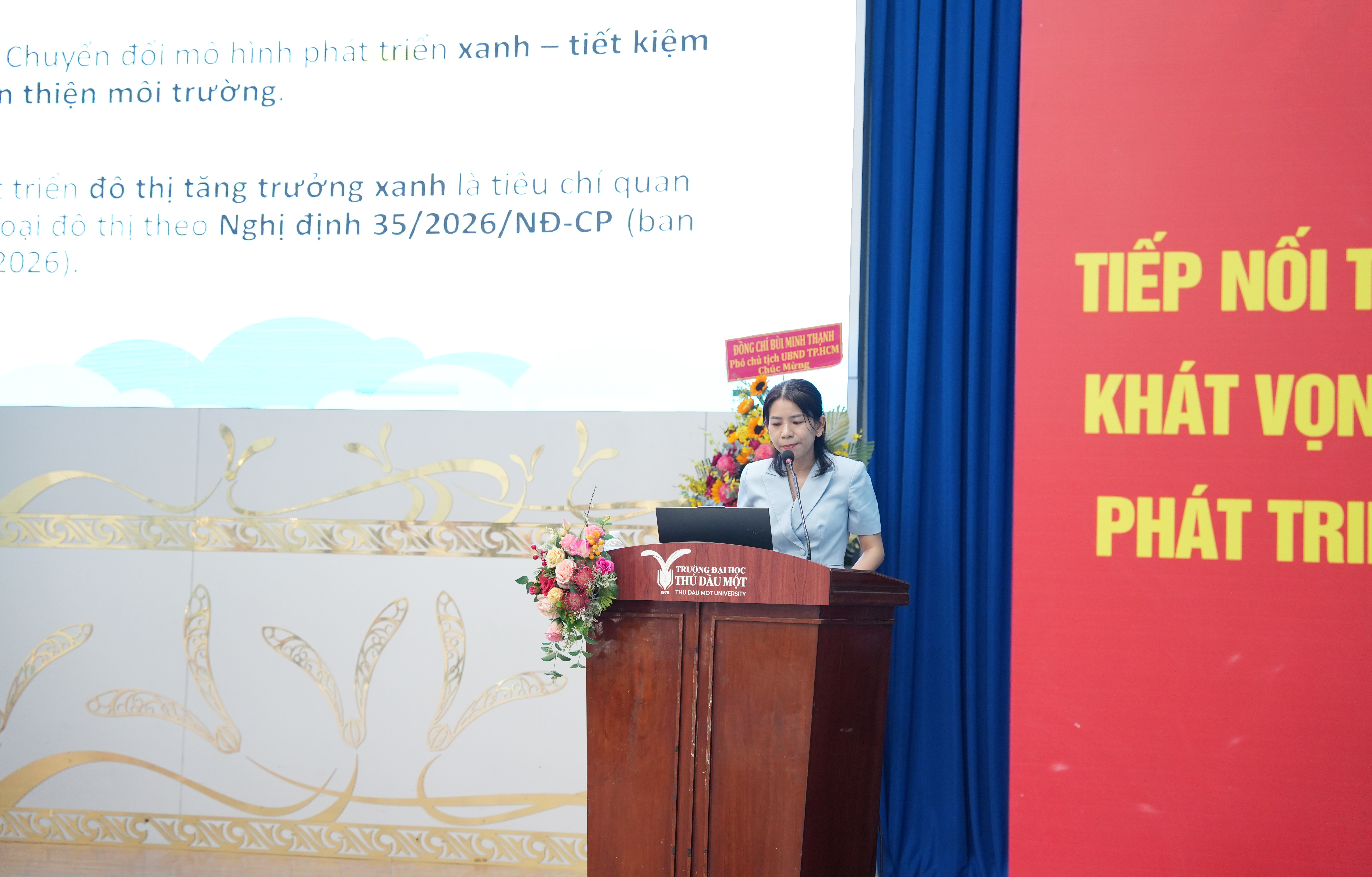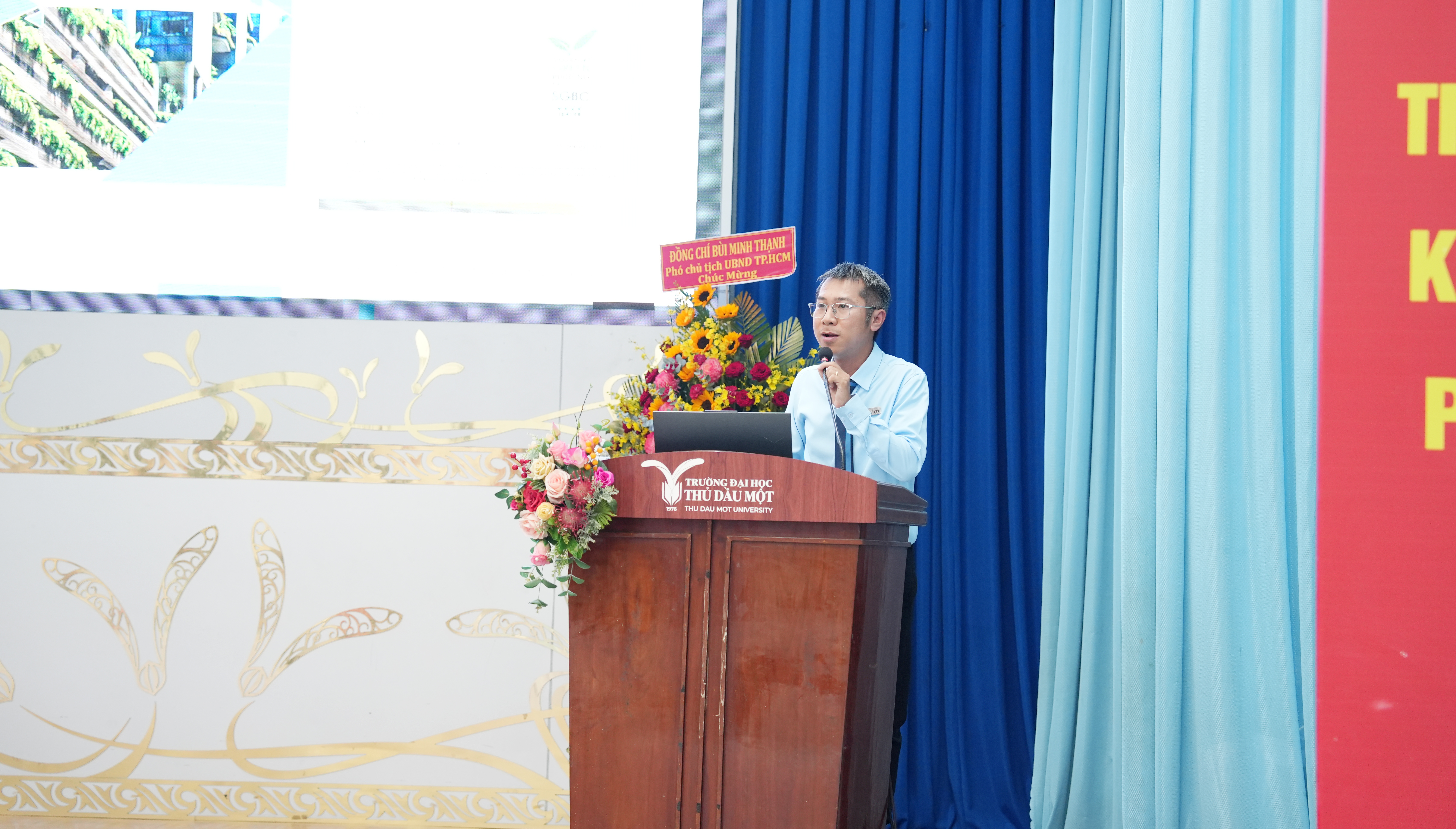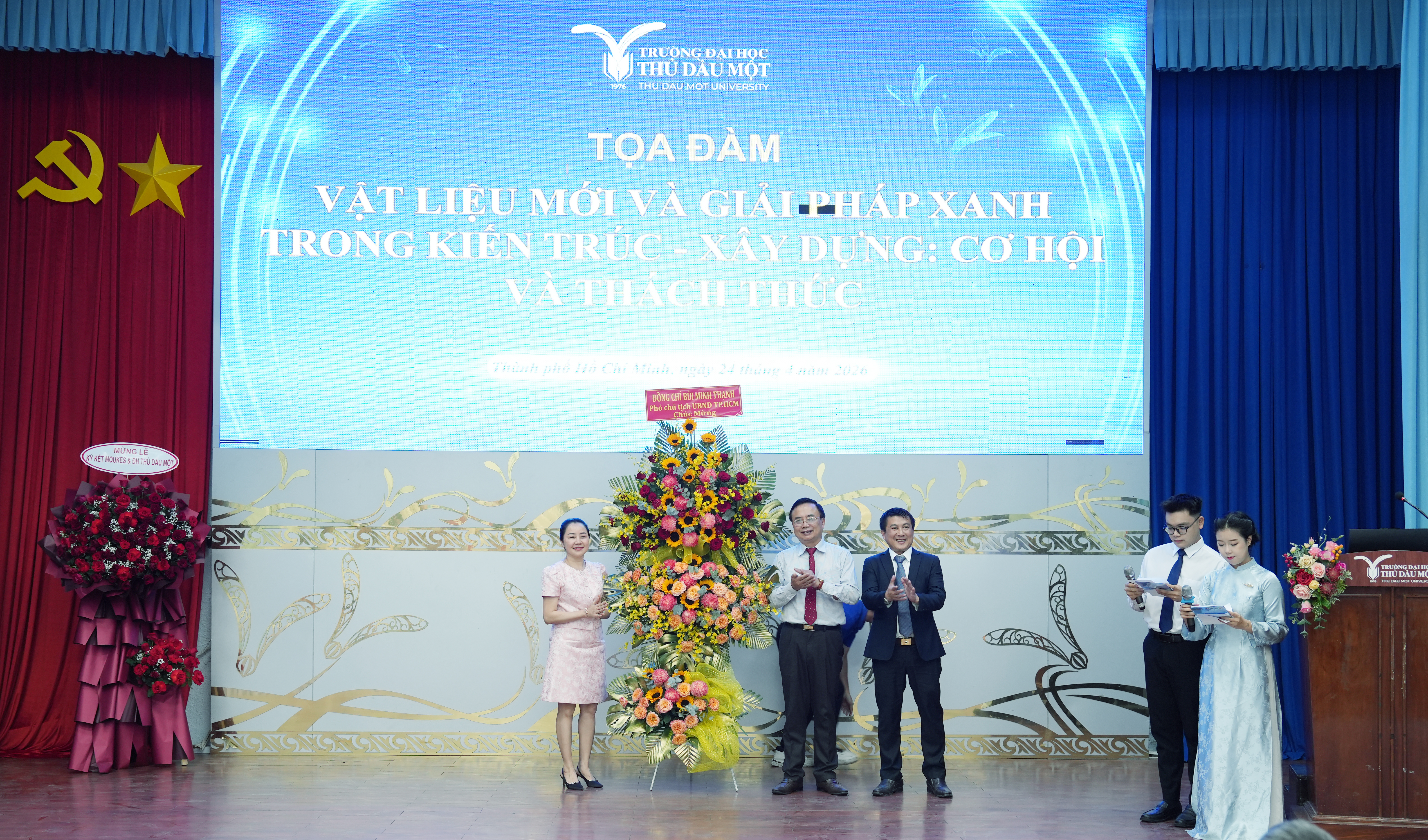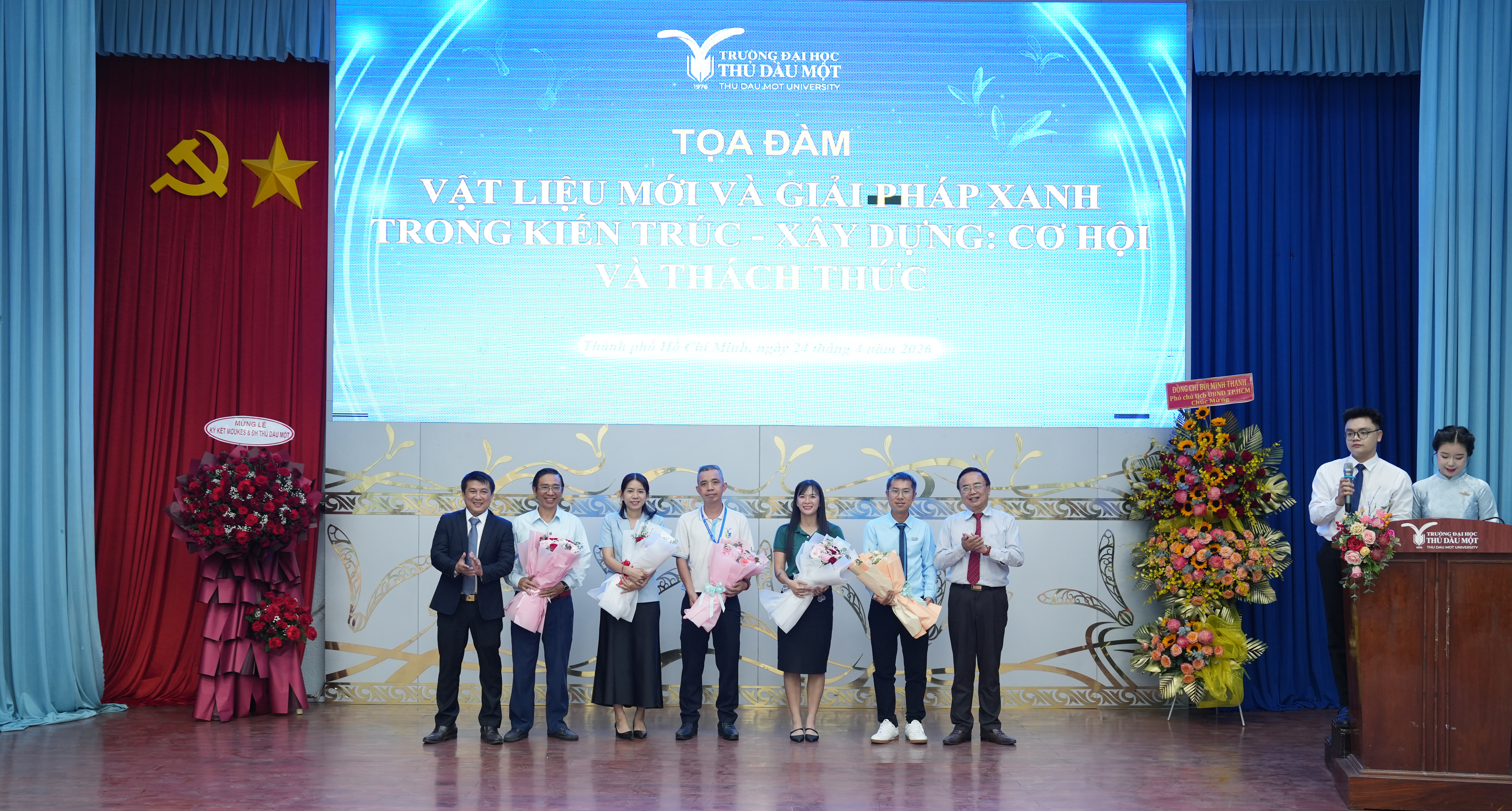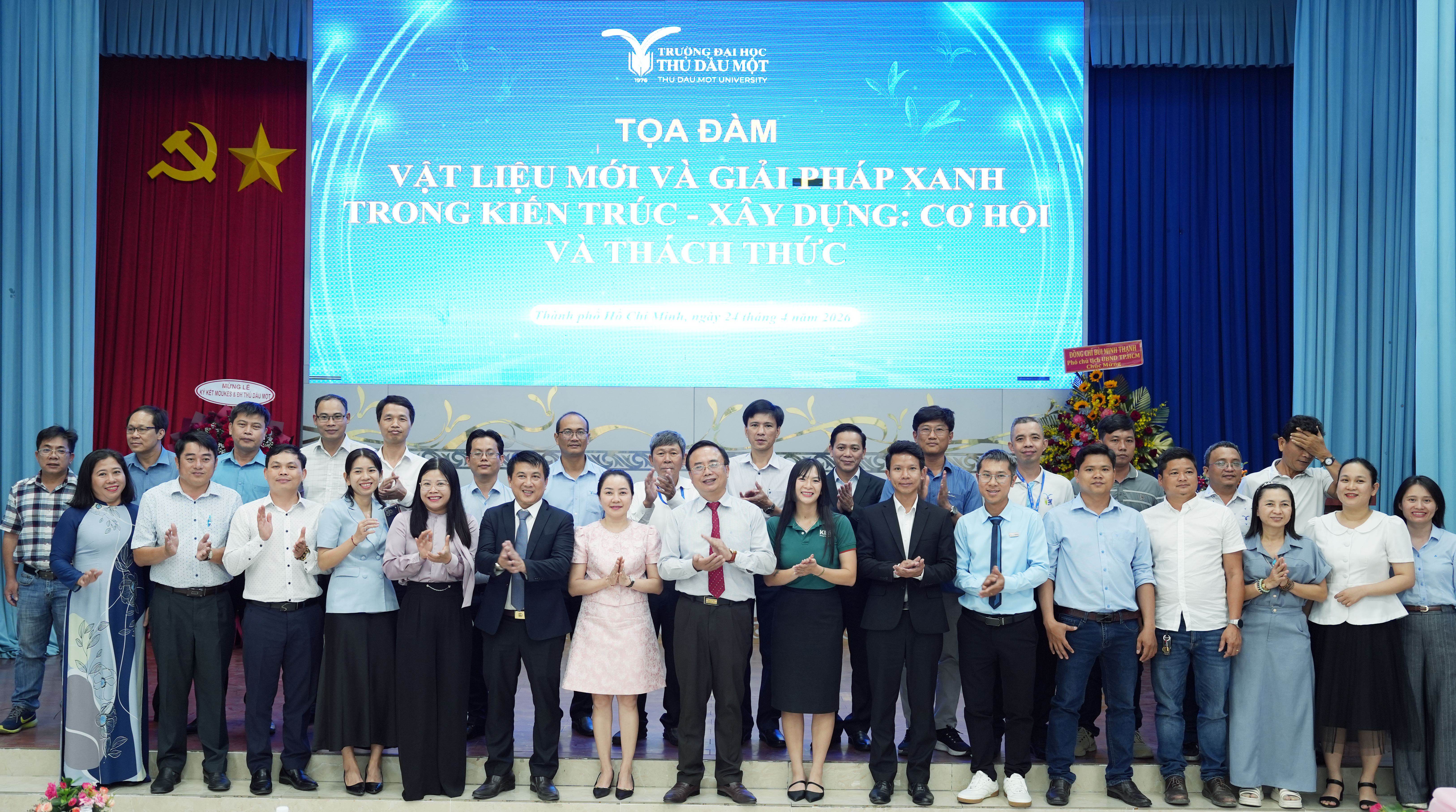 Phát biểu tại tọa đàm, TS. Đoàn Ngọc Xuân – Hiệu trưởng trân trọng cảm ơn sự tham gia và những chia sẻ tâm huyết của các chuyên gia, nhà quản lý và doanh nghiệp. TS. Đoàn Ngọc Xuân đánh giá cao các tham luận đã tiếp cận đúng những vấn đề cốt lõi của ngành kiến trúc – xây dựng trong bối cảnh hiện nay, từ xu hướng vật liệu mới, công trình xanh đến yêu cầu chuyển đổi theo hướng phát triển bền vững. Theo TS. Đoàn Ngọc Xuân, yếu tố “xanh”, “phát triển bền vững” không còn dừng ở góc độ kỹ thuật mà đã trở thành yêu cầu xuyên suốt trong chiến lược phát triển quốc gia. Trong kỷ nguyên mới, khi nền kinh tế đặt mục tiêu tăng trưởng cao, thậm chí hướng đến các chỉ số tăng trưởng hai con số, áp lực lên hạ tầng, không gian đô thị và tài nguyên là rất lớn. Điều này đòi hỏi ngành kiến trúc – xây dựng phải tìm ra các giải pháp vừa đảm bảo hiệu quả kinh tế, vừa kiểm soát tác động môi trường, hướng đến phát triển bền vững và lâu dài. TS. Đoàn Ngọc Xuân cho rằng, những nội dung được trao đổi tại tọa đàm không chỉ mang tính học thuật mà còn có giá trị thực tiễn rõ rệt, góp phần gợi mở các hướng tiếp cận trong quy hoạch, thiết kế và phát triển hạ tầng, đặc biệt trong bối cảnh mở rộng không gian đô thị và kết nối vùng. Đây cũng là những vấn đề gắn trực tiếp với yêu cầu phát triển của khu vực phía Bắc TP.HCM và vùng lân cận, nơi Trường Đại học Thủ Dầu Một đang đóng vai trò là cơ sở đào tạo, nghiên cứu và cung cấp nguồn nhân lực.