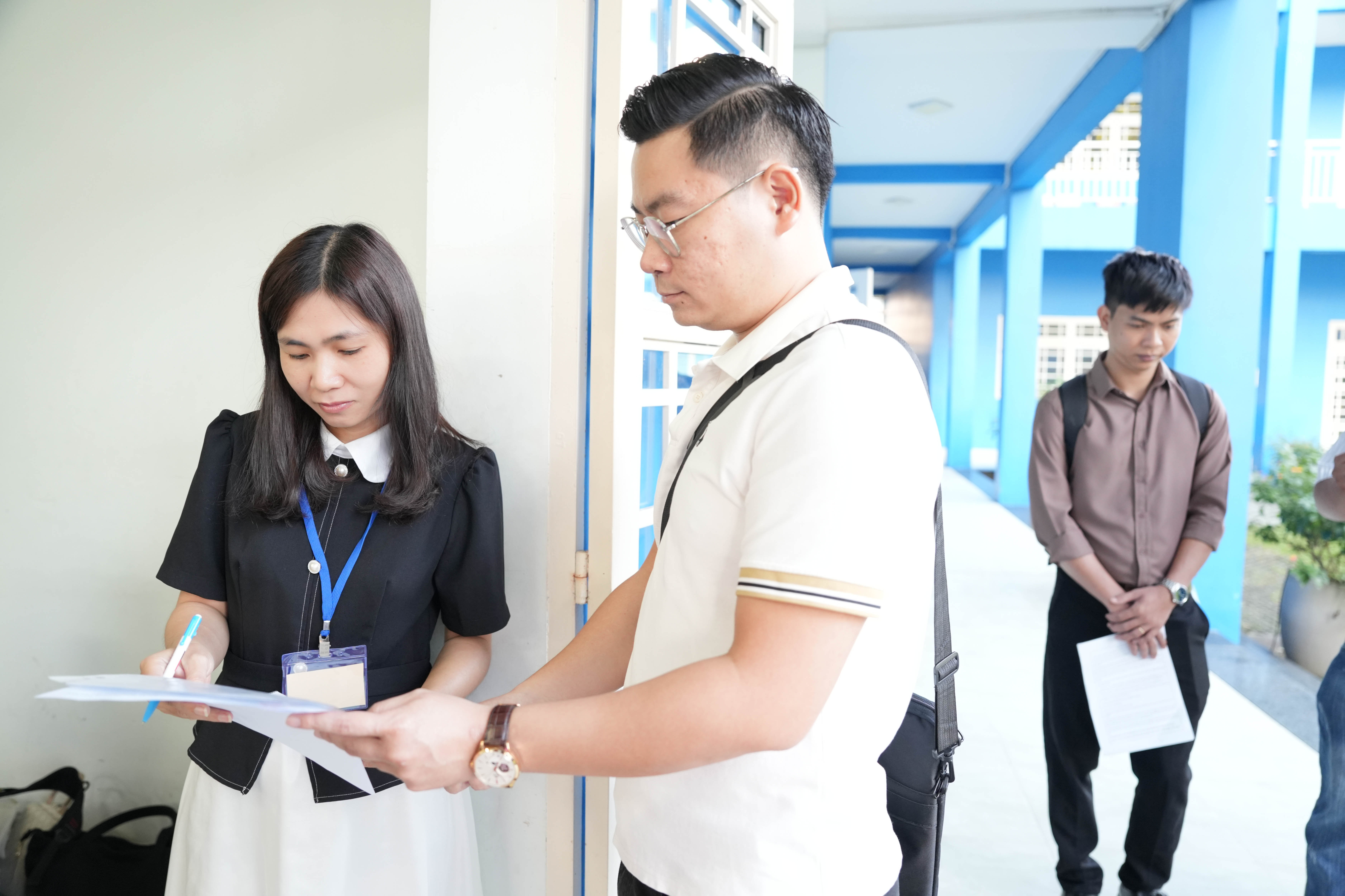 Trước khi vào phòng thi, cán bộ coi thi kiểm tra các loại giấy tờ của ứng viên dự thi theo quy định