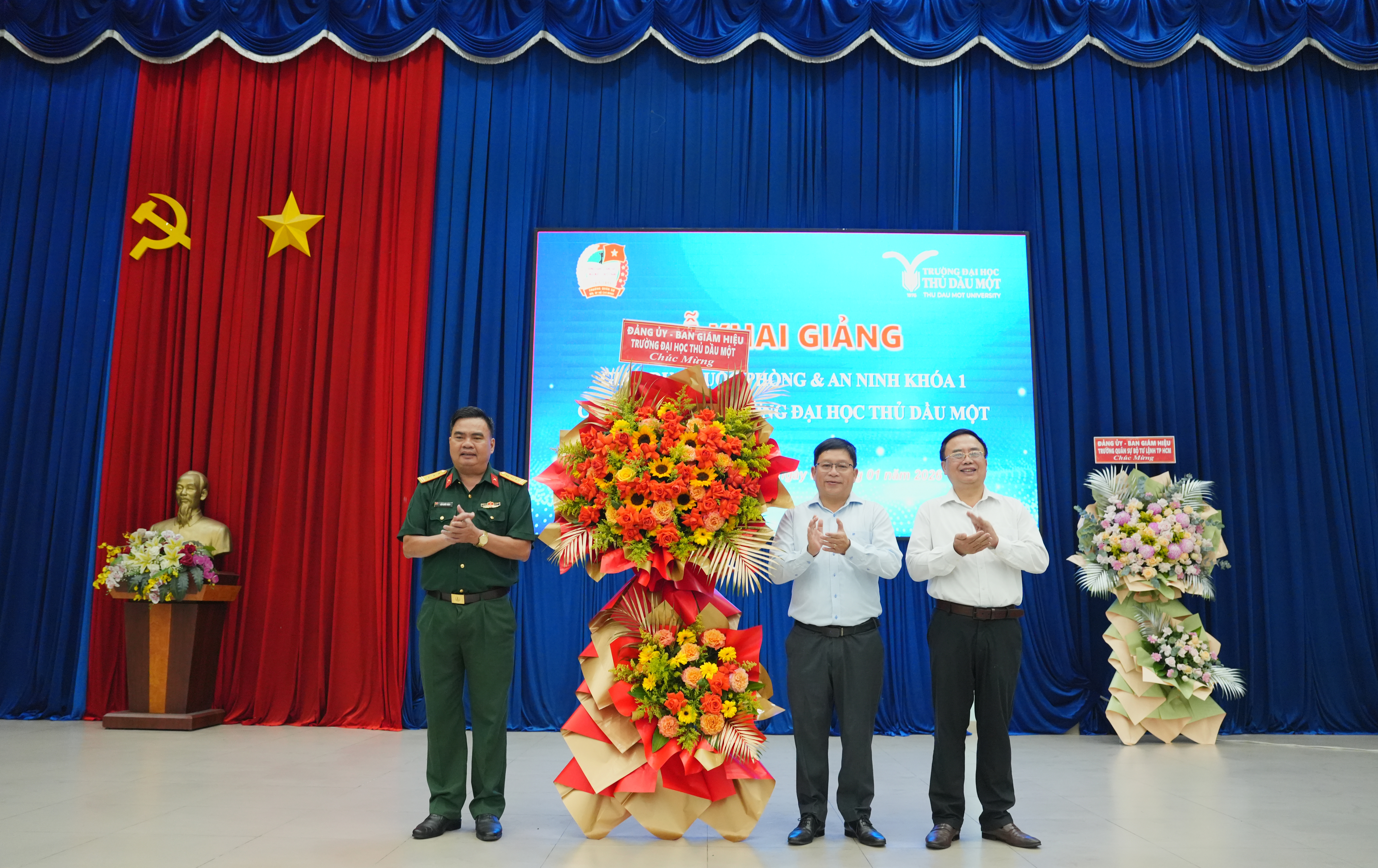 PGS.TS. Lê Tuấn Anh – Bí thư Đảng ủy và TS. Đoàn Ngọc Xuân – Hiệu trưởng Trường Đại học Thủ Dầu Một tặng lẵng hoa chúc mừng lễ khai giảng khóa học Giáo dục Quốc phòng và An ninh