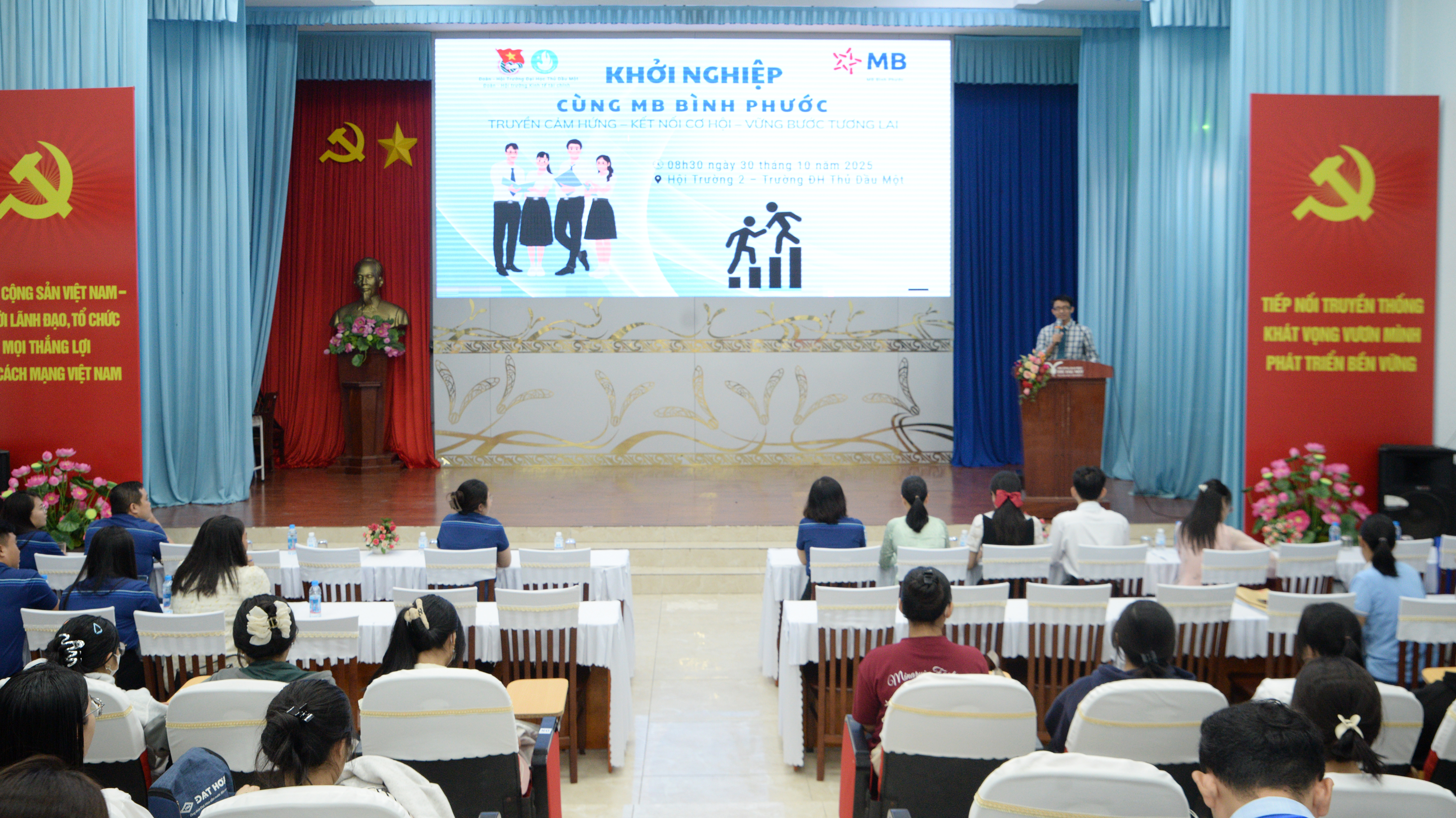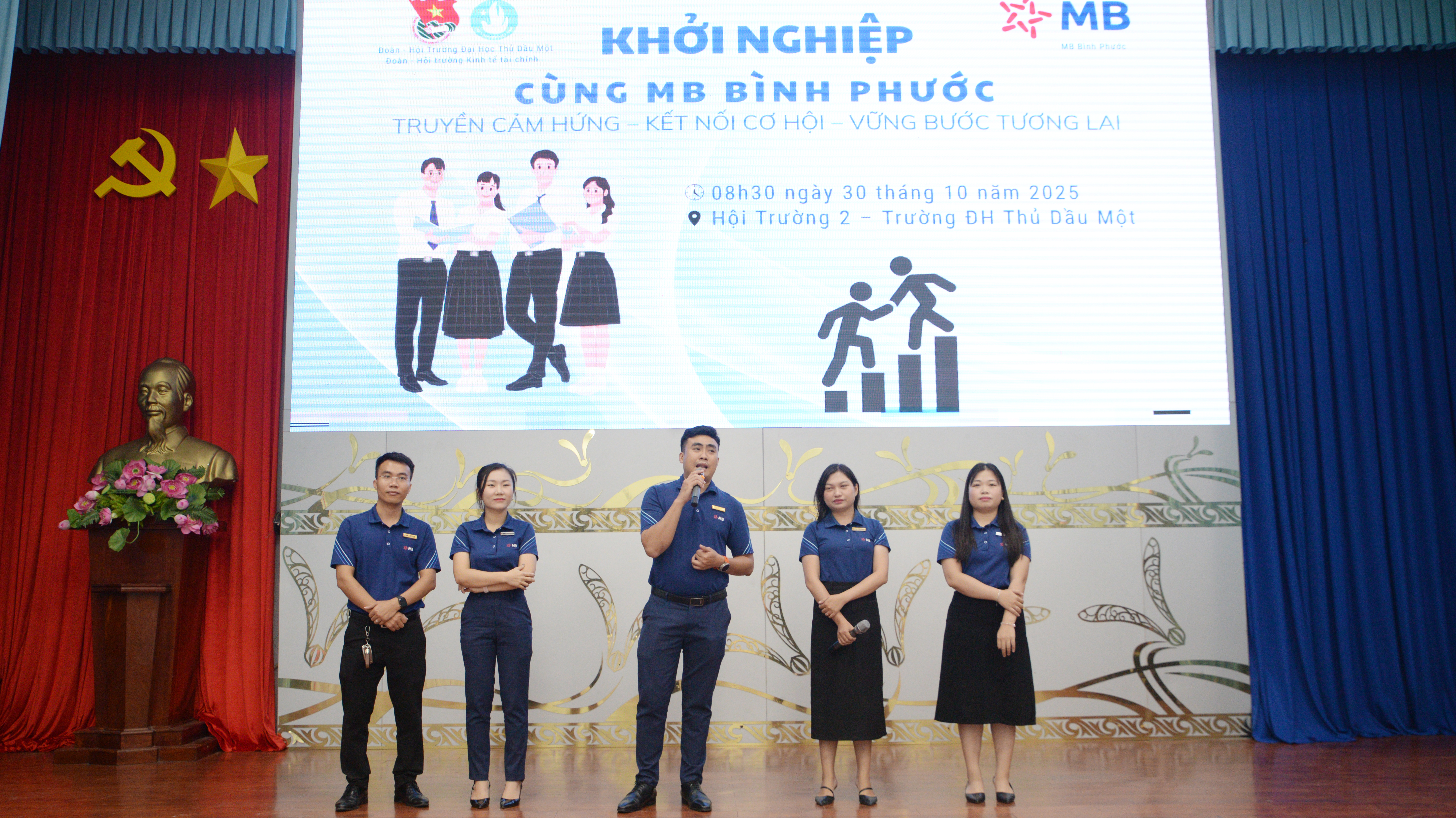 Sáng ngày 30/10/2025, Trường Kinh tế - Tài chính, Trường Đại học Thủ Dầu Một phối hợp với Ngân hàng TMCP Quân đội – Chi nhánh Bình Phước (MB Bình Phước) tổ chức chương trình “Khởi nghiệp cùng MB Bình Phước”. Chương trình là dịp để sinh viên tìm hiểu sâu hơn về môi trường làm việc, văn hóa doanh nghiệp và các cơ hội nghề nghiệp tại MB.