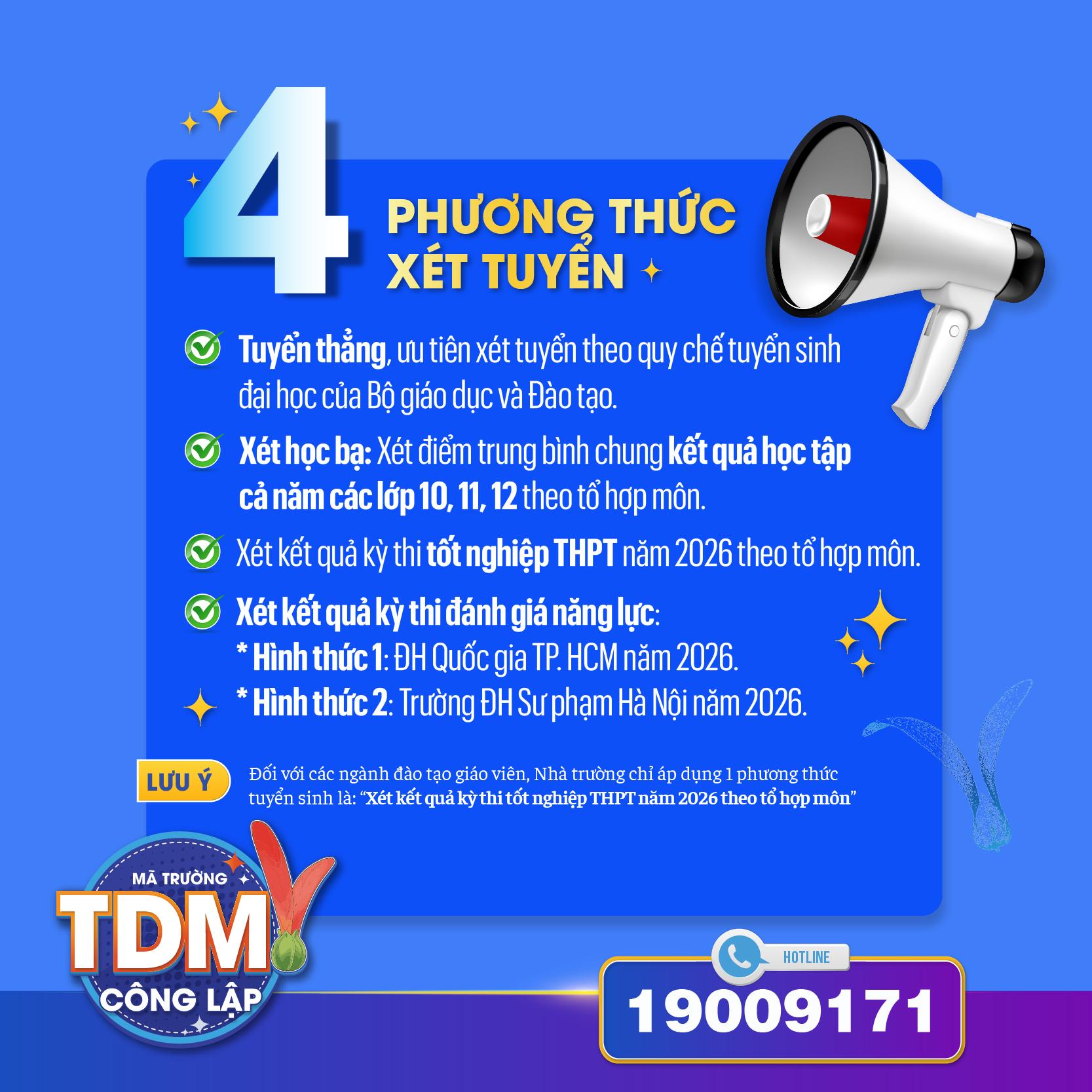 Trong kỳ tuyển sinh năm 2026, Trường Đại học Thủ Dầu Một áp dụng 4 phương thức tuyển sinh, gồm: