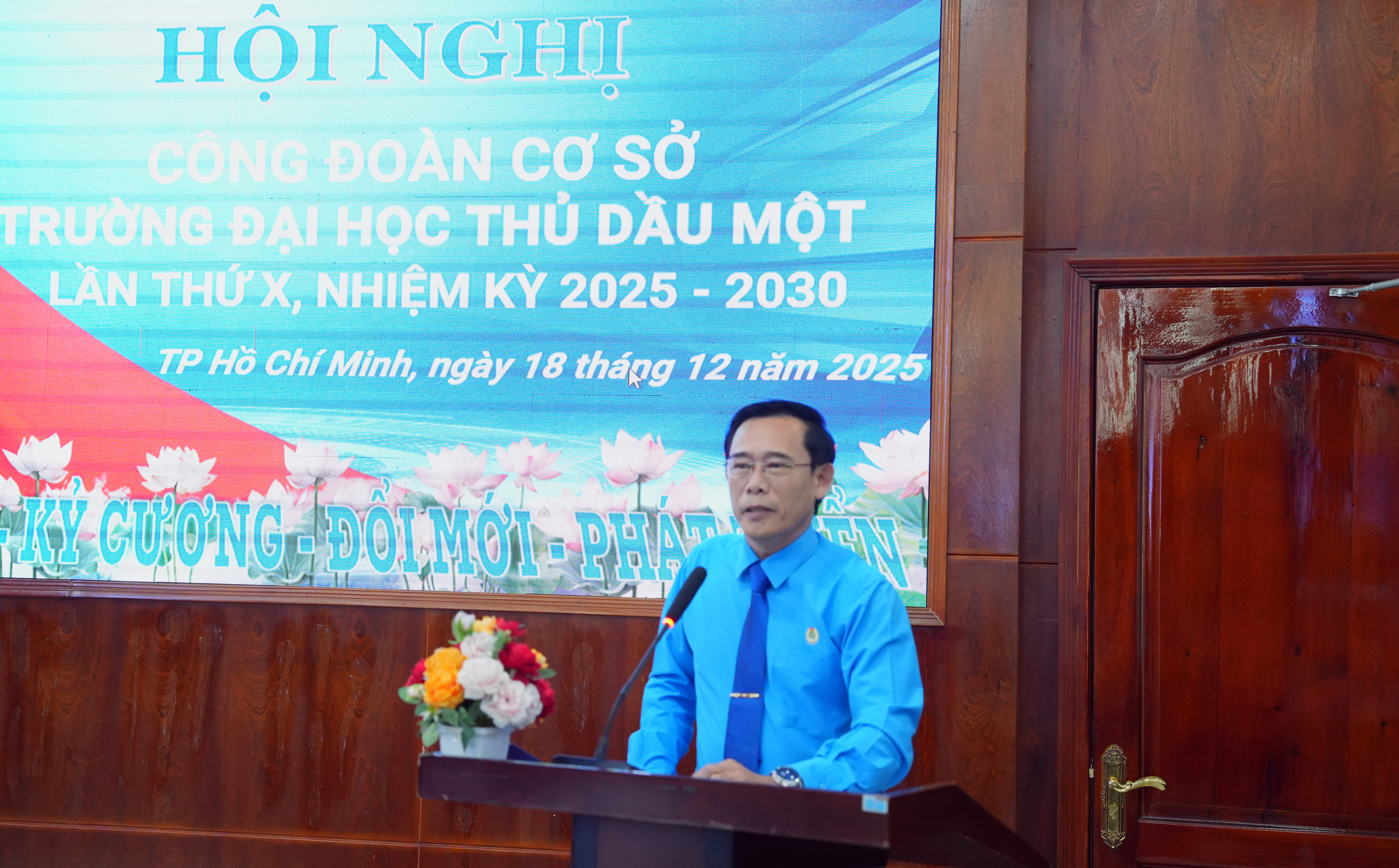 Tham dự và phát biểu chỉ đạo tại hội nghị, ông Nguyễn Văn Đức – Ủy viên Ban Thường vụ Liên đoàn Lao động TP. Hồ Chí Minh đánh giá cao những sáng kiến, cách làm của Công đoàn Trường Đại học Thủ Dầu Một trong việc gắn hoạt động công đoàn với nhiệm vụ chính trị, chuyên môn của nhà trường, qua đó phát huy tốt vai trò đại diện, chăm lo, bảo vệ quyền và lợi ích hợp pháp, chính đáng của đoàn viên, người lao động. Ông Nguyễn Văn Đức đề nghị trong nhiệm kỳ tới, Công đoàn Trường cần tiếp tục chấp hành nghiêm sự lãnh đạo, chỉ đạo của Đảng ủy, Ban Giám hiệu nhà trường; bám sát chức năng, nhiệm vụ của tổ chức công đoàn, trọng tâm là công tác bảo vệ quyền, lợi ích hợp pháp của đoàn viên; đẩy mạnh tuyên truyền, giáo dục, nâng cao nhận thức, trách nhiệm của viên chức, người lao động trong thực hiện nhiệm vụ được giao. Bên cạnh đó, Công đoàn cần nắm vững các chủ trương, đường lối của Đảng, chính sách, pháp luật của Nhà nước, sự chỉ đạo của công đoàn cấp trên; kịp thời cụ thể hóa thành chương trình hành động, nghị quyết và kế hoạch hoạt động phù hợp với điều kiện thực tiễn của đơn vị. Đồng thời, tiếp tục thực hiện tốt chức năng, nhiệm vụ của tổ chức công đoàn trong tình hình mới; không ngừng nâng cao bản lĩnh chính trị, trình độ chuyên môn, kỹ năng hoạt động công đoàn để đáp ứng yêu cầu ngày càng cao trong giai đoạn phát triển mới. Ông Nguyễn Văn Đức cũng nhấn mạnh yêu cầu Công đoàn Trường quan tâm xây dựng, hoàn thiện quy chế hoạt động, xác định rõ nhiệm vụ của từng tổ chức, bộ phận; đưa các nhiệm vụ công đoàn vào chương trình, kế hoạch hoạt động thường xuyên, bảo đảm tính thiết thực, hiệu quả. Cùng với đó, đẩy mạnh công tác vận động đoàn viên tích cực tham gia các phong trào thi đua yêu nước, góp phần xây dựng đội ngũ viên chức, người lao động đoàn kết, trách nhiệm, đồng hành cùng sự phát triển bền vững của Trường Đại học Thủ Dầu Một.