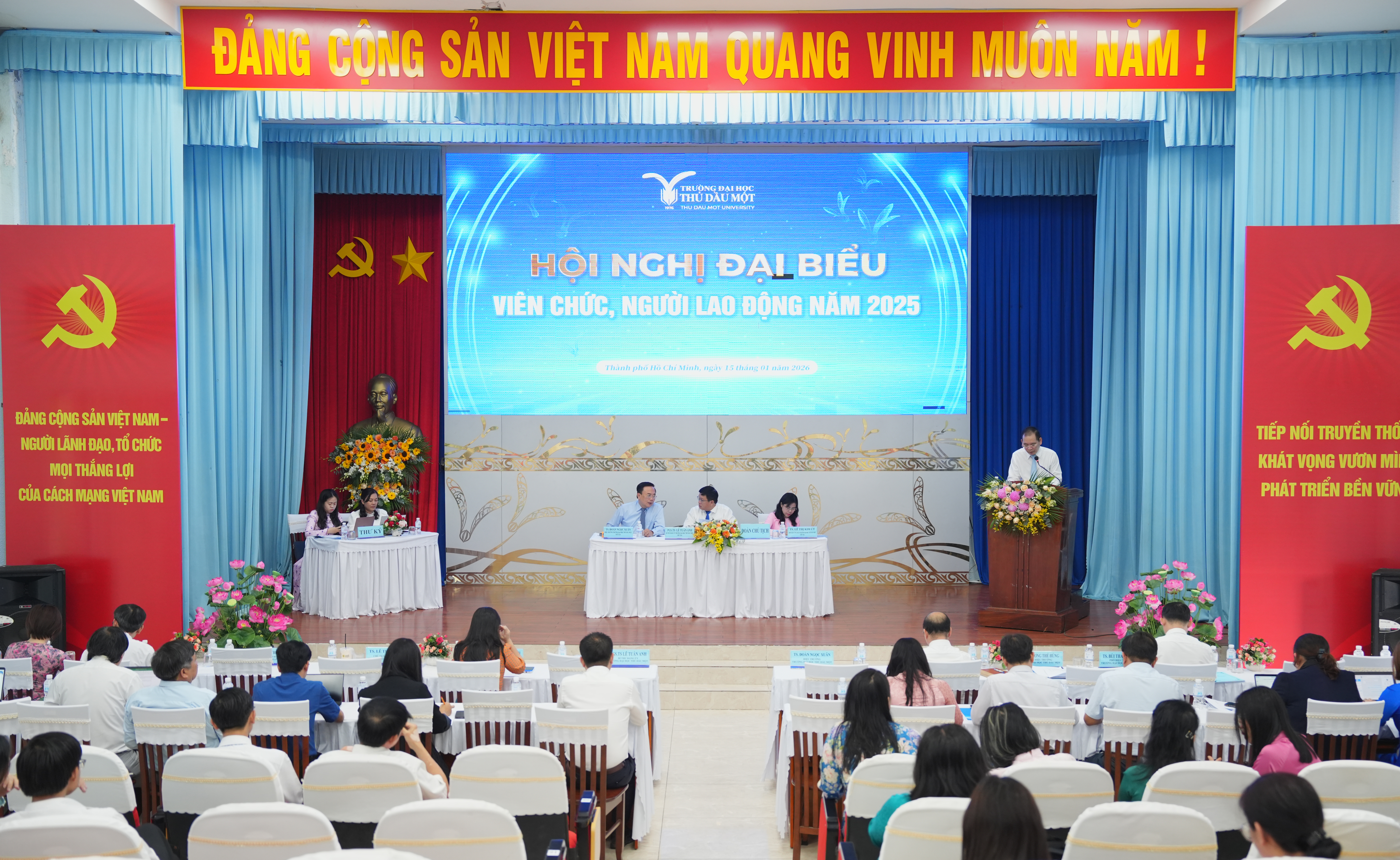 Ngày 15/01/2026, Trường Đại học Thủ Dầu Một long trọng tổ chức Hội nghị Đại biểu Cán bộ, Viên chức, Người lao động năm 2025. Hội nghị là diễn đàn quan trọng, phát huy quyền làm chủ của viên chức, người lao động, tạo điều kiện để đối thoại trực tiếp với lãnh đạo nhà trường về việc thực hiện chức năng, nhiệm vụ, trách nhiệm và quyền lợi theo quy định.