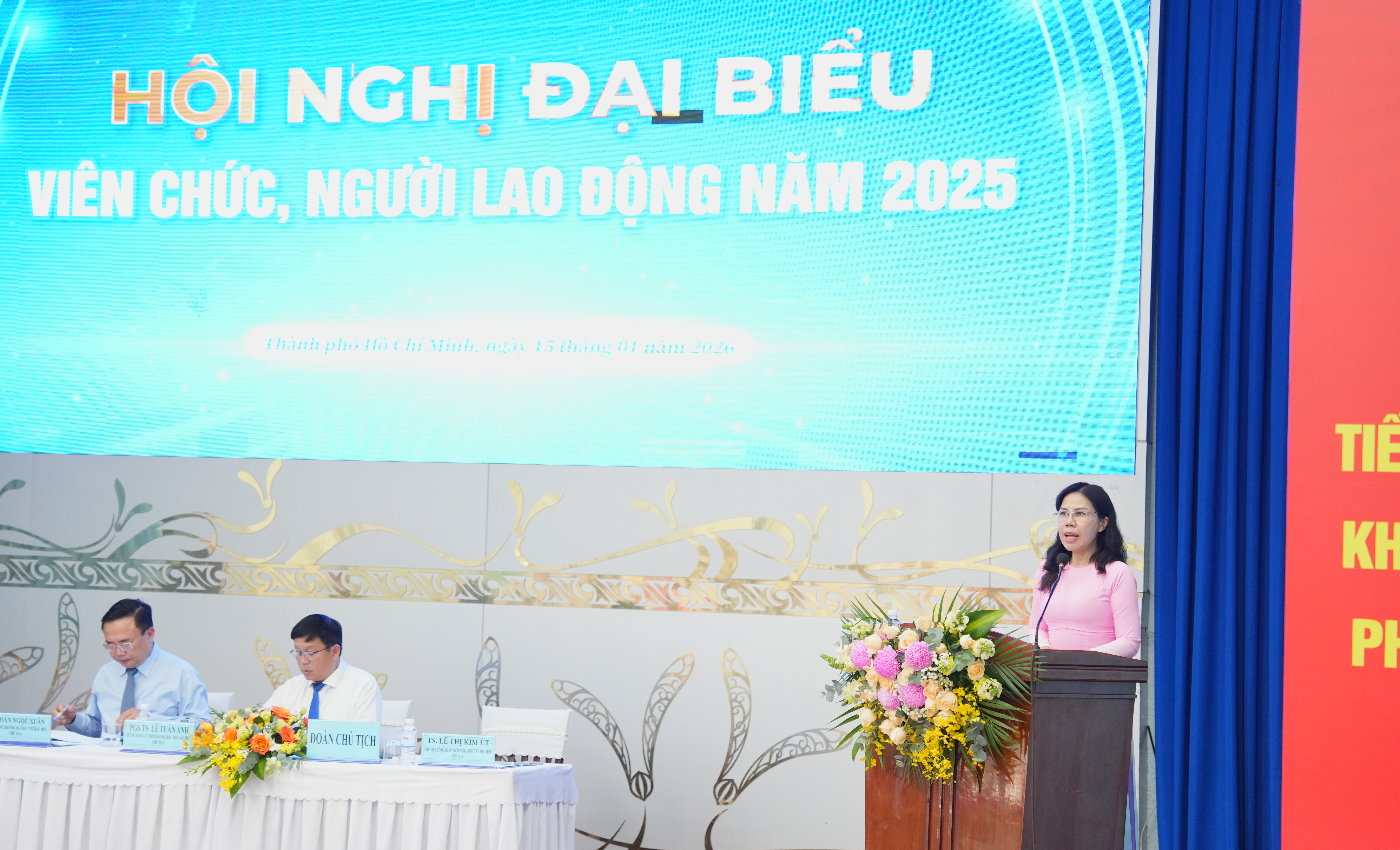 TS. Lê Thị Kim Út – Chủ tịch Công đoàn trường trình bày báo cáo kiểm điểm việc thực hiện Nghị quyết Hội nghị VC, NLĐ năm 2025