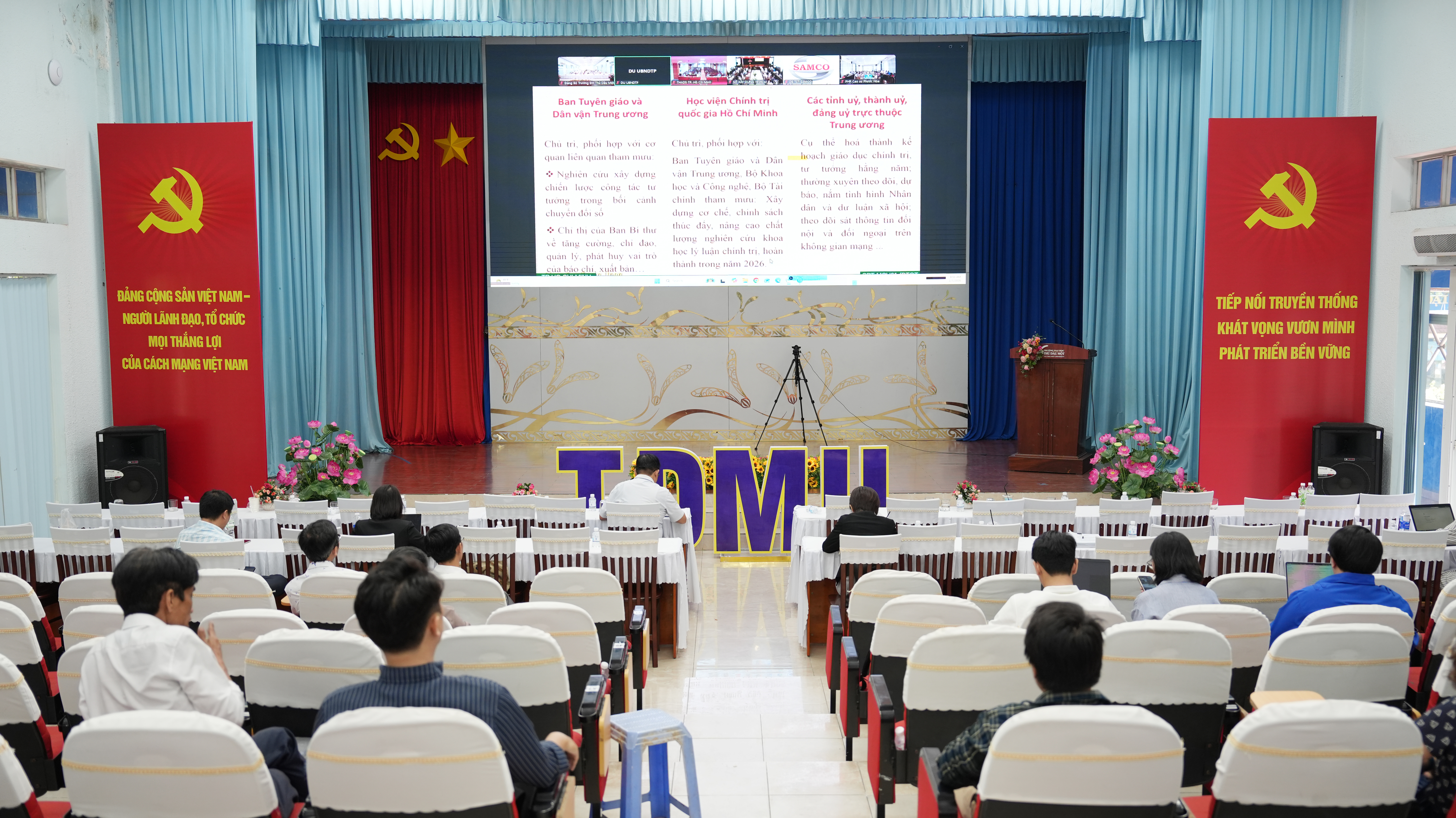 Tại điểm cầu Trường Đại học Thủ Dầu Một, hội nghị có sự tham dự của PGS.TS Lê Tuấn Anh – Bí thư Đảng ủy; TS. Đoàn Ngọc Xuân – Hiệu trưởng; ThS. Trần Văn Nam – Phó Bí thư Đảng ủy; PGS.TS Ngô Hồng Điệp – Phó Hiệu trưởng; cùng các đồng chí trong Ban Chấp hành Đảng bộ Trường, cấp ủy các chi bộ, đảng bộ bộ phận, đảng viên và lãnh đạo các đơn vị thuộc, trực thuộc nhà trường.