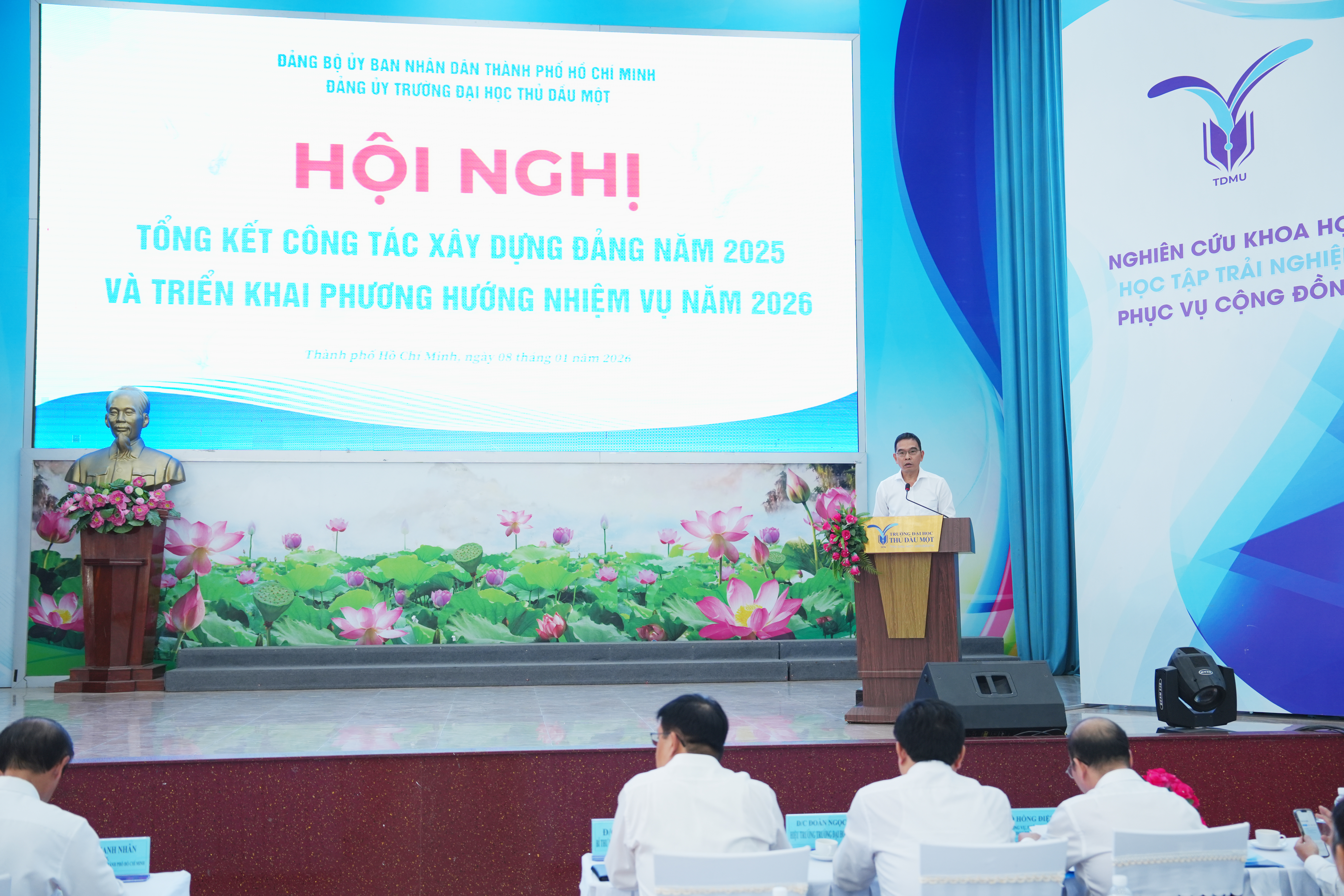 Về phương hướng, nhiệm vụ thời gian tới, đồng chí Huỳnh Tân Định nhấn mạnh năm 2026 là năm có ý nghĩa đặc biệt quan trọng, là năm đầu triển khai thực hiện Nghị quyết Đại hội Đảng bộ Thành phố Hồ Chí Minh lần thứ I, nhiệm kỳ 2025–2030, Nghị quyết Đại hội Đảng bộ Trường Đại học Thủ Dầu Một lần thứ VII, nhiệm kỳ 2025–2030 và tổ chức thực hiện Luật Giáo dục đại học năm 2025. Trên cơ sở đó, Đảng ủy Trường cần tập trung lãnh đạo, chỉ đạo toàn diện các mặt công tác; quán triệt và tổ chức thực hiện nghiêm túc các nghị quyết của Trung ương, Thành ủy và Đảng ủy UBND Thành phố. Đồng chí yêu cầu nhà trường tiếp tục đẩy mạnh việc học tập và làm theo tư tưởng, đạo đức, phong cách Hồ Chí Minh; tổ chức quán triệt, cụ thể hóa và triển khai thực hiện nghiêm Quy định số 144-QĐ/TW ngày 09/5/2024 của Bộ Chính trị về chuẩn mực đạo đức cách mạng của cán bộ, đảng viên trong giai đoạn mới, gắn với trách nhiệm nêu gương, tu dưỡng, rèn luyện phẩm chất đạo đức, lối sống của cán bộ, đảng viên, nhất là người đứng đầu. Đồng thời, đẩy mạnh xây dựng Không gian văn hóa Hồ Chí Minh trong Nhà trường theo hướng thiết thực, hiệu quả, phù hợp với đặc thù và bản sắc của từng đơn vị.