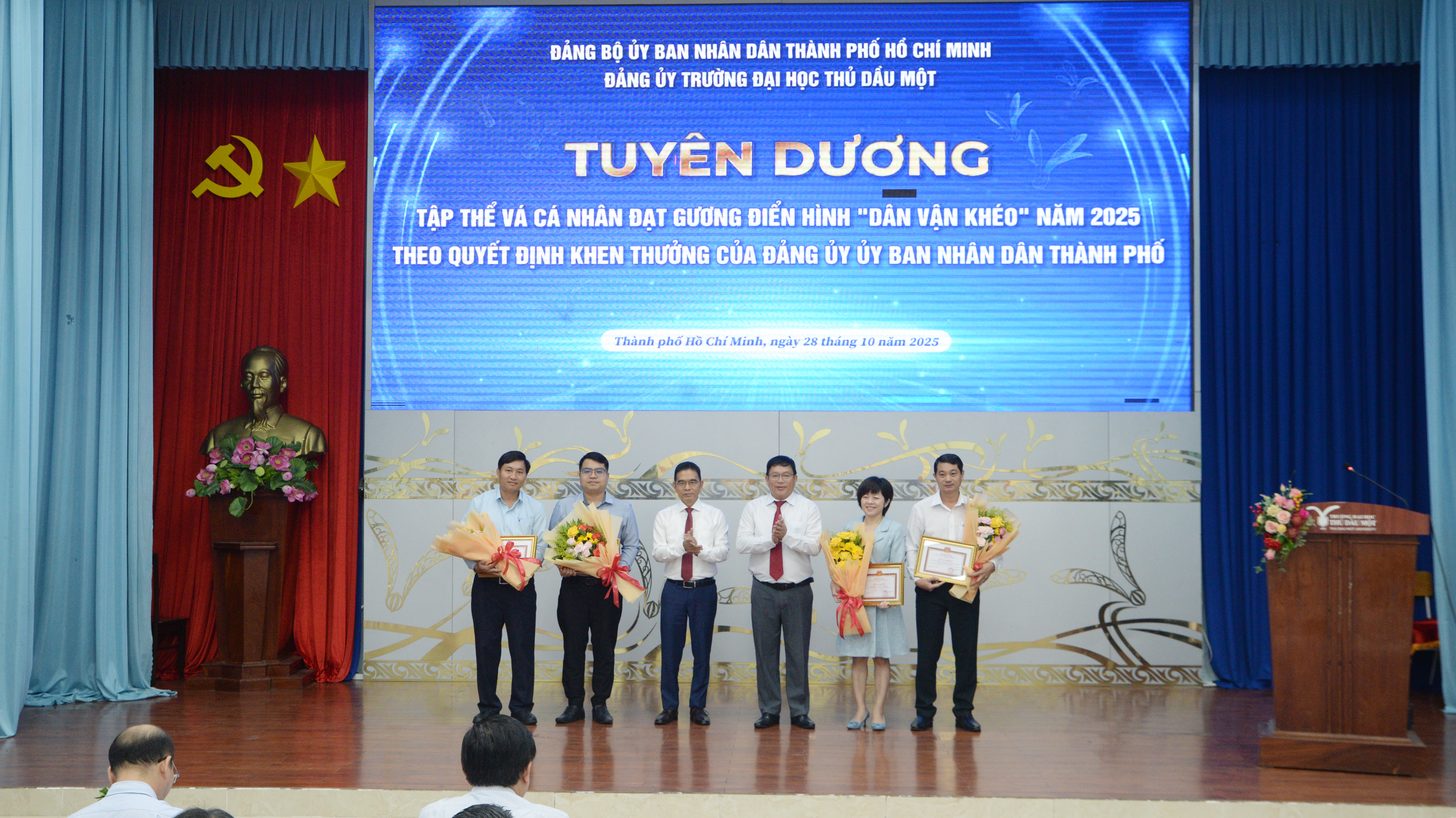 Dịp này, Đảng ủy Trường trân trọng tuyên dương 02 tập thể và 03 cá nhân đã được Đảng ủy UBND Thành phố Hồ Chí Minh tặng giấy khen đạt gương điền hình “Dân vận khéo” năm 2025 theo Quyết định số 200-QĐ/ĐU ngày 15/10/2025.