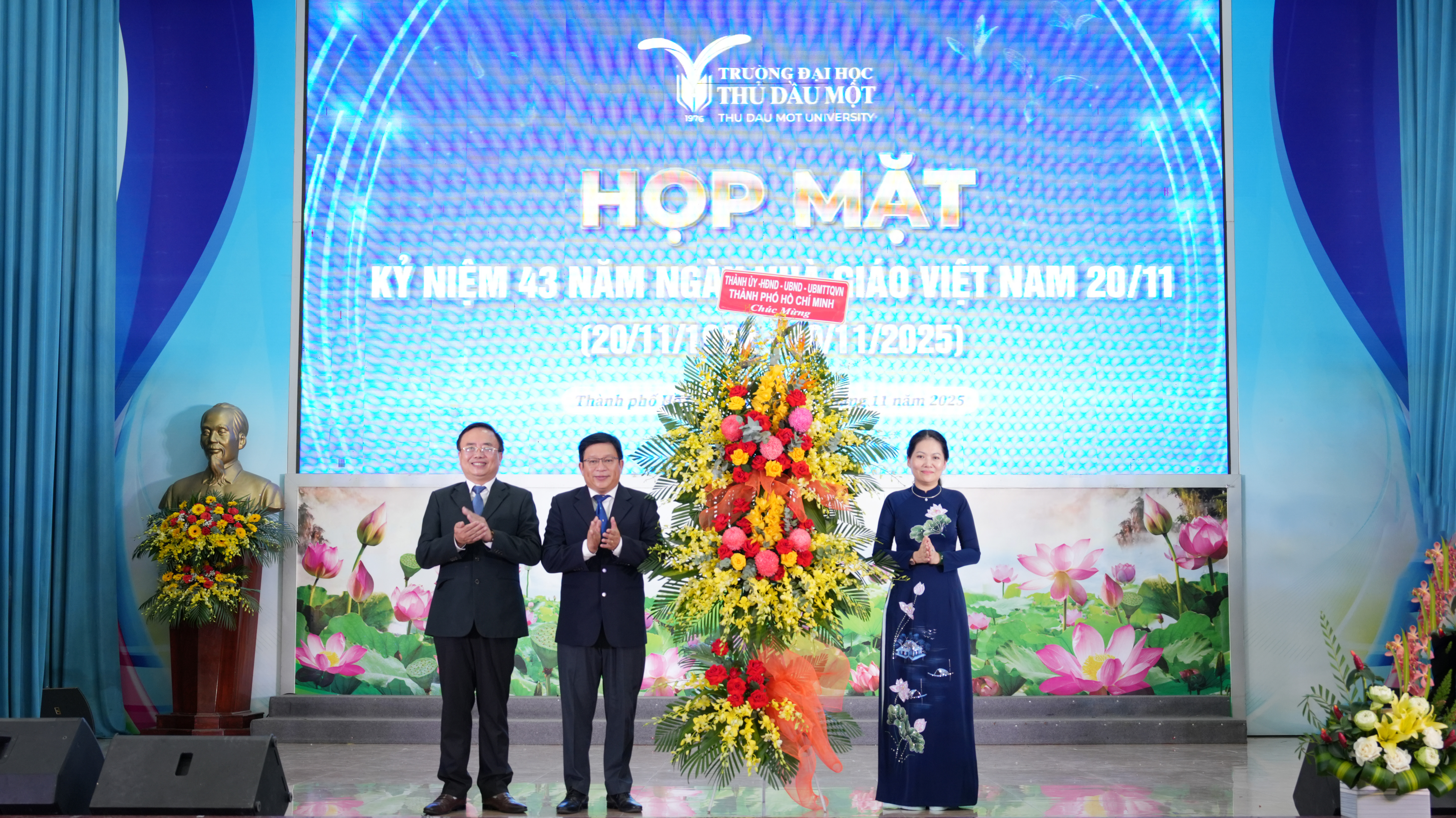 Ngày 19/11/2025, Trường Đại học Thủ Dầu Một long trọng tổ chức chương trình Họp mặt kỷ niệm 43 năm Ngày Nhà giáo Việt Nam (20/11/1982 – 20/11/2025). Buổi lễ là dịp để cán bộ, giảng viên nhà trường qua các thời kỳ cùng nhau ôn lại truyền thống của ngành giáo dục, tôn vinh những thành tựu, những đóng góp của quý thầy cô giáo đối với sự nghiệp giáo dục của tỉnh nói chung và của trường Đại học Thủ Dầu Một.