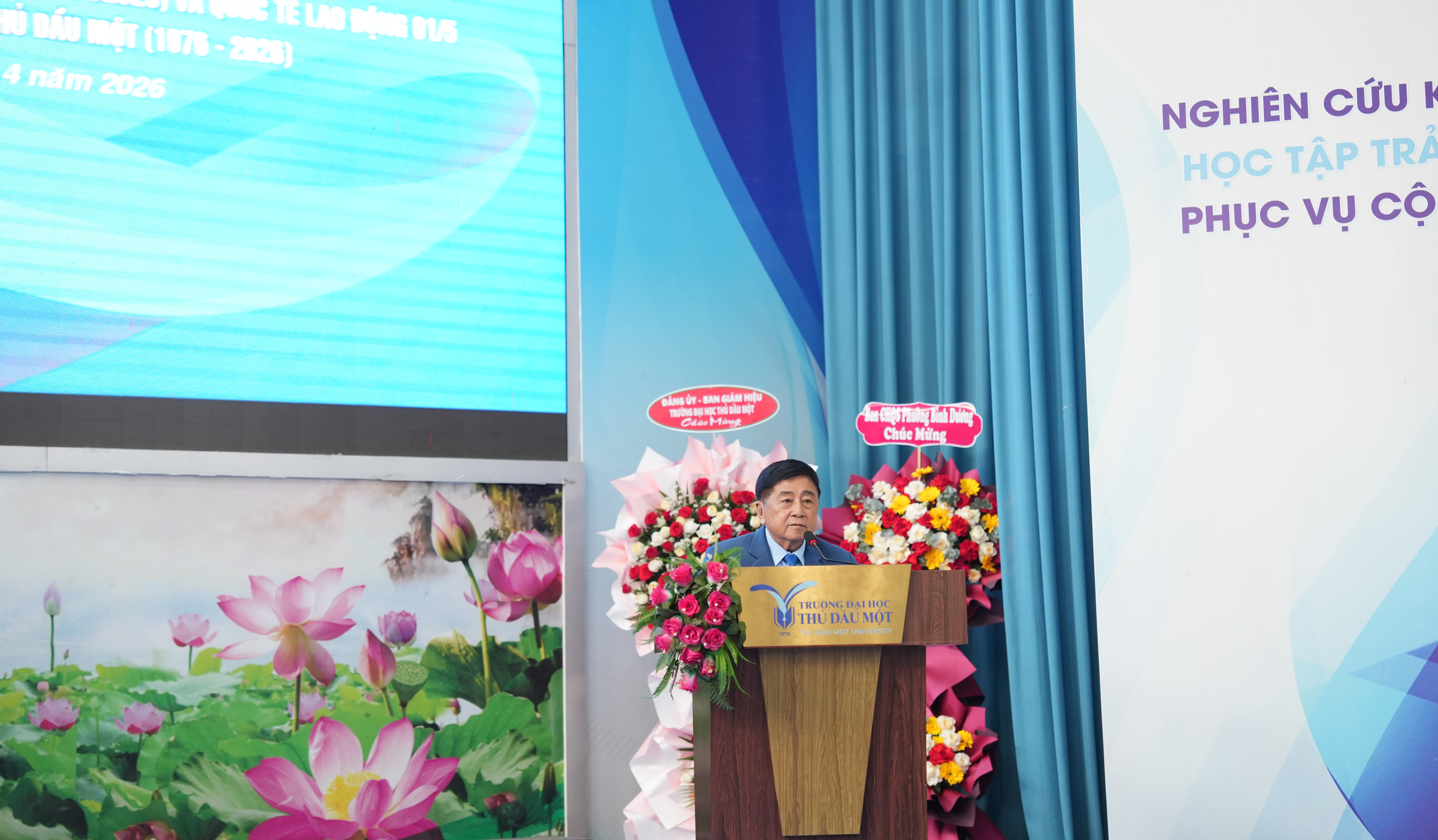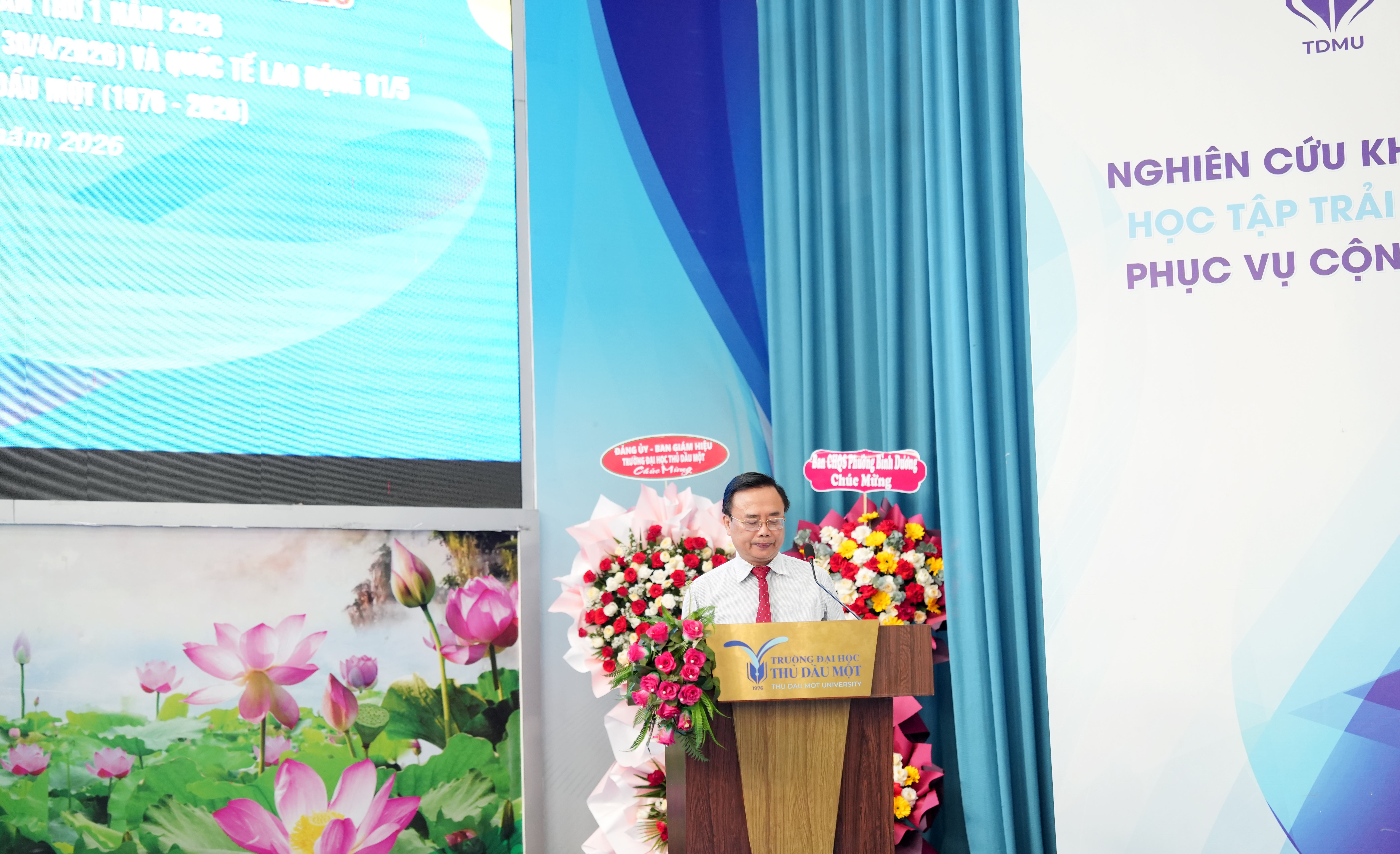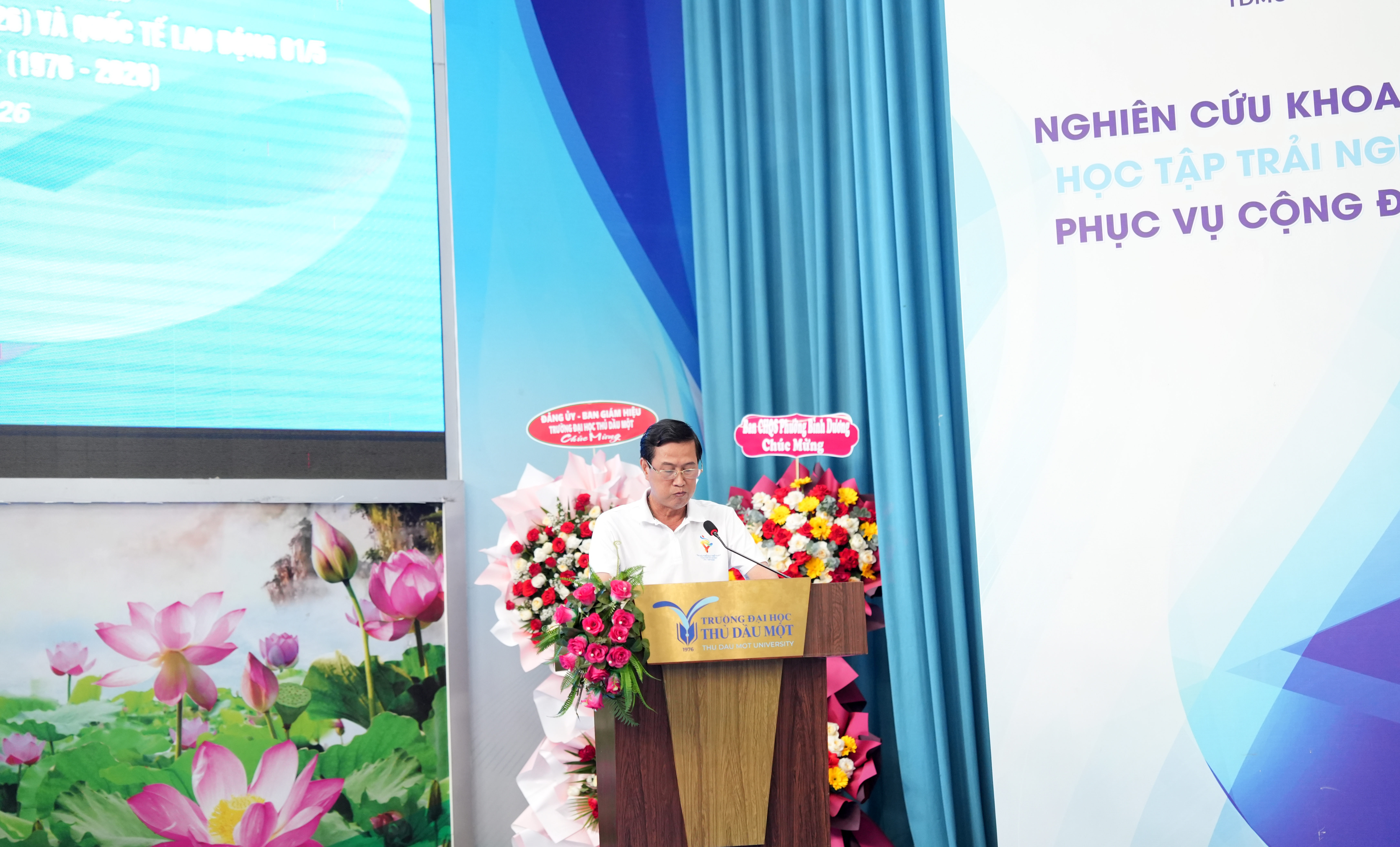 TS. Đoàn Ngọc Xuân – Hiệu trưởng Trường Đại học Thủ Dầu Một phát biểu chào mừng tại Liên hoan