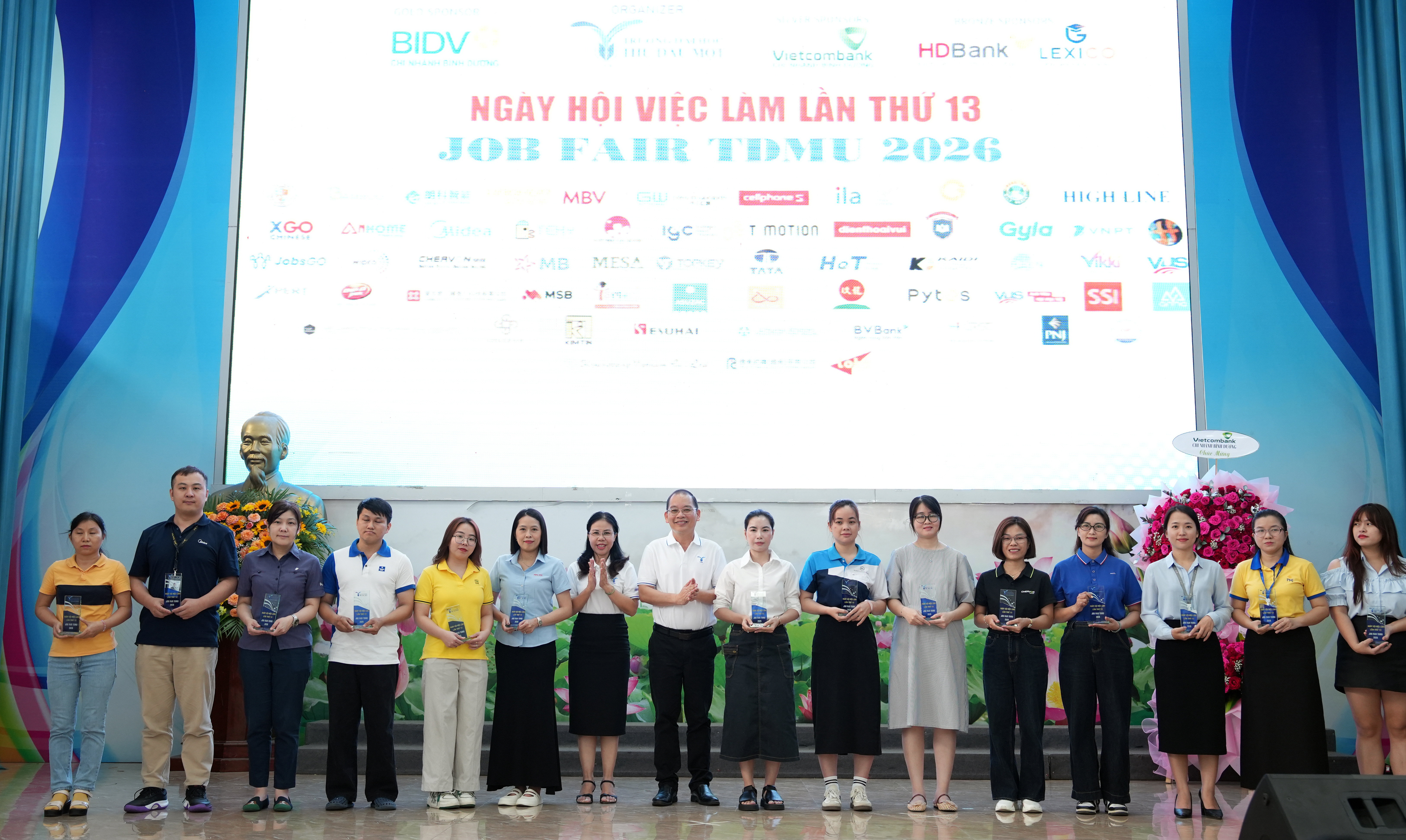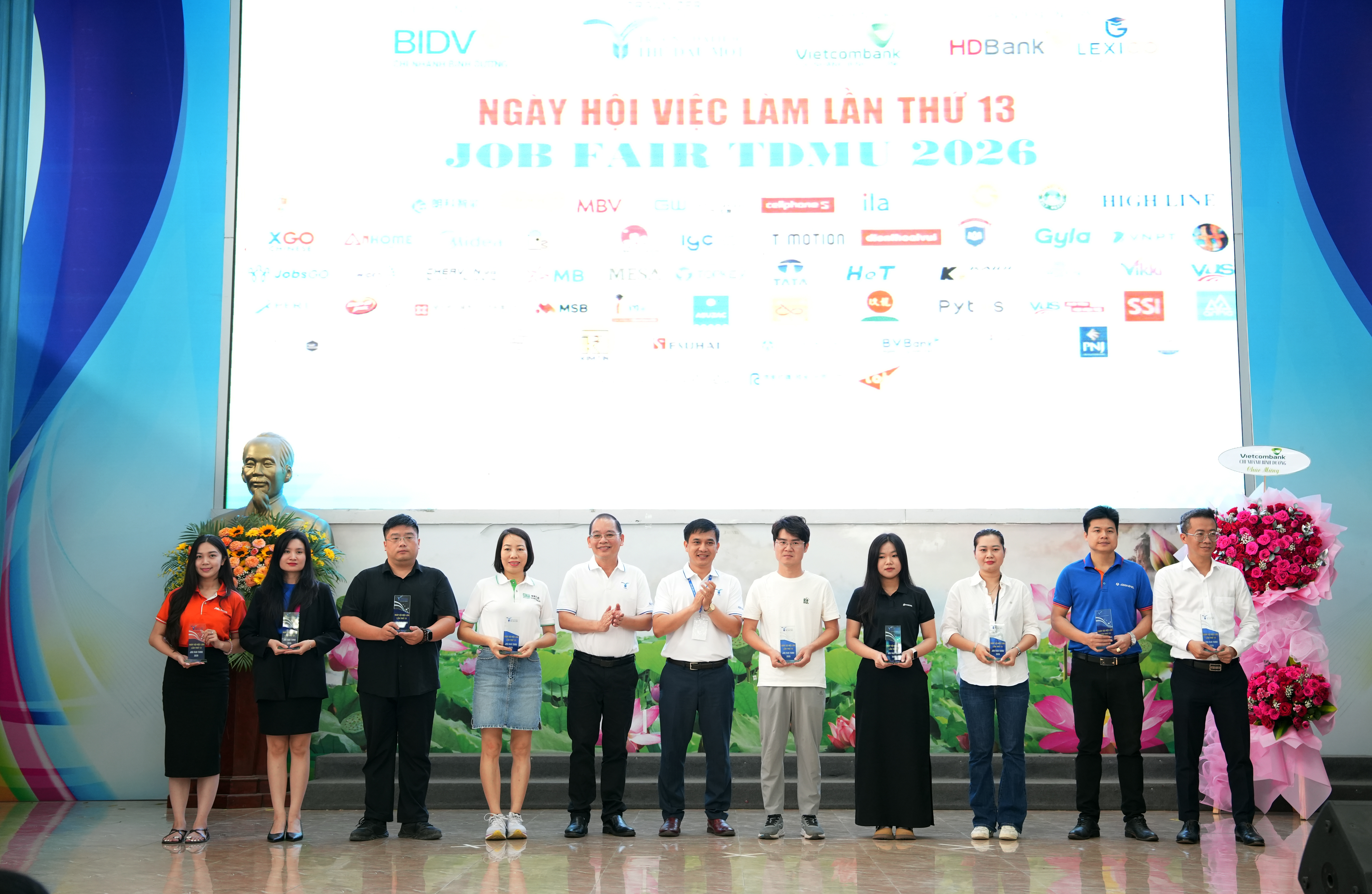 ThS. Trần Văn Nam - Phó Bí thư Đảng ủy và PGS.TS Ngô Hồng Điệp - Phó Hiệu trưởng trao kỷ niệm chương tri ân các doanh nghiệp tham gia Ngày hội việc làm TDMU 2026
