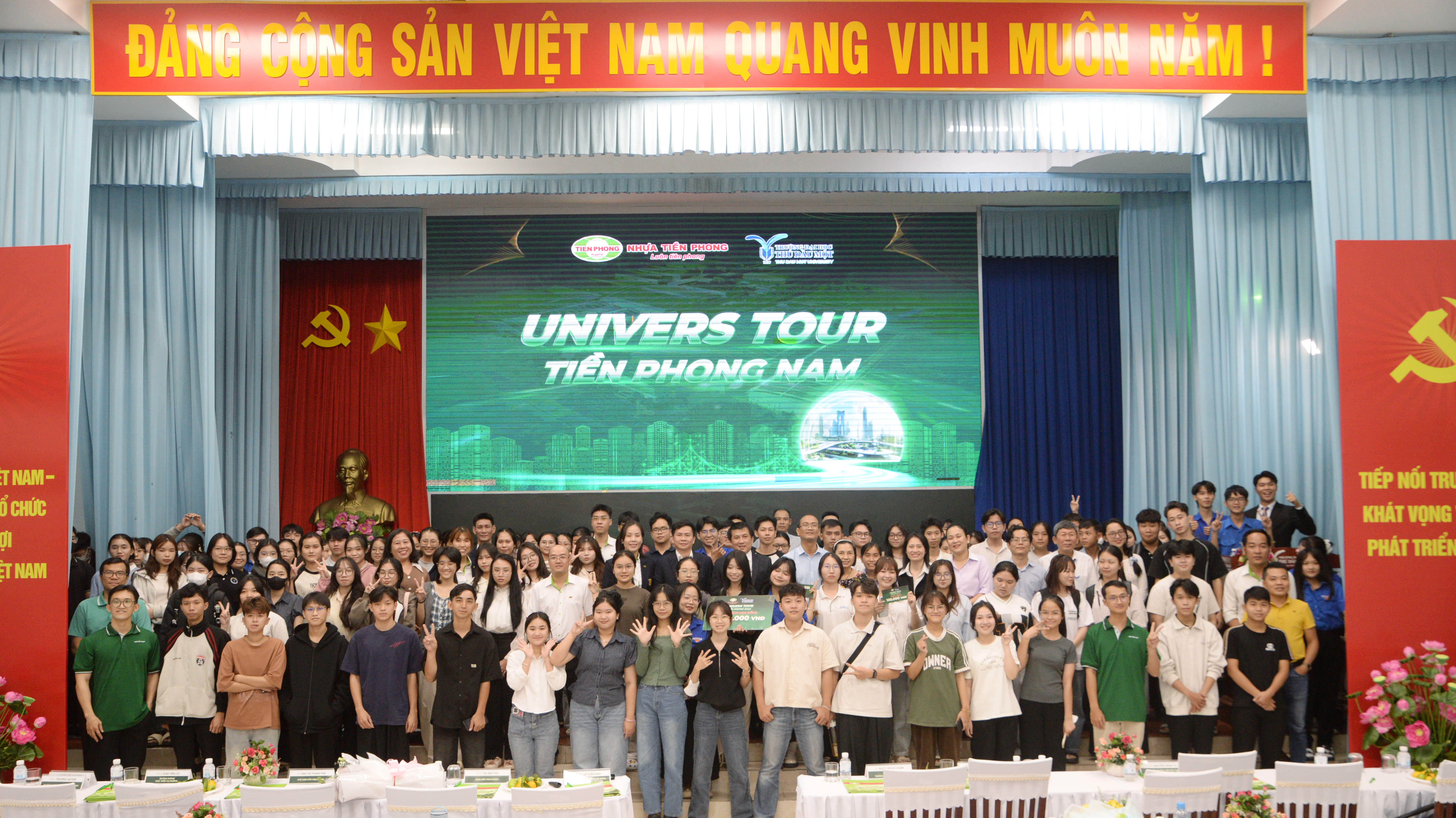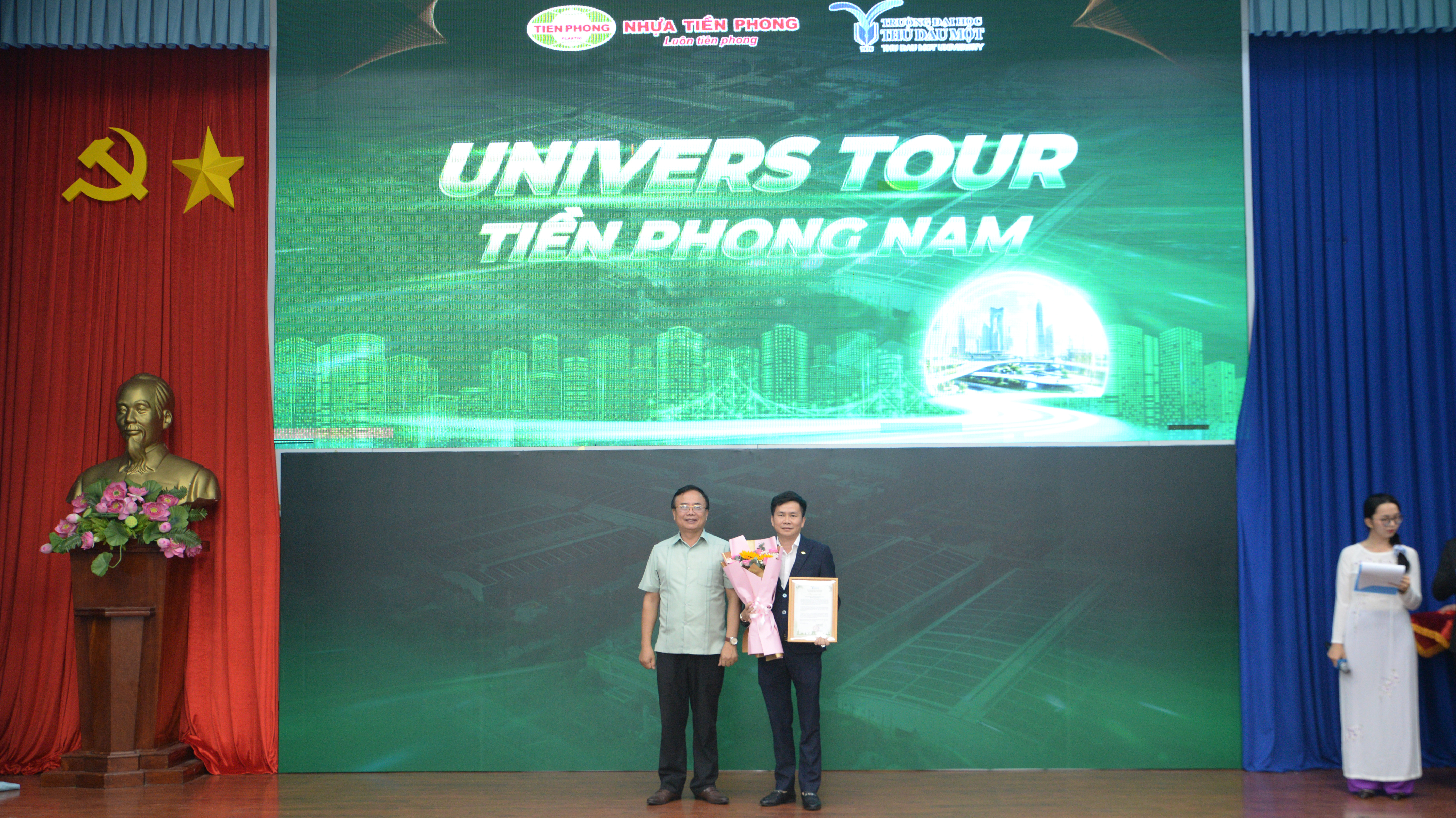 TS. Đoàn Ngọc Xuân – Hiệu trưởng Trường Đại học Thủ Dầu Một trao hoa và Thư cảm ơn đại diện Công ty Cổ phần Nhựa Thiếu niên Tiền Phong phía Nam vì sự đồng hành, hỗ trợ chương trình