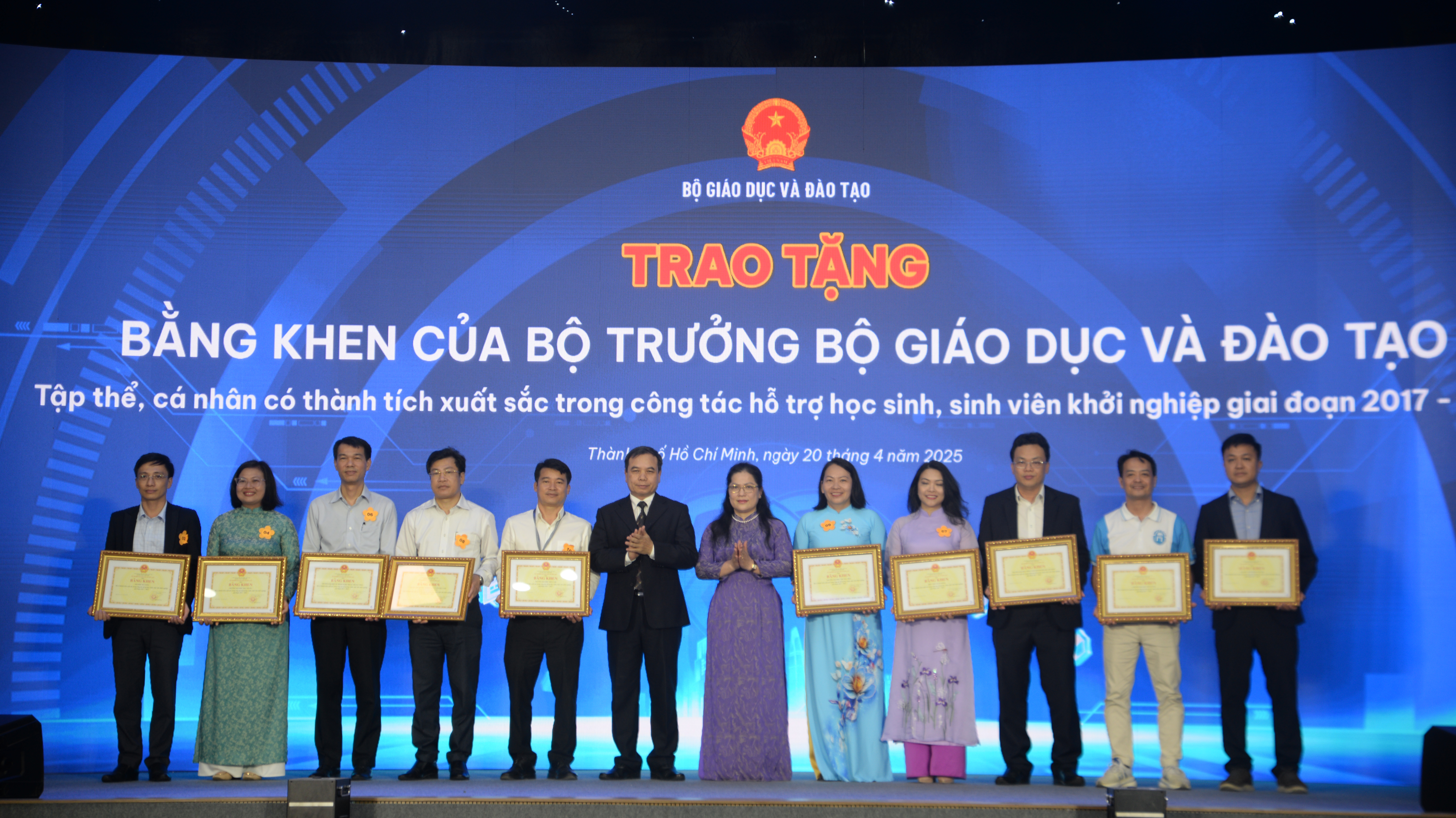 Trường Đại học Thủ Dầu Một đã vinh dự nhận Bằng khen của Bộ Giáo dục và Đào tạo vì đã có thành tích xuất sắc trong công tác hỗ trợ học sinh, sinh viên khởi nghiệp giai đoạn 2017 - 2025. Thay mặt Lãnh đạo trường, ThS. Trương Thị Thủy Tiên - Phó Giám đốc Trung tâm Dịch vụ, Hợp tác Doanh nghiệp và Khởi nghiệp (người mặc áo dài màu xanh đứng thứ 5 từ phải sang) nhận Bằng khen