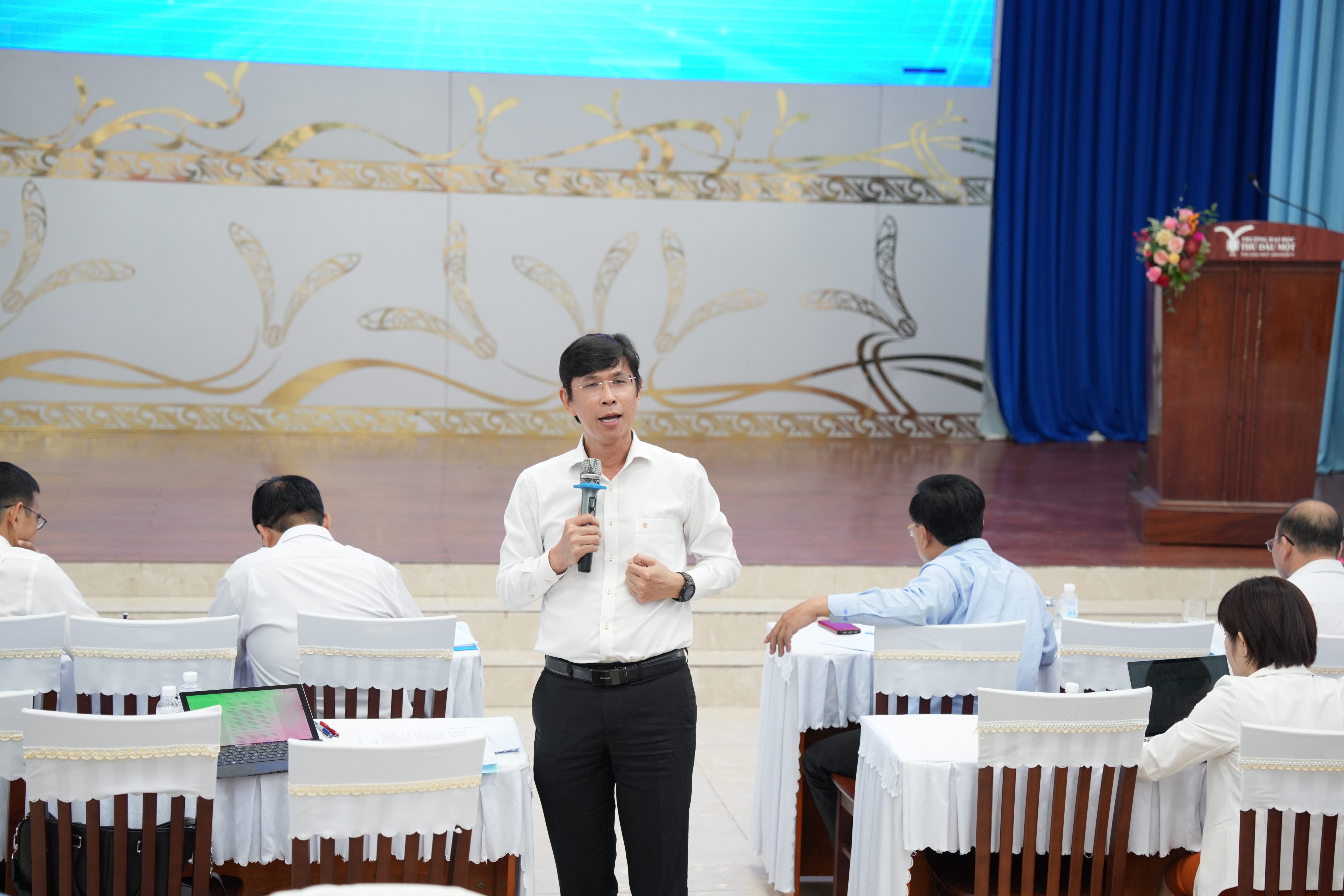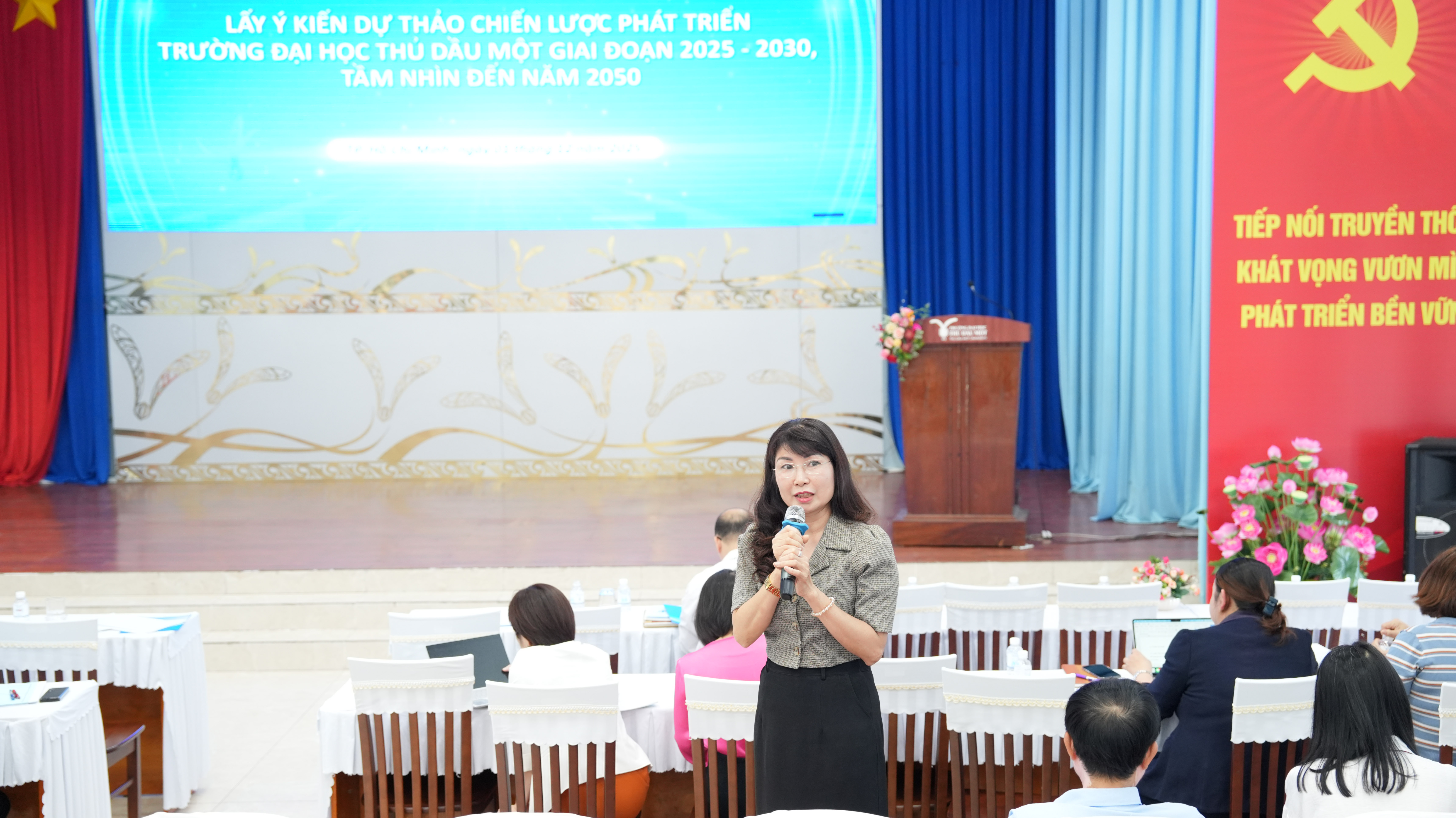 PGS.TS Ngô Hồng Điệp – Phó Hiệu trưởng trình bày báo cáo về các nội dung trọng tâm của Đề án Chiến lược phát triển Trường Đại học Thủ Dầu Một đến năm 2030, tầm nhìn đến năm 2050