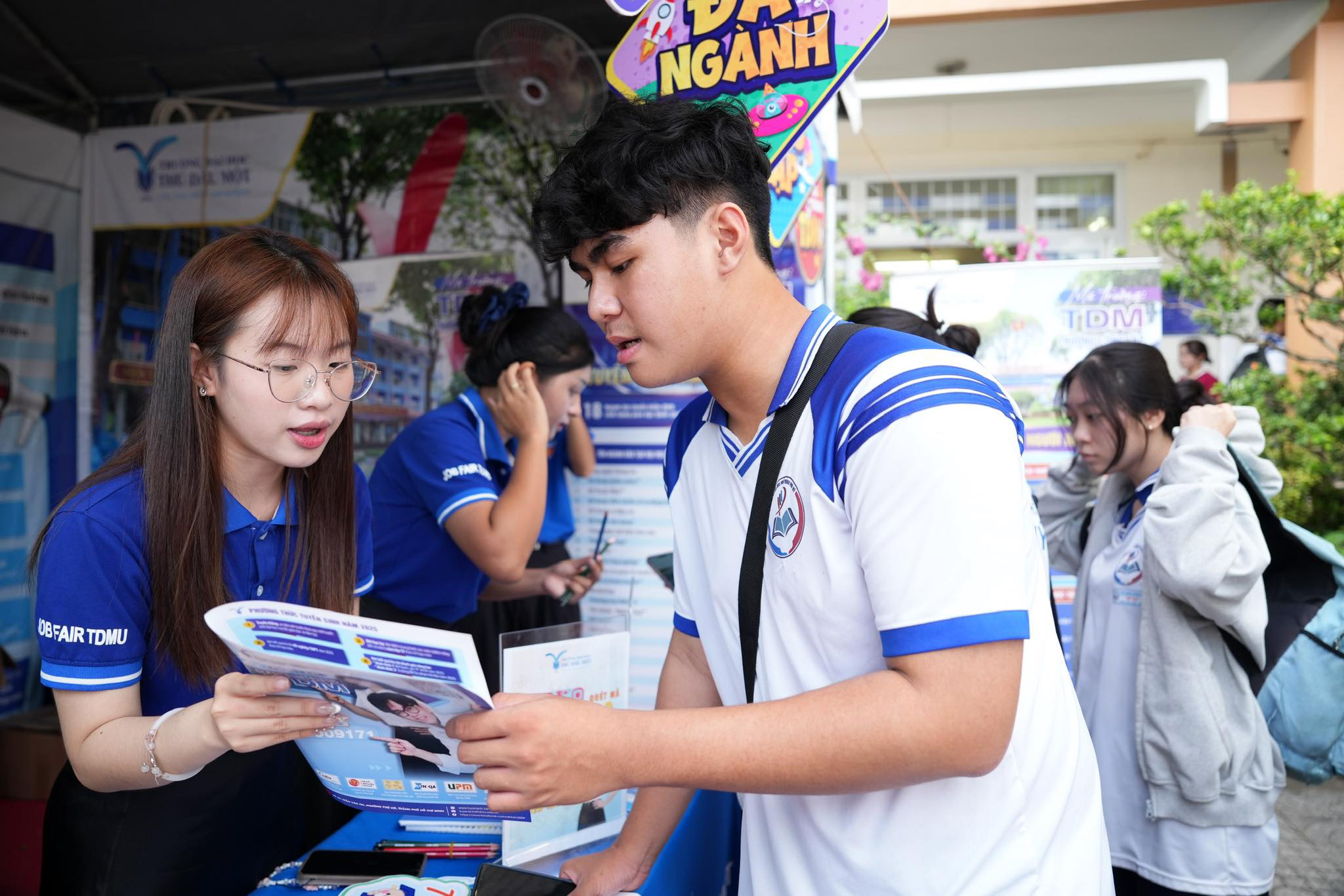 Tại gian tư vấn tuyển sinh của Trường Đại học Thủ Dầu Một, không khí diễn ra sôi nổi với nhiều hoạt động giao lưu, trao đổi trực tiếp giữa đoàn tư vấn và học sinh